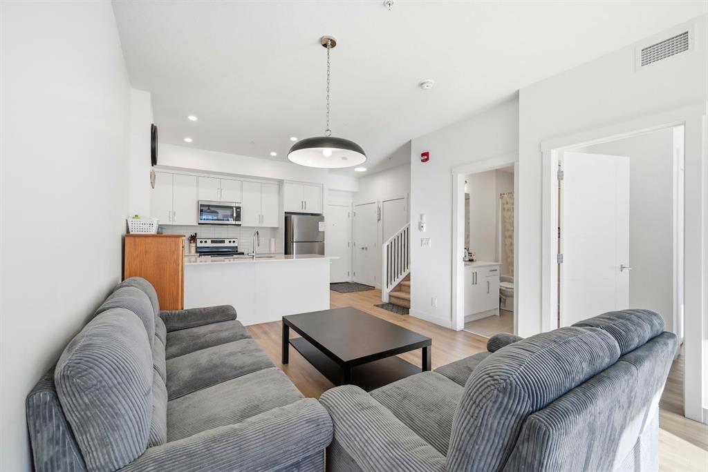 This well-maintained home offers a smart layout comfortable living througout. Upon entry, you are welcomed by a beautifully appointed kitchen to the right, featuring stainless steel appliances, elegant pot lights, and quality finishes throughout. Straight ahead, a spacious dining area provides the perfect setting for family gatherings and entertaining. The main floor also offers a generously sized bedroom and a 3-piece bathroom, ideal for guests or multi-generational living. This level further includes a comfortable sitting area with access to a private east-facing balcony, perfect for enjoying your morning coffee or relaxing in the evening. Elegant metal spindle railings add a modern architectural touch to the main floor, enhancing the overall aesthetic appeal. A convenient stackable laundry area completes this level. Upstairs, you will find a separate entrance leading to an expansive and inviting living area filled with natural light. The upper level features a well-appointed primary bedroom with a 4-piece ensuite that includes a standing shower. Just off the primary bedroom, step onto the rooftop patio, an exceptional outdoor space ideal for hosting summer gatherings or unwinding during peaceful evenings, while enjoying open east-facing views. Adding even more value, this townhome is situated above ground-floor commercial units, providing unmatched convenience right within the building. Enjoy immediate access to everyday essentials including a pizza shop, dayhome services, a barbershop, convenience store, and other local businesses, all just steps from your door. The location is highly desirable, with nearby schools, parks, pharmacies, grocery stores, dining options, and shopping amenities within close proximity. Minutes to Calgary International Airport, this property offers exceptional accessibility for frequent travelers and commuters alike. Everything you need is easily accessible, making this a truly ideal place to call home.