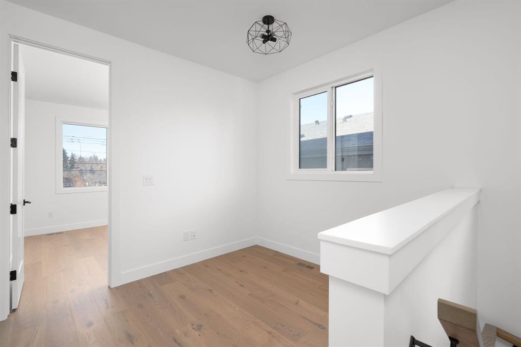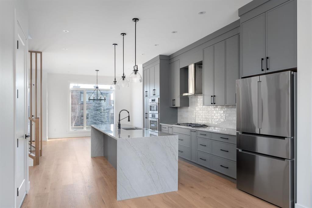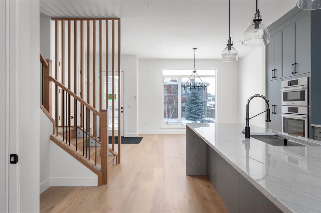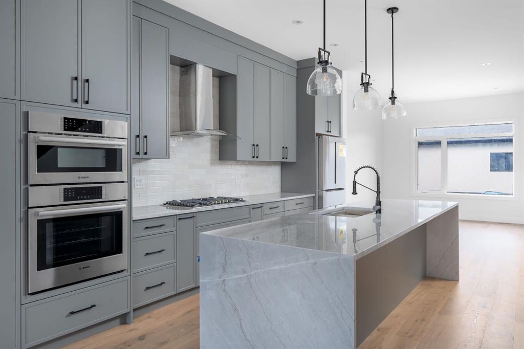 Welcome to The Killarney Collection in SW Calgary—thoughtfully crafted on a quiet street, this fully upgraded duplex infill offers a refined balance of scale, texture, and modern comfort. From the moment you arrive, the home makes a striking first impression with its sleek, contemporary exterior, pairing oversized triple-pane windows for abundant natural light with warm natural tones of metal cladding, stucco accents, and brick detailing. Inside, 10-foot main floor ceilings create a grand sense of arrival, setting the tone for the interior designer–curated colour palette carried throughout the home. Every detail has been intentionally explored, with the heart of the main floor anchored by a chef-inspired gourmet kitchen. Featuring a premium Bosch appliance package, fully custom-painted cabinetry, and an oversized waterfall granite island, the space effortlessly blends luxury with everyday functionality. A dedicated front dining room offers a warm setting for gatherings, while the rear living room provides a more intimate retreat, centered around a full feature-wall gas fireplace—perfect for evenings spent unwinding. Thoughtful storage solutions are seamlessly integrated, including built-ins at the entry and a fully custom mudroom at the rear, ensuring every inch of space is maximized. Ascending to the upper level, subtle design moments continue to impress, with a full wood feature wall, custom stair lighting, and luxury wide-plank hardwood flooring flowing continuously throughout both the main and upper levels for a seamless transition.The oversized primary bedroom is a true sanctuary, showcasing a vaulted and peaked ceiling design with expansive windows that welcome morning light. The spa-inspired ensuite features a dual vanity, an expansive full-tile shower, and a calming, private retreat. Two additional bedrooms offer generous proportions, each complete with custom closet built-ins. The upper-level laundry room maintains the home’s commitment to efficiency and design, offering full cabinetry, a folding counter, side-by-side washer and dryer, and a laundry sink. A versatile work-from-home alcove completes the upper floor, easily functioning as a den or secondary living space.The lower level further extends the home’s flexibility with an oversized 2-bedroom, 1-bath legal suite, centered around a spacious open kitchen—ideal for rental income, guests, or multi-generational living. A separate full laundry room, understair storage, and built-ins throughout each closet ensure the same level of thoughtful design continues below.Perfectly positioned close to inner-city Calgary, recreation centres, shopping, and public transit, this Killarney residence offers a timeless blend of form and function—designed to live beautifully today and adapt effortlessly for tomorrow.