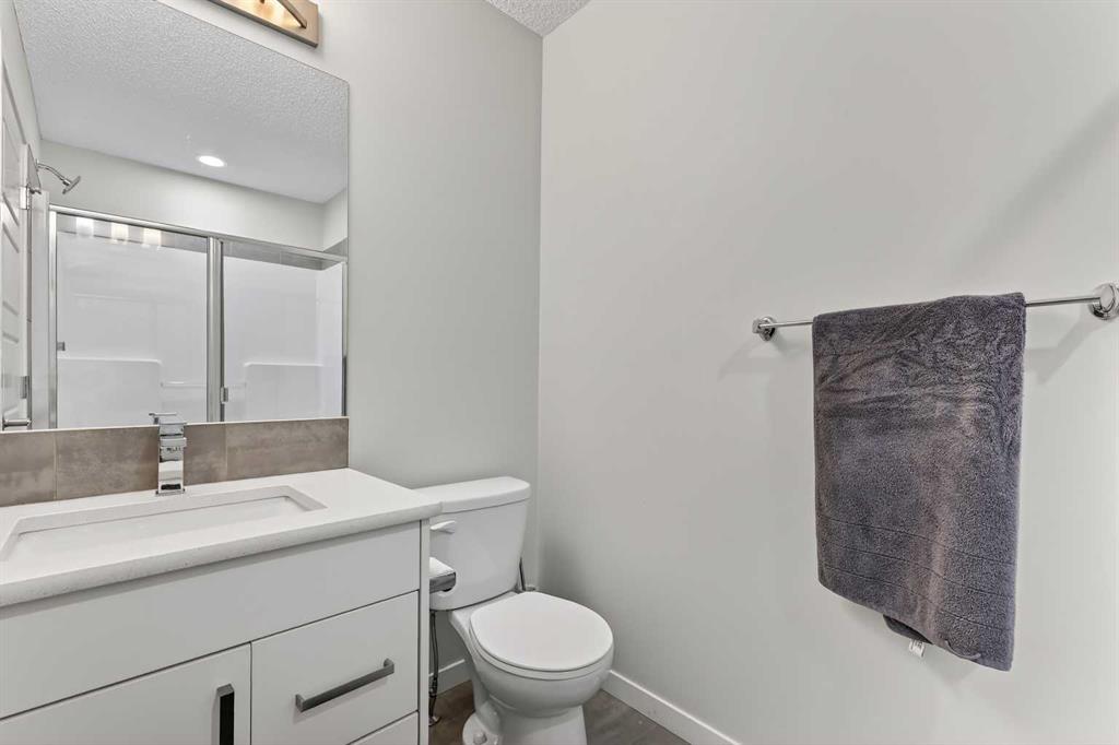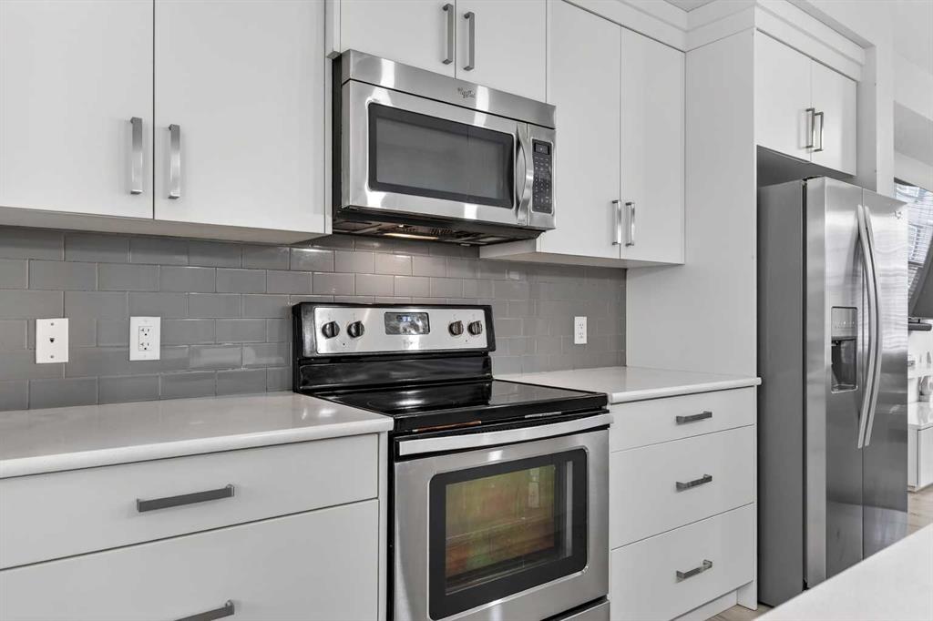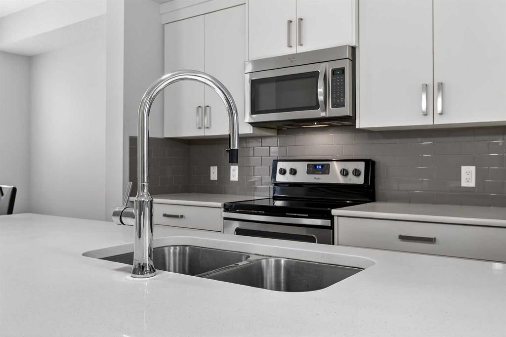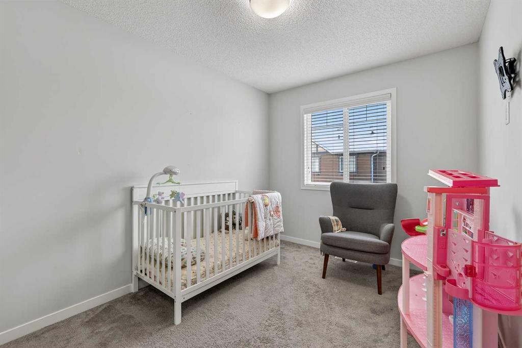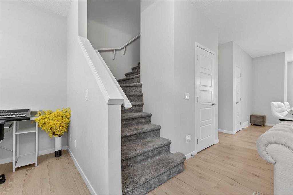 DOUBLE ATTACHED GARAGE with PARKING PAD, and green space. 1600 sq/ft TOWNHOME in the upscale community of New Brighton. The front patio area faces a sunny green space and walkway providing the perfect space for you to sit and relax. Upon entering you are greeted with a LARGE foyer with TONS of storage, a separate laundry room and access to your attached double garage with a full double driveway to allow for extra parking. Upstairs on the second level is a bright airy common space with lofty 9 FT CEILINGS. The spacious bright kitchen features white QUARTZ countertops, full upper cacbinets, a pantry and an OVERSIZED 10 FT ISLAND - perfect for entertaining! The dining area provides ample seating space. while the bright living room flows seamlessly onto the covered balcony with a gas line BBQ hookup. Adjacent to the living area, you'll find a handy office nook. A 2-piece guest bath adds extra convenience. Third level is the Master Bedroom with WALK-IN closet and 3 pce ENSUITE bathroom. Two additional Bedrooms and another 4pce bathroom complete the upstairs. Don't miss this opportunity to live in this beautiful area. This home has everything you or your young family needs. Close to Parks, Schools, South Trail Crossing Shopping, Transit, New Brighton Community Center and Athletic Park with Skating, Water Park, Tennis & more!