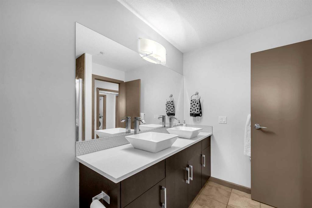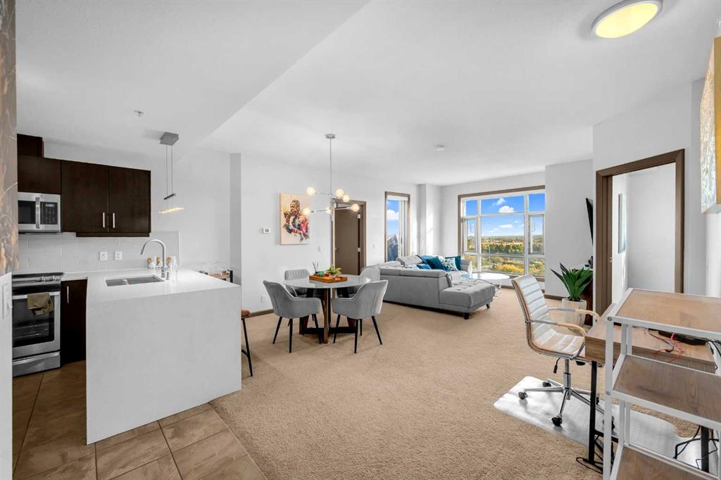 Discover this stunning upgraded and meticulously maintained 2-bedroom condo in the heart of downtown Calgary, featuring convenient central air conditioning for ultimate comfort year-round. Step inside to find a spacious and modern living environment with an open-concept layout that seamlessly connects the living room, dining area, and kitchen—perfectly designed for both everyday living and entertaining guests. With over 1,000 square feet of living space, high 9-foot ceilings, and generously sized bedrooms, this home provides a bright, airy, and welcoming atmosphere that feels both comfortable and luxurious. Every detail of this condo has been thoughtfully upgraded to create a sleek and contemporary space. The kitchen boasts beautiful white quartz countertops that extend throughout, complemented by a matching white backsplash, stainless steel appliances, and stylish designer lighting fixtures. The bathrooms feature elegant vanities, with the primary ensuite including a dual sink for added convenience. The overall aesthetic is modern and refined, with quality finishes that elevate the living experience. The primary bedroom is a true retreat, offering breathtaking south-facing vistas of the Rocky Mountains and spectacular sunsets. Natural sunlight streams in throughout the day, enhancing the sense of space and tranquility. The large walk-through closet is equipped with custom organizers, providing ample storage and easy access. The luxurious primary ensuite features a spacious 4-piece layout, making it an ideal sanctuary for relaxation and privacy. The second bedroom is equally spacious and private, complete with its own 4-piece ensuite and generous closet space, making it perfect for guests, family, or a home office. Say goodbye to laundry-day hassles with the oversized laundry room, outfitted with side-by-side washer and dryer. This generous space also offers abundant storage for linens, cleaning supplies, or seasonal items, helping keep your home organized and clutter-free. Additional features include an underground titled parking stall and a large underground storage locker, ensuring your vehicles and belongings are safe and easily accessible. The Vetro building itself offers an exceptional lifestyle with a wide array of premium amenities. Enjoy 24/7 security and a dedicated concierge team, along with a state-of-the-art fitness center and a stylish party room—all perfect for relaxing or entertaining guests. Residents also have access to a communal outdoor patio, theatre room, and plenty of underground visitor parking for friends and family. Located just steps from Stampede Park and the vibrant core of downtown Calgary, this condo offers unbeatable convenience and lifestyle options. Whether you're heading to a game, exploring nearby restaurants and shops, or enjoying outdoor parks and walking trails, everything is within easy reach. Experience the best of downtown living in a beautifully upgraded, stylish, and functional home at Vetro.