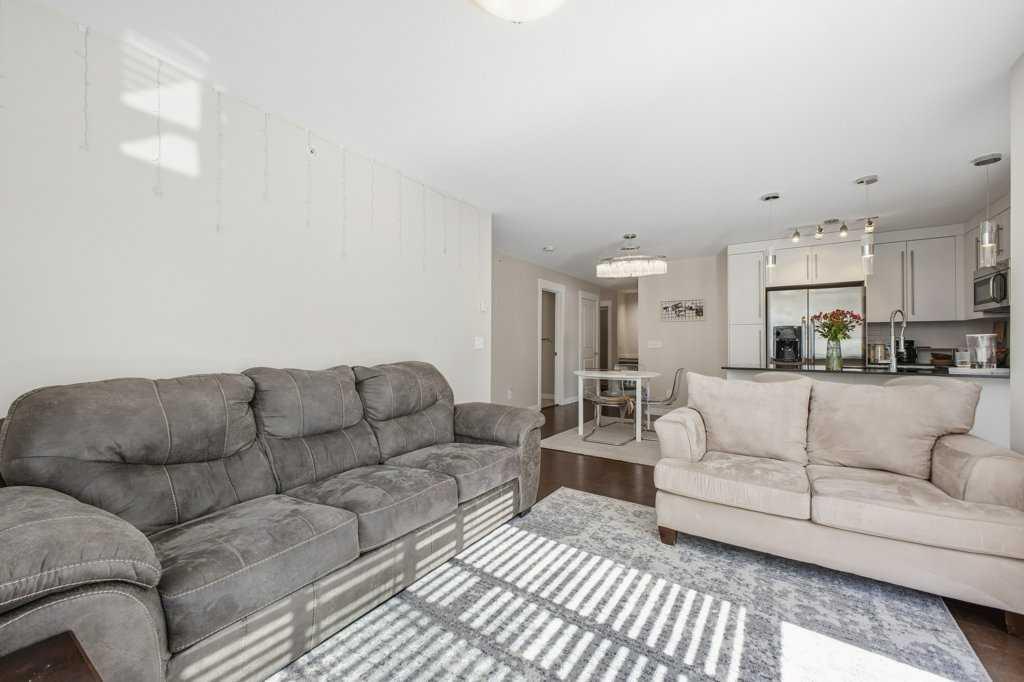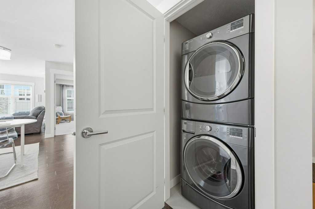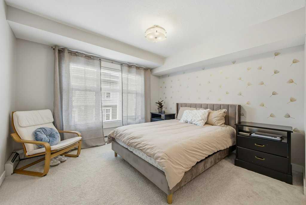 This is a top-floor corner unit and that matters. No one above you, no noise from the hallway on two sides, and windows wrapping the south, southeast, and southwest. Natural light from morning through evening. It's one of the quieter positions in the building, and one of the larger floor plans available. The living room is generous for a condo this size. There's room for a proper sofa, a coffee table, and still space to move around. The cork flooring runs through the main living areas. It's softer underfoot than hardwood and keeps the space feeling warm. This isn't a unit where you feel like you're living in a box. The corner layout gives you that extra breathing room that most condos in this price range just don't have. The kitchen sits open to the living and dining area with no walls cutting it off and no awkward transition. Upgraded appliances, a microwave hood fan above the stove, good counter space, and enough cabinetry to actually store things. The layout is practical and the flow makes sense whether you're cooking for one or having people over. There's also a built-in desk just off the kitchen area, It keeps a workspace tucked in without eating up a whole room. The dining area sits between the kitchen and the living room, big enough for a full table and chairs, with natural light coming in from multiple directions. Morning coffee here with the south sun coming through is a pretty good way to start a day. The primary bedroom comfortably fits a king bed with nightstands on both sides and still leaves you room to move. Dual closets mean storage isn't an issue. The 4-piece ensuite is off the primary and well-sized. It's your own bathroom, private to the bedroom, which matters when you have guests or a roommate using the second bath. The second bedroom is also a solid size, fits a queen easily, and works just as well as a home office or flex space if you don't need the second bedroom full time. It has direct access to the second full 4-piece bathroom in the hall. In-suite laundry is included, washer and dryer in the unit. Step out onto the south-facing balcony. You've got south and west exposure, which means afternoon and evening sun. One titled, heated underground parking stall is included. Assigned storage locker also included, separate from the unit, on the parkade level. Condo fees cover heat, water. Electricity is the only utility you're paying separately. Outside the front door, you're in Mahogany, one of the few lake communities in Calgary where the lake access is actually good. Residents get two beaches, the Beach House, tennis courts, a skating rink in winter, and over 35 km of pathways that wind through the wetlands. It's a community where people actually use the amenities. Seton is a short drive with a grocery store, restaurants, coffee shops, a Cineplex, and South Health Campus all within a few minutes. Deerfoot and Stoney Trail are both easily accessible.