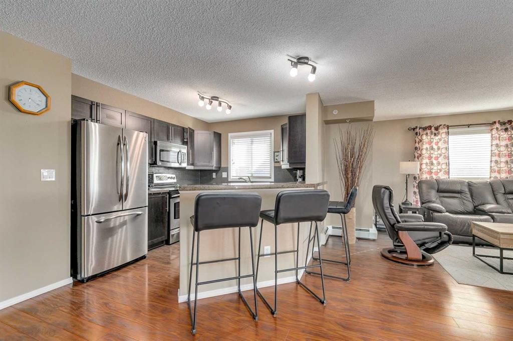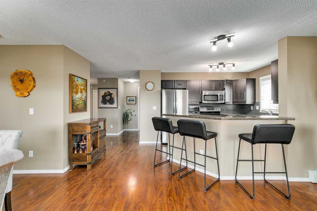 TOP FLOOR | CORNER UNIT | 2 TITLED PARKING STALLS | EXTRA-LARGE STORAGE UNIT | 1,184.80 SQ. FT. OF STYLISH LIVING. Sunlight fills every room of this beautifully designed top-floor corner unit, creating a bright and welcoming space you’ll love coming home to. Step onto your private balcony to enjoy peaceful mornings with coffee or take in the golden hues of the evening sky as the trees change color. Inside, the thoughtful layout offers 2 spacious bedrooms, 2 full bathrooms, and a dedicated office nook—perfect for working from home or keeping life organized. At the heart of the home is a gourmet kitchen that combines style and function, featuring rich granite countertops, stainless steel appliances, undermount lighting, a full pantry, and generous prep space. Whether you’re cooking a quick breakfast or hosting dinner with friends, this kitchen makes it easy to do it all with flair. Other highlights include gleaming laminate floors, attractive built-ins in every closet, and convenient in-suite laundry room with extra space for a stand up freezer. The primary suite offers a true retreat with a large walk-in closet and elegant ensuite, while the second bedroom and full bath are ideal for guests. Practical touches include easy access to the elevator, two titled, heated underground parking stalls—side by side and right next to the elevator—plus one of the largest storage units in the building. All utilities and the HOA fee are included in the condo fee, making for one simple monthly payment. Living here means enjoying everything Panorama Hills has to offer—endless pathways, parks, and playgrounds right outside your door. You’ll have access to the Panorama Hills Community Centre for year-round activities, and you’re just minutes from Country Hills Golf Club, Vivo Rec Centre, great schools, shopping, dining, and theatres.