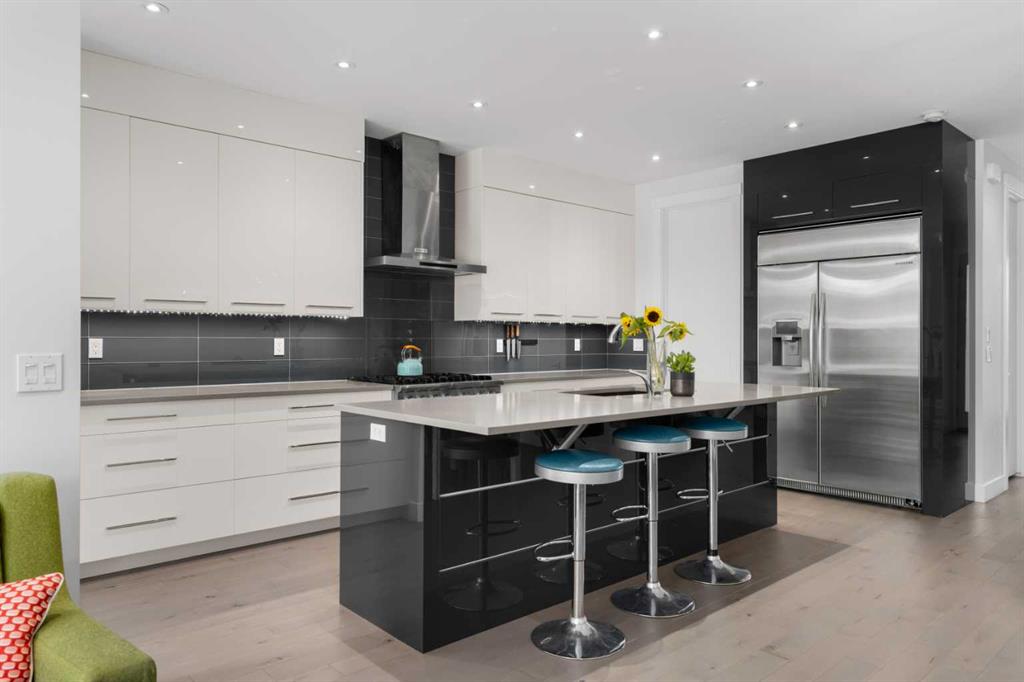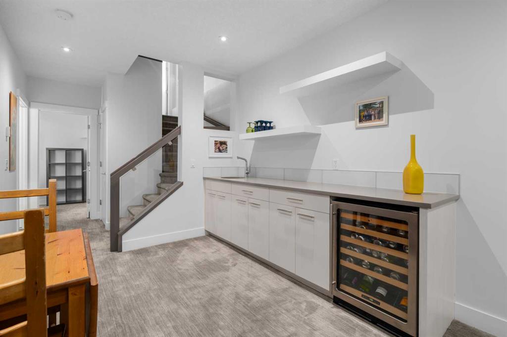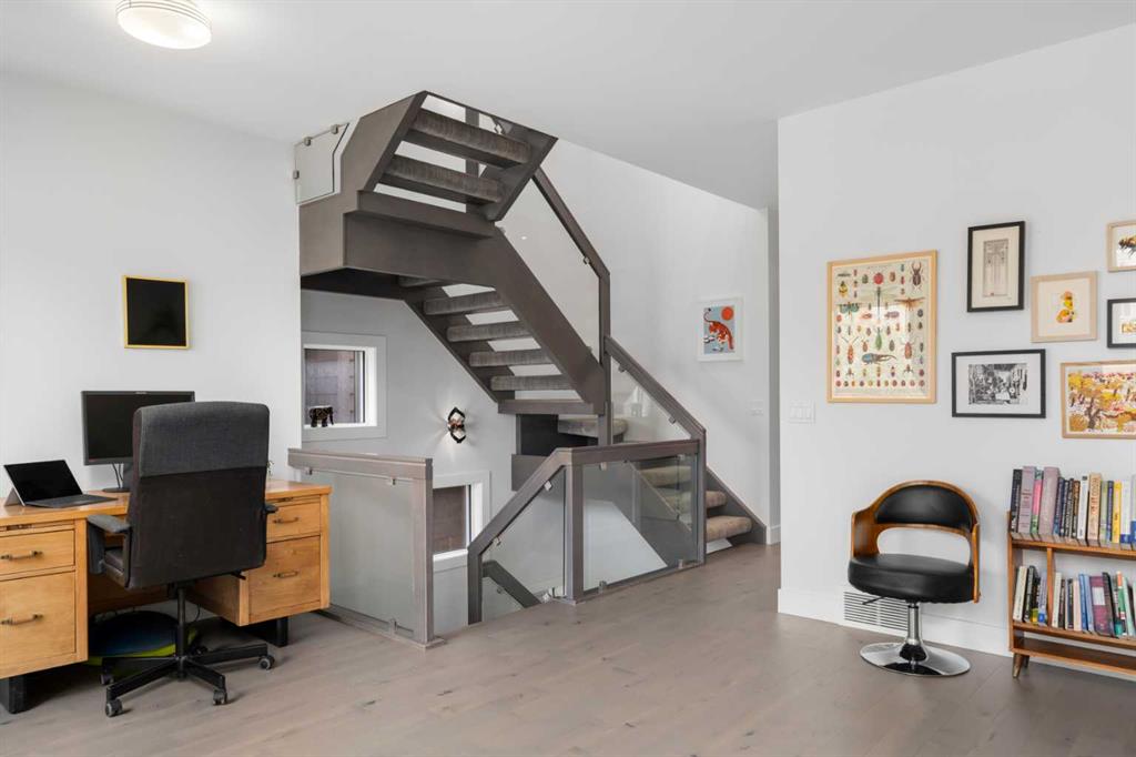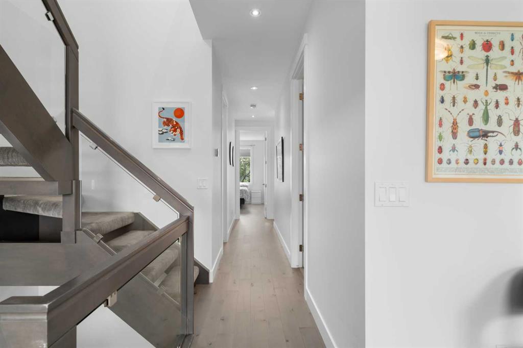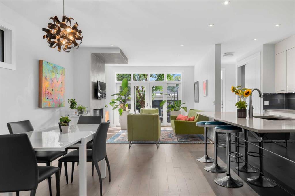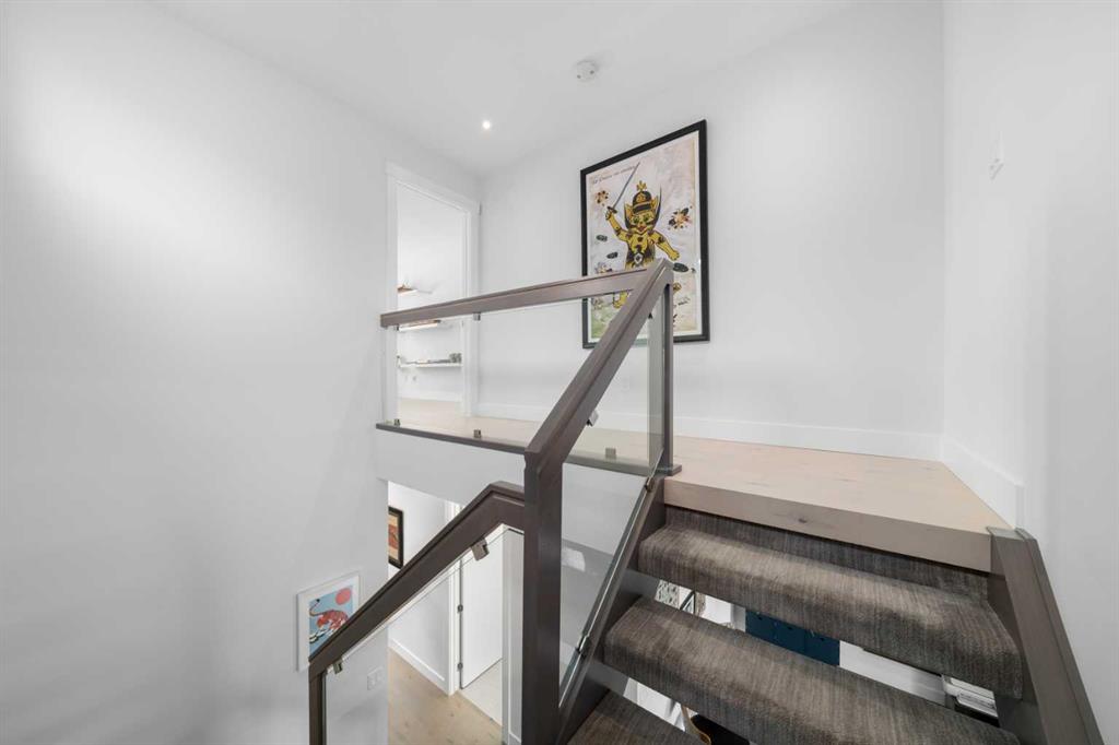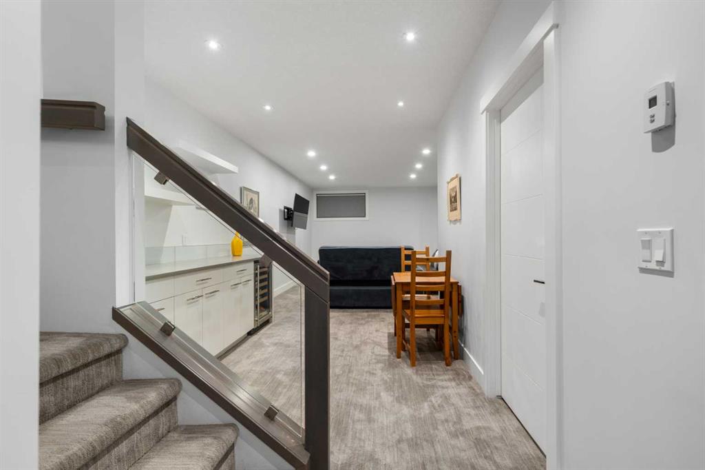 This stunning home is situated on a 25x125 south-facing lot in the heart of desirable Marda Loop, this extensively upgraded 3-storey semi-detached home offers over 3,500 sq. ft. of air-conditioned living space. Designed with style and functionality in mind, this property is just a short walk to trendy 33rd Ave, and a quick drive or bike ride to River Park, Sandy Beach, and the Elbow River. The main floor boasts 10’ ceilings, wide plank engineered oak hardwood, and a bright open layout. The chef-inspired kitchen features an expansive island, quartz countertops, modern custom cabinetry, walk-in pantry, Viking 6-burner gas stove with chimney hood fan, built-in stainless steel appliances, and a Samsung double door fridge. A spacious dining area, front family room, stylish powder room, and a light-filled living room with floor-to-ceiling windows, gas fireplace, rear mudroom and French doors to the deck and backyard complete this level. Upstairs, the 2nd floor offers a bonus room, two bedrooms (one with private ensuite), a 4-piece bath, and a full laundry room with sink and cabinetry. The entire 3rd floor is a private primary retreat with a large bedroom with blackout blinds, private balcony with views, a dream walk-in closet with custom organizers and drawers, and a spa-like ensuite with heated floors, dual vanity, soaker tub, and custom glass steam shower with rain head and bench. The fully finished basement features radiant in-floor heating, a large rec room, home gym with rubber flooring, wet bar with beverage fridge, 4th bedroom with walk-in closet, and a 3-piece bathroom. Other highlights include: custom lighting, open riser staircase with glass panels, Hunter Douglas blinds, CAT5E wiring, zoned A/C, water softener, 75-gallon hot water tank, tankless water heater, and on-demand hot water. Enjoy the south-facing backyard with large deck, turf green space, concrete walkway, and a double detached garage. With excellent walkability, quick access to Crowchild Trail, and all the amenities of Marda Loop at your doorstep, this property truly is the total package.
