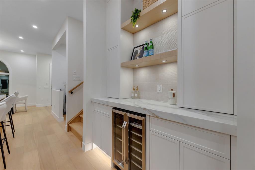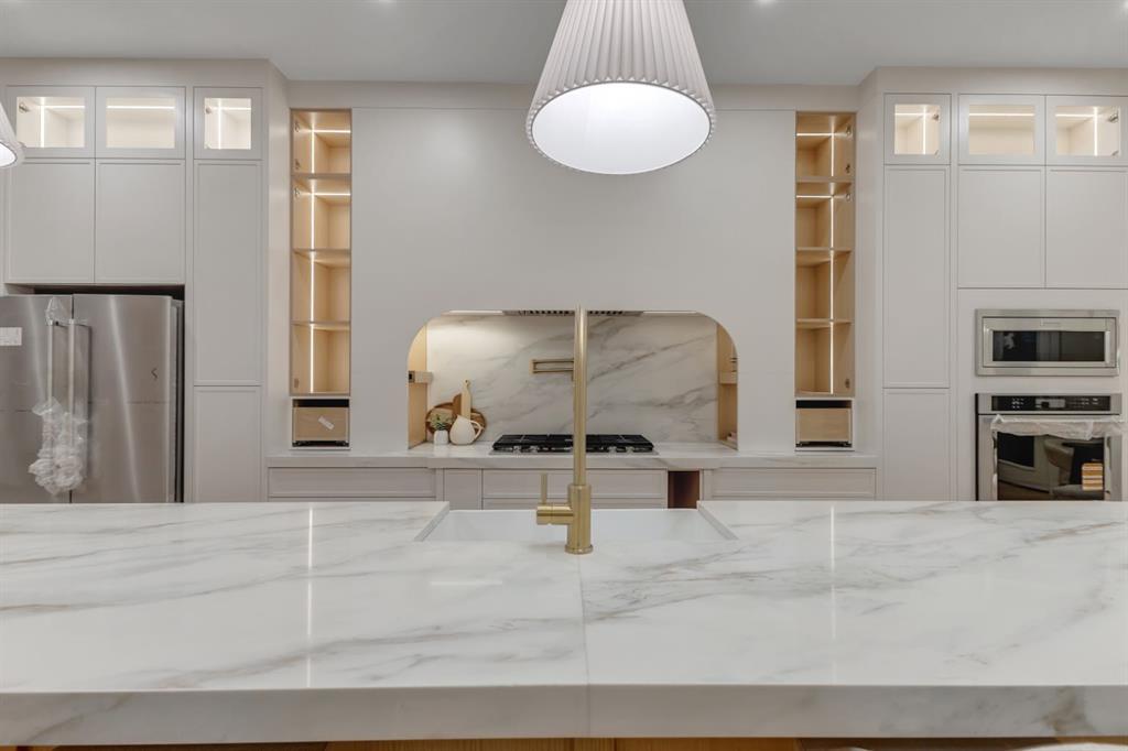 One Unit Remaining! Elegant French Chateau-Style Duplex in Richmond | Over 3,200 Sq Ft | Oversized Garage. Step into timeless sophistication with this beautifully crafted French chateau-inspired duplex, ideally located in the prestigious community of Richmond. Boasting over 3,100 sq ft of luxurious living space, this residence seamlessly blends classic charm with modern comfort. Engineered wood flooring flows throughout the main and upper levels, setting the tone for the refined finishes found throughout the home. Upstairs, you'll find three generously sized bedrooms, each complete with walk-in closets and private ensuites.. The stunning 5-piece primary ensuite is a true retreat, offering heated floors, a steam shower, a free-standing tub, a double vanity with a custom tower, and recessed lighting to create a spa-like atmosphere. The main floor is thoughtfully designed for both work and relaxation, featuring a convenient pocket office, a chef-inspired kitchen with a massive 15-foot island and high-end Kitchen Aid appliances, and an inviting living room centered around a cozy gas fireplace. A stylish mudroom with built-in cabinetry leads to the powder room and out to your private backyard through large patio doors. The fully finished basement offers a wet bar, bedroom with a 3 pc bathroom along with a huge rec area. Situated on a rare 135-foot deep lot, the backyard is generously sized—perfect for outdoor entertaining—and complemented by a double oversized garage for added convenience. This is a one-of-a-kind home that perfectly balances elegance, comfort, and versatility in one of Calgary’s most sought-after neighbourhoods.