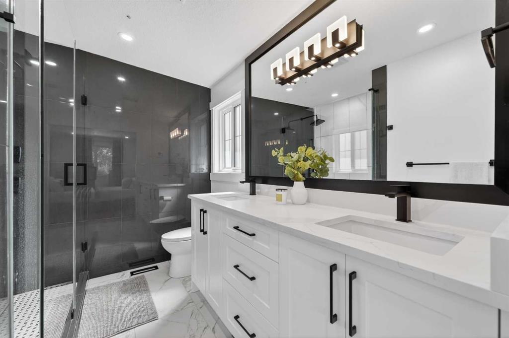 Fall in love the moment you walk through the front door. This beautifully renovated 1,340 sq. ft. bungalow ( 2,600 sq. ft. of total living space) is perfectly situated on a quiet, tree-lined street in sought-after Silver Springs. Fully renovated to the studs in 2022, this stunning home blends modern style with everyday comfort—ideal for family living and entertaining. Flooded with natural light, the main living area showcases expansive windows and a modern gas fireplace with a natural stone surround. The Living Room space flows effortlessly into a spacious dining area and a stunning chef-inspired kitchen featuring quartz countertops, a statement oversized island, abundant cabinetry, and sleek stainless-steel appliances. Step out to the large deck overlooking the generous backyard—perfect for summer gatherings. The main floor also boasts gorgeous hardwood flooring and feature walls throughout. Enter the luxurious primary suite complete with a walk-in closet and a spa-like ensuite boasting dual vanities and an impressive freestanding shower. Two additional well-sized bedrooms and a beautifully appointed 4-piece bathroom complete the main level. The fully developed lower level is designed for both relaxation and entertaining, offering a huge family room with a custom-built bar and a stunning fireplace feature that adds warmth and style. Two additional bedrooms—both with egress windows—provide flexibility for family or guests, along with an absolutely gorgeous 4-piece bathroom. A laundry room with sink and ample storage complete the space. Additional renovation features included all new windows, a high-efficiency furnace, updated new plumbing and electrical (panel and wiring), a 50-gallon hot water tank, and a new stucco exterior—offering peace of mind for years to come. Ideally located close to schools, shopping, and transit, plus Botanical Gardens, scenic walking paths, off-leash parks, and access to the Bow River. Perfect for families or empty nesters—this home is truly move-in ready. Just unpack and enjoy!