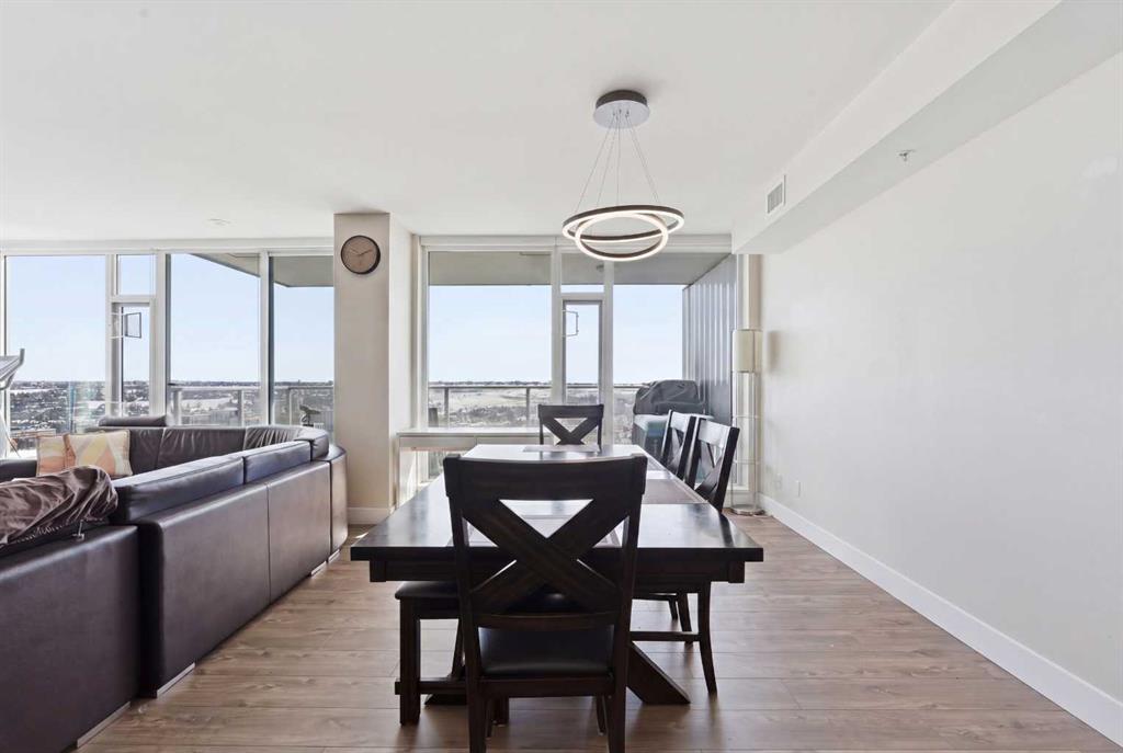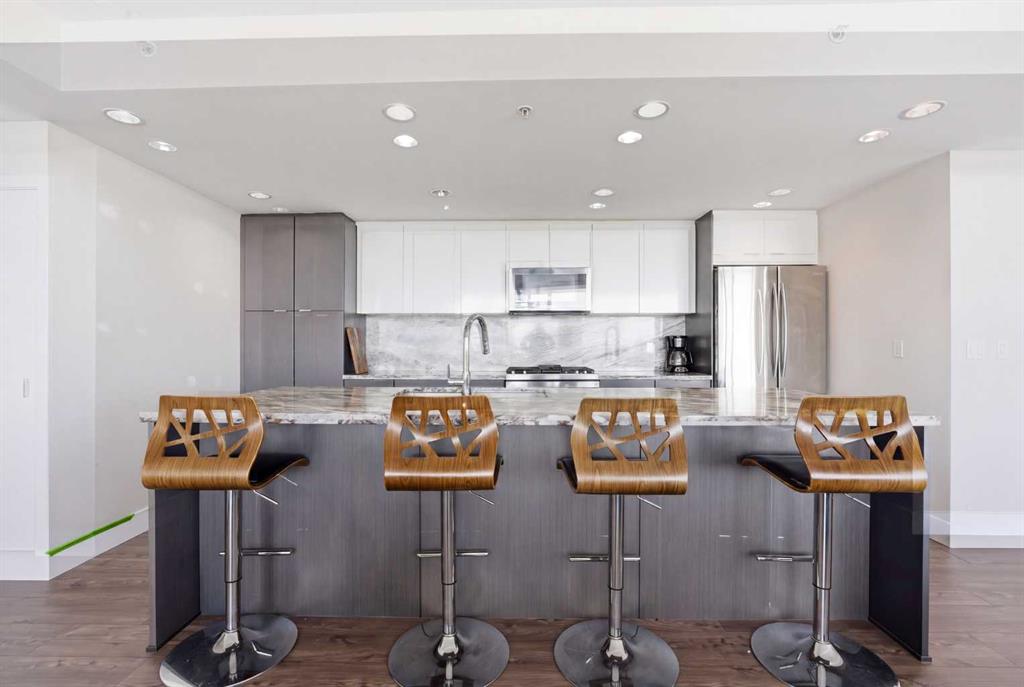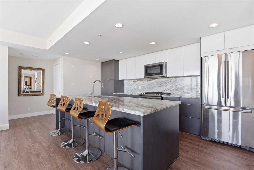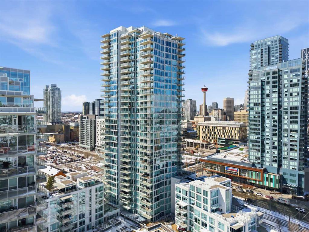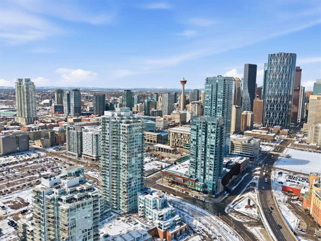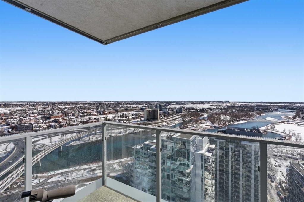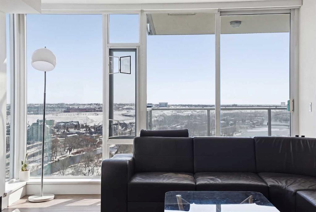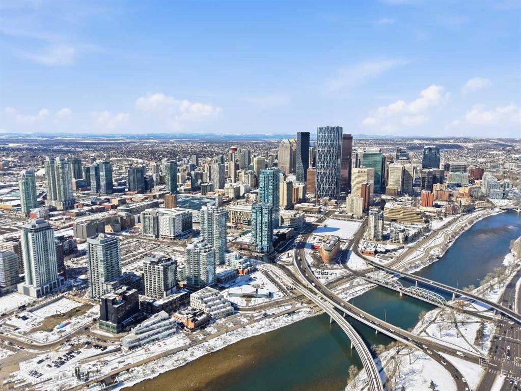 Exceptional and stunning three-view panorama from the 27th floor, showcasing the Mountain, Bow River, and Downtown skyline. This luxurious, generously proportioned two-bedroom, two-bath residence offers an open-concept 1,200+ SF of living space with floor-to-ceiling glass that reveals dramatic vistas throughout the day. The morning sun pours through the east-facing, air-conditioned suite, waking a generous living-dining space that flows into a gourmet kitchen—granite island and backsplash gleaming beside a pantry and top-tier stainless steel appliances, including a five-burner gas stove and under-cabinet lighting. A master retreat awaits with a walk-in closet and a five-piece ensuite warmed by in-floor heating, while a second bedroom offers in-floor heating and convenient laundry with a second bath. This is one of the tower’s largest units, with tandem underground parking for two and extra storage. Beyond the walls, the building invites: a gym, steam room, sauna, and a social lounge with a kitchen; a second-level terrace and rooftop garden for al fresco gatherings; 24-hour concierge and ample visitor parking. Step outside to riverfront strolls, parks, C-Train access, a library, Superstore, and a chef’s lineup of dining options. An expansive 140+ SF east-facing balcony frames panoramic views, redefining downtown luxury living at its finest. A Schedule "A" must accompany all offers to purchase.