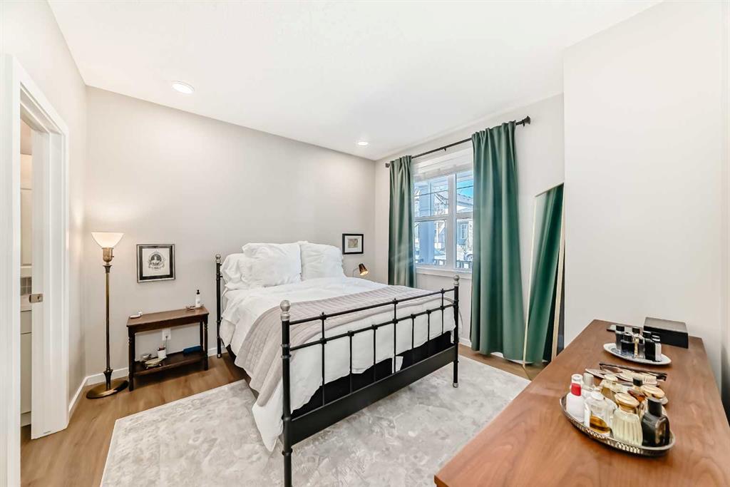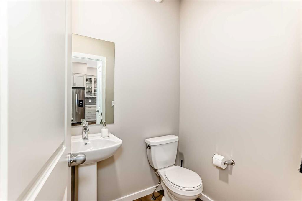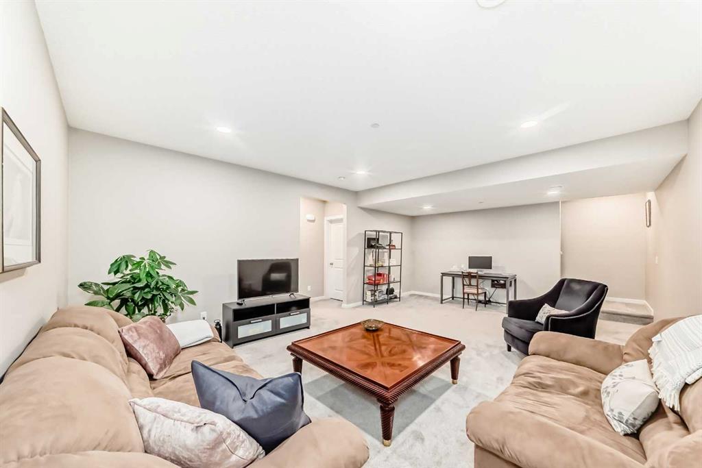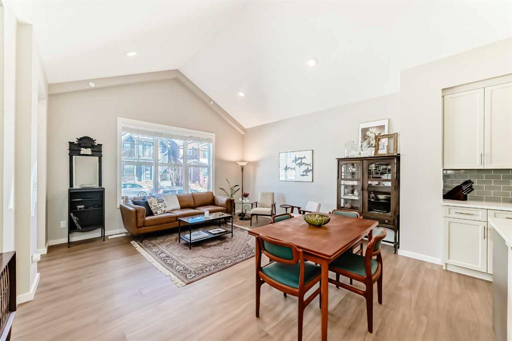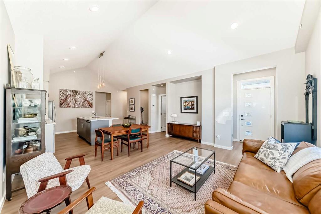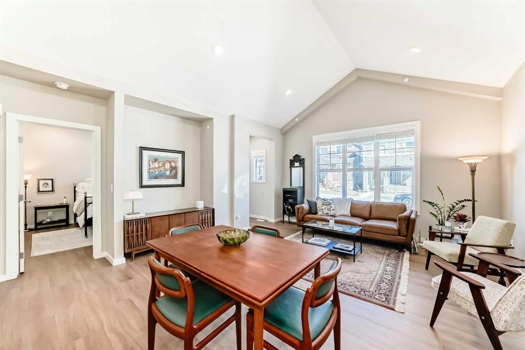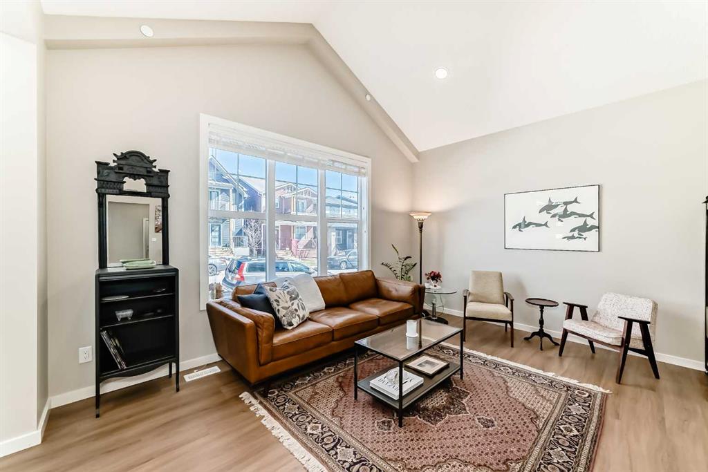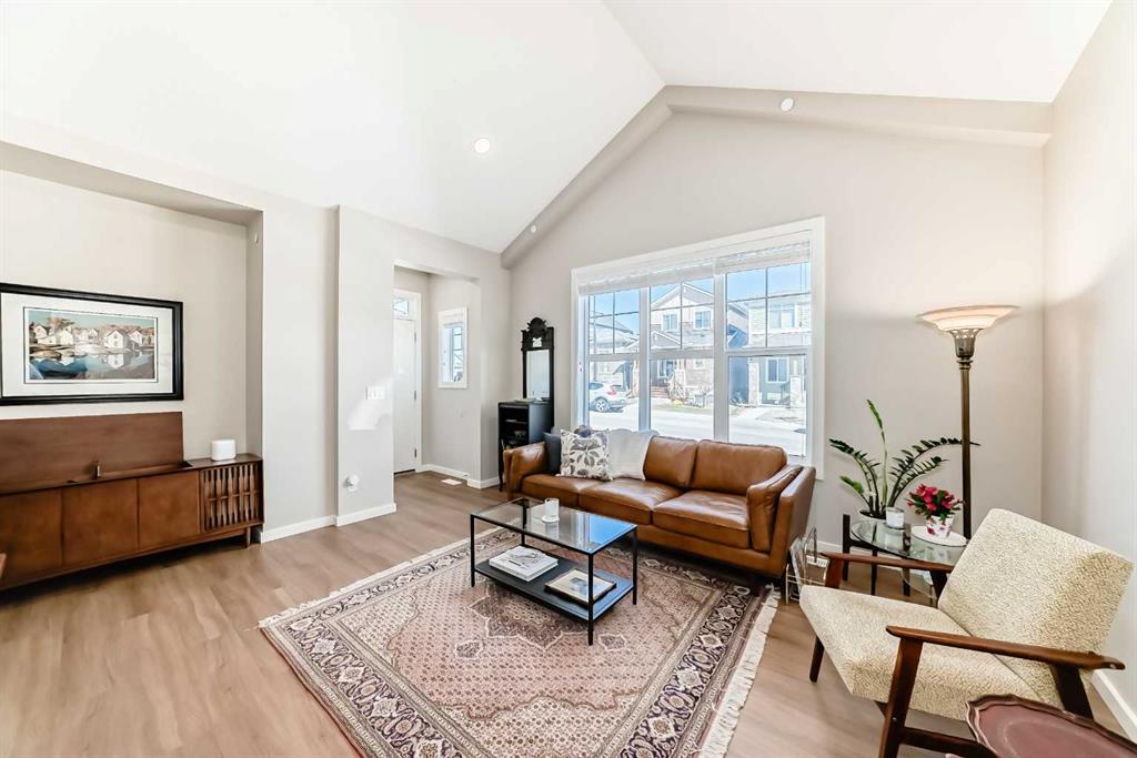 Welcome to this lovely townhouse bungalow in the desirable community of Livingston. This stunning home offers over 1800 sq ft of living space, all professionally developed by the builder. The home features grand vaulted ceilings throughout the living, dining and kitchen area, luxury vinyl plank flooring and upgraded stainless steel appliances. The spacious living room features a large window that allows in plenty of natural light. The expansive kitchen features upgraded two-tone cabinetry, a large island with breakfast bar and an adjacent dining area. The home offers a main floor den currently being used as a pantry. Relax in the spacious primary bedroom with a luxurious ensuite bathroom featuring an upgraded walk-in shower with glass enclosure and a large walk-in closet. A conveniently located powder room, closet, mud room and door to access the single car garage, completes the main floor. The lower level features 9 foot ceilings, spacious family room with enough extra space for a home office, a large second bedroom with a walk-in closet, a four piece bathroom and a laundry/utility room. Enjoy living in the community of Livingston with nearby shopping, restaurants and easy access to public transit stops and Stoney Trail.