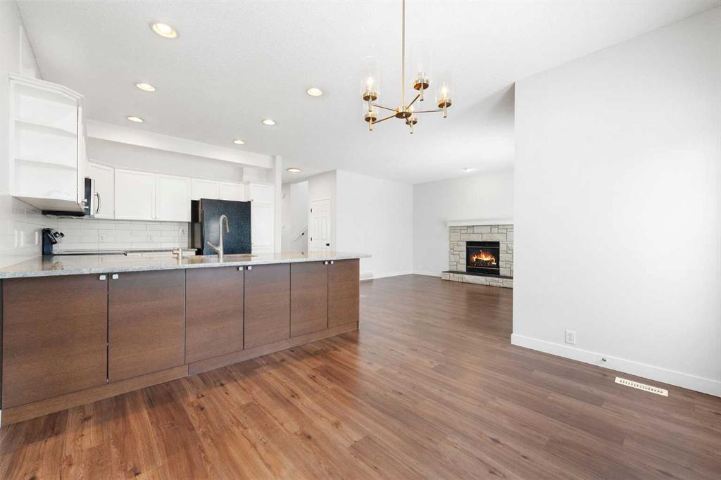 Beautifully updated and fully developed 2-storey home located on a quiet cul-de-sac in The Landing. This inviting property features a charming front veranda and a bright open-concept main floor with wide-plank laminate flooring throughout. Just off the entry is a front office with French doors, leading to a spacious family room with a stone-surround gas fireplace. The kitchen is well-appointed with granite countertops, a large seating bar, stainless steel appliances, white cabinetry with pot drawers, and excellent natural light. The dining area offers direct access to the large back deck, paved patio, and private fenced yard ideal for outdoor living. The detached insulated double garage is gas-fitted for a future heater. The upper level includes a window seat on the landing, a generous primary bedroom with a 4-piece ensuite and walk-in closet, two additional bedrooms, a 4-piece bathroom, and convenient upper-level laundry. The fully developed lower level provides a substantial recreation/games area, flex room, 3-piece bath, and ample storage. Additional features include air conditioning, a water softener, a reverse osmosis system, and updated shingles. This move-in-ready home offers exceptional value and is located in a fantastic family-friendly community.