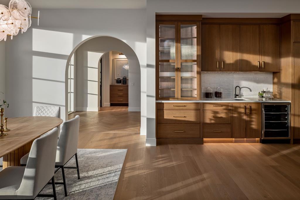 OPEN HOUSES Sat Feb 14th 12-3PM & 4-6PM! Homes on this exclusive ridge rarely come to market, and this breathtaking two-storey estate is a shining example of elevated inner-city living. With 5,545.89 sq.ft. of exquisitely developed space, this 6 bedroom, 5.5 bath residence blends refined craftsmanship with functional luxury; set against a backdrop of sweeping valley and park views. Step inside to soaring ceilings, pristine engineered hardwood floors, and custom archway details that frame each thoughtfully designed space. The heart of the home begins in the sunlit dining area, perfect for hosting epic dinner parties, and highlighted by west-facing triple-glazed LUX windows. The adjacent chef’s kitchen impresses with stainless steel integrated appliances, including a Wolf gas cooktop, double wall ovens, classic white shaker cabinetry, and a hidden butler’s pantry for discreet prep and storage. The expansive great room invites relaxation with vaulted ceilings and a cozy microcement faced gas fireplace, opening directly to a sunny south-facing deck overlooking endless green space. A main floor guest suite (or executive office) with a private ensuite, a designer powder room, and a spacious mudroom with built-ins complete this level. The fully insulated triple car garage is EV-ready and lift-kit friendly, marrying form and function. Upstairs, a serene primary retreat features elegant vaulted ceilings, a custom walk-in closet, and a spa-inspired 5-piece ensuite with a soaker tub, dual vanities, and a glass shower with bench and niche. Three additional bedrooms (one with an ensuite), an upper laundry room with sink and storage, and a charming library nook provide comfort and convenience for the entire family. The fully developed basement is an entertainer’s dream: featuring a large media lounge, games area, wet bar with brick backsplash and undermount lighting, and a high calibre wine room that secretly accesses the highly systemized maintenance room. A versatile home gym, sixth bedroom with walk-in closet, and additional full bathroom on this level ensure guests feel at home. Noteworthy highlights include: Hydronic in-floor heat in the basement; 2 High-Efficiency furnaces & A/C units; built-in speakers throughout; and quartz countertops in all bathrooms. Located minutes from the University of Calgary, Foothills Hospital, and local shops and restaurants, this timeless home sits in a top-tier school catchment and offers quick access to major routes while maintaining a tranquil, park-like setting. A truly unique opportunity to own a well-appointed, move-in ready home in one of the city’s most prestigious enclaves.