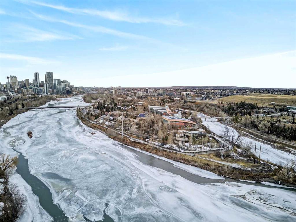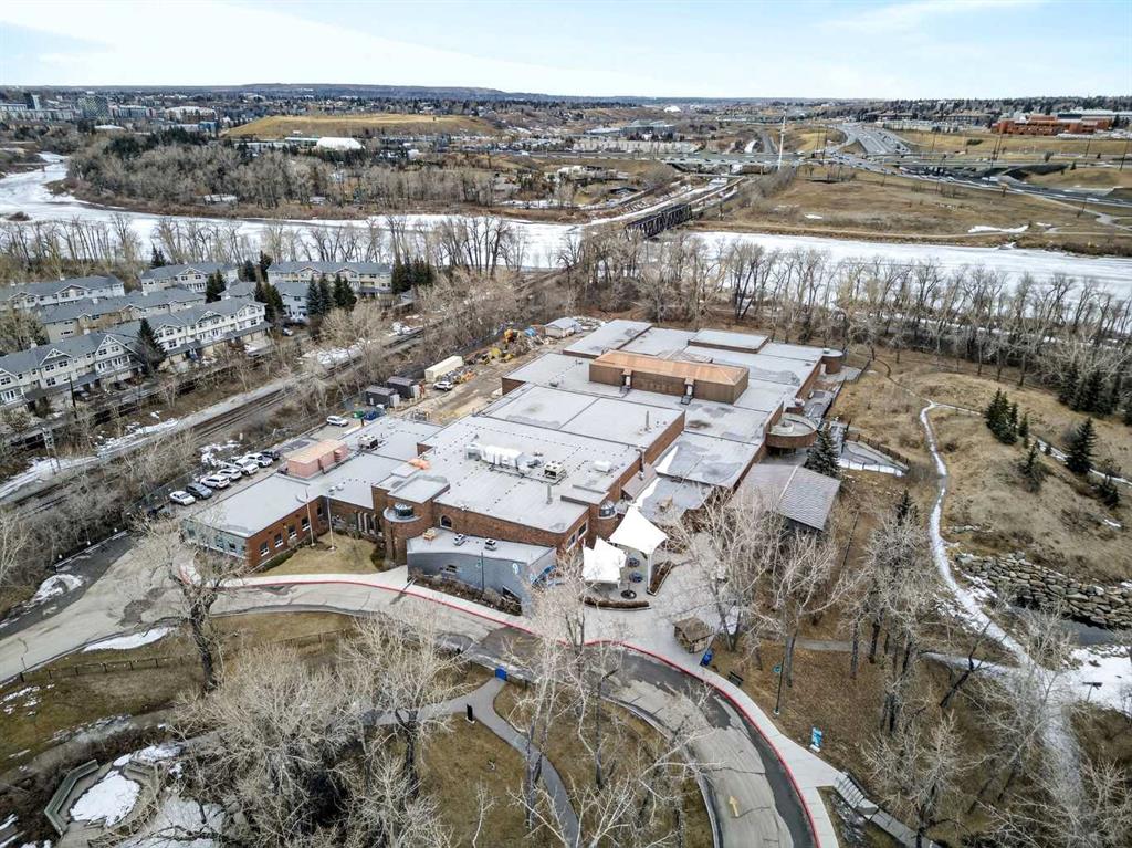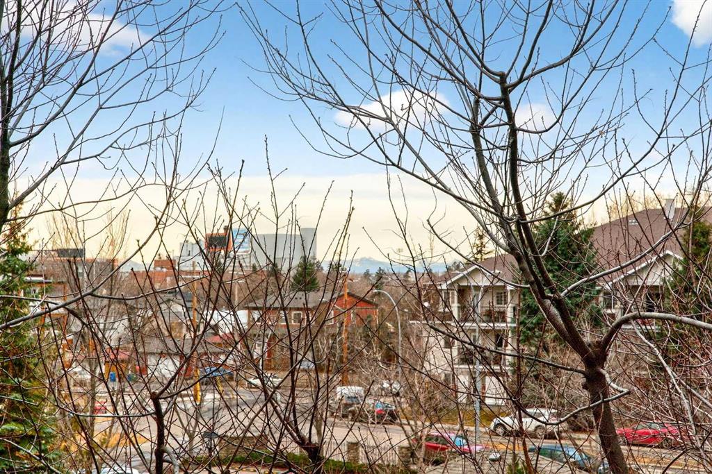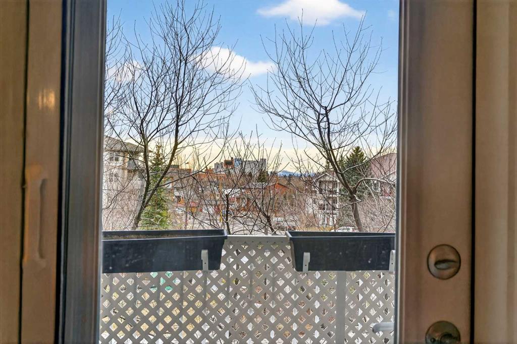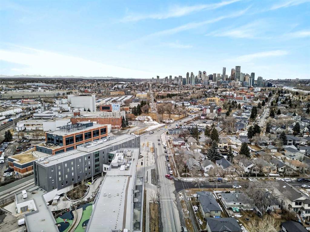 This is no cookie-cutter condo. This exceptional suite showcases creative attention to detail, with custom features left in place for new owners to enjoy from day one. The striking custom-built brick fireplace wall serves as a stunning focal point, complemented by two sets of thick glass shelving that float with unobtrusive grace. Luxury vinyl flooring flows throughout, while the spacious granite countertop provides ample room for meal preparation and entertaining. The refreshed kitchen features quartz countertops, freshly painted cabinets, and newer stainless-steel appliances. In the dining area, the sophisticated black light fixture complements the custom-built quartz table and sleek mid-century modern chairs, available for purchase separately. Southwest exposure floods the suite with natural light and frames beautiful sunsets, mountain views, springtime blossoms, and fall colours from your private balcony. Upgraded deck flooring, custom lattice surround, 12-foot roll-down sunscreen, and retractable screen door make the outdoor space distinctive. The large primary bedroom includes custom dresser and shelving in the closet. A second enclosed room, currently a home office, meets legal egress requirements thanks to the building's full sprinkler system—making it a safe second bedroom. Ceiling fans in both bedrooms and built-in entry and laundry storage add comfort throughout. All this is yours in the friendly and inviting neighborhood of Inglewood, where you're an easy walk to the beautiful Bow River with kilometres of biking and walking trails. Stroll to the excellent shopping, vintage stores, cafes, breweries, and restaurants that Inglewood is famous for. Harvey Passage white water recreation is just 10 minutes away on foot. Heated underground parking and an ample storage locker near the elevator complete the package.
