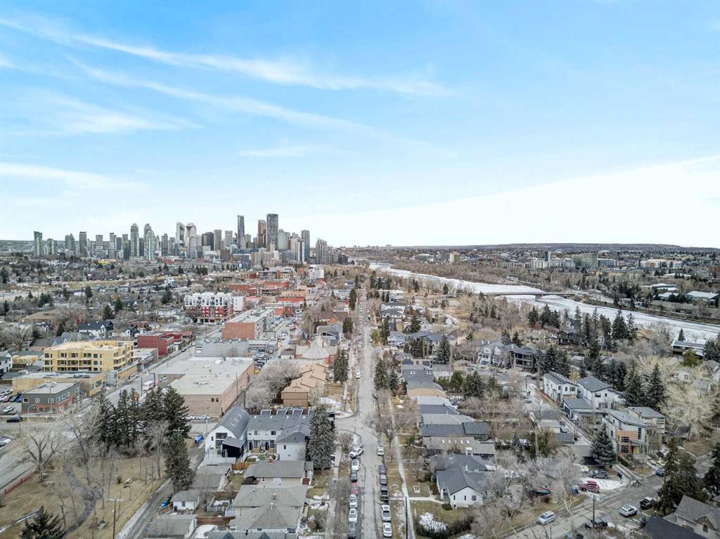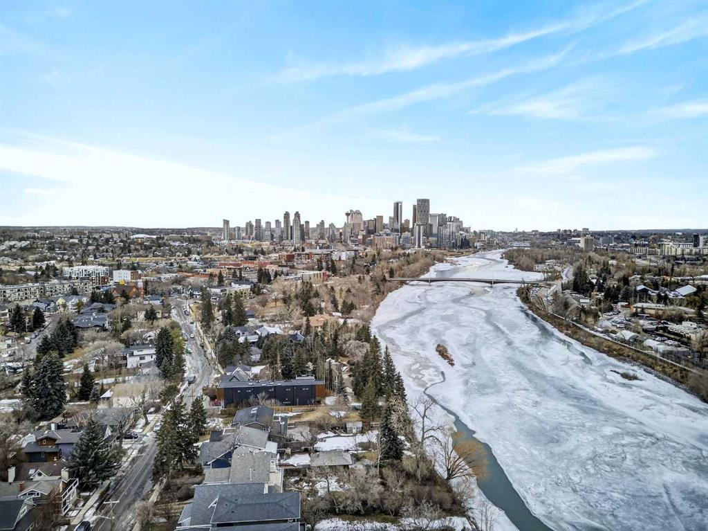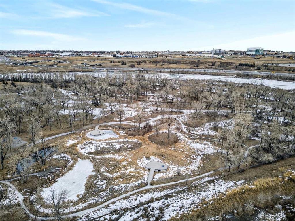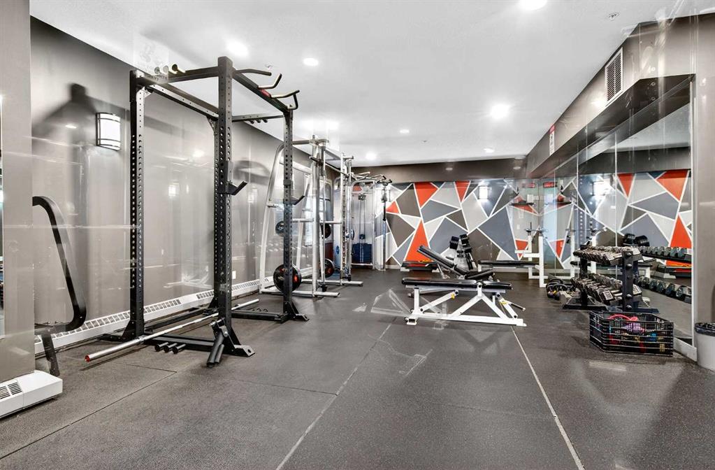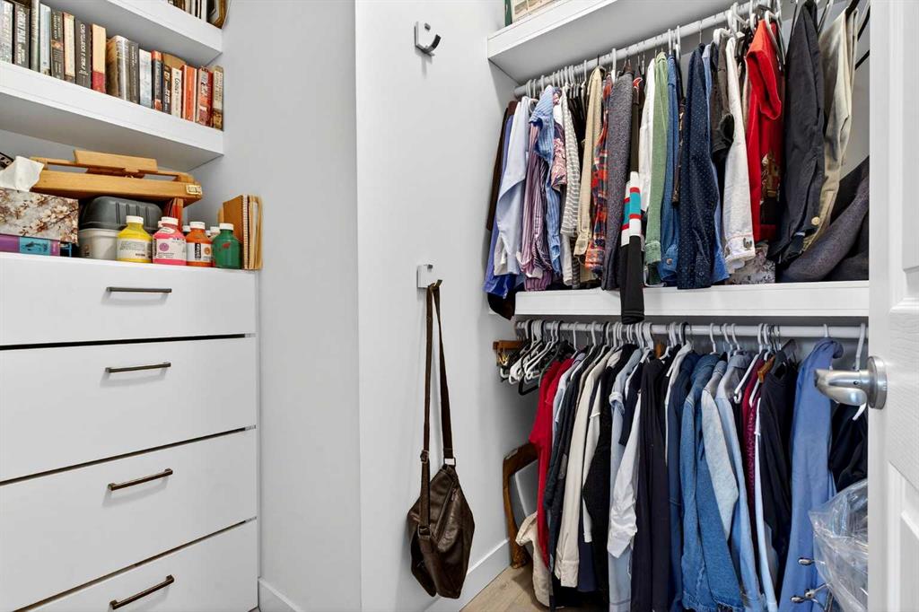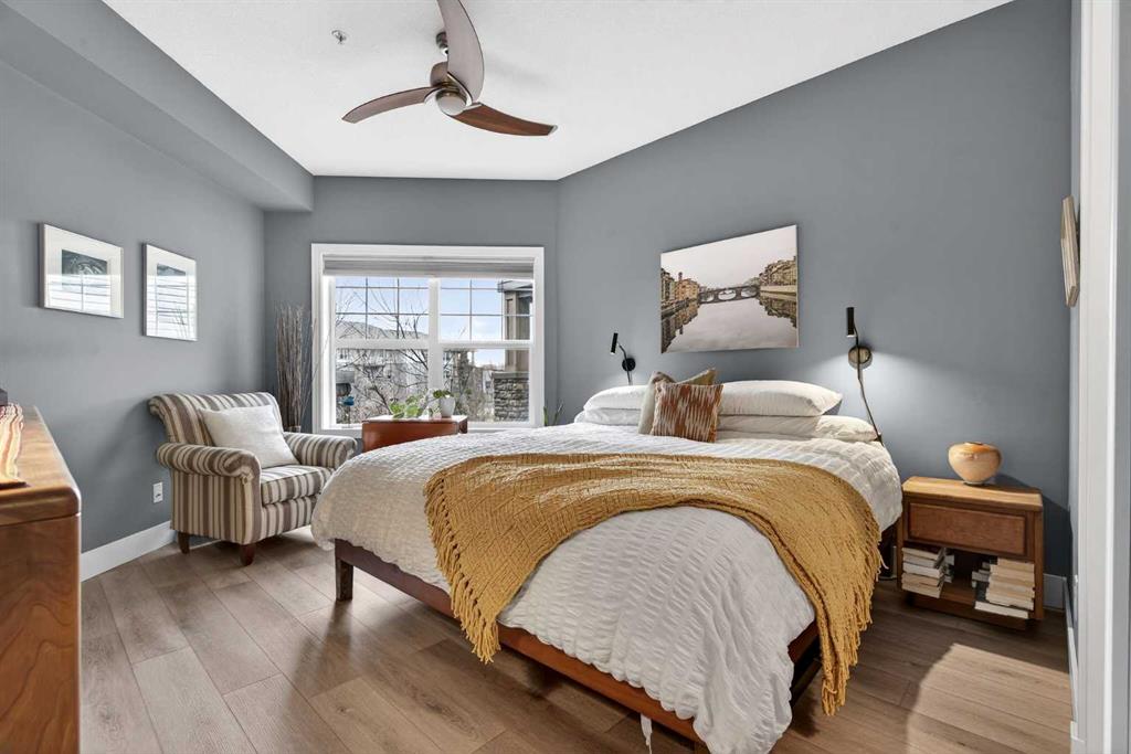 This is no cookie-cutter condo. This exceptional suite showcases creative attention to detail, with custom features left in place for new owners to enjoy from day one. The striking custom-built brick fireplace wall serves as a stunning focal point, complemented by two sets of thick glass shelving that float with unobtrusive grace. Luxury vinyl flooring flows throughout, while the spacious granite countertop provides ample room for meal preparation and entertaining. The refreshed kitchen features quartz countertops, freshly painted cabinets, and newer stainless-steel appliances. In the dining area, the sophisticated black light fixture complements the custom-built quartz table and sleek mid-century modern chairs, available for purchase separately. Southwest exposure floods the suite with natural light and frames beautiful sunsets, mountain views, springtime blossoms, and fall colours from your private balcony. Upgraded deck flooring, custom lattice surround, 12-foot roll-down sunscreen, and retractable screen door make the outdoor space distinctive. The large primary bedroom includes custom dresser and shelving in the closet. A second enclosed room, currently a home office, meets legal egress requirements thanks to the building's full sprinkler system—making it a safe second bedroom. Ceiling fans in both bedrooms and built-in entry and laundry storage add comfort throughout. All this is yours in the friendly and inviting neighborhood of Inglewood, where you're an easy walk to the beautiful Bow River with kilometres of biking and walking trails. Stroll to the excellent shopping, vintage stores, cafes, breweries, and restaurants that Inglewood is famous for. Harvey Passage white water recreation is just 10 minutes away on foot. Heated underground parking and an ample storage locker near the elevator complete the package.