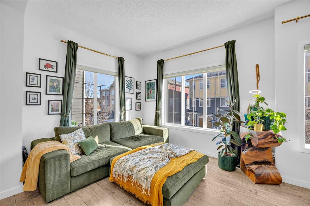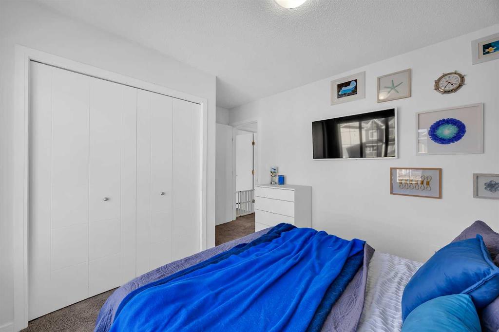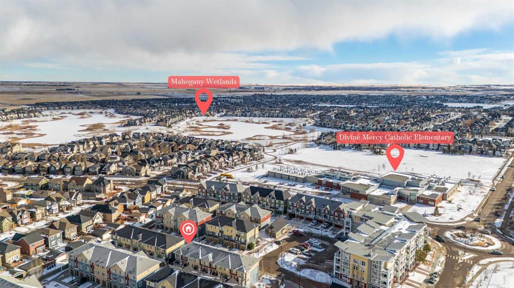 Welcome to this bright and well maintained corner unit townhouse located in the sought after lake community of Mahogany. Offering 3 bedrooms, 2.5 bathrooms, central air conditioning, and over 1,200 sq ft of living space, this home combines a functional layout with excellent natural light thanks to its end unit location. The main floor features an open concept design with a spacious living room, dedicated dining area, and a modern kitchen complete with quartz countertops, stainless steel appliances, mosaic tile backsplash, and a large island with seating. The dining area provides direct access to the balcony, making it easy to enjoy summer BBQs or relax outdoors. A convenient 2 piece bathroom is also located on this level. Upstairs you will find three bedrooms including the primary bedroom with a walk in closet and private 4 piece ensuite. Two additional bedrooms, another full bathroom, and upper level laundry add to the practical layout of the home. Parking is a standout feature with a double tandem attached heated garage plus driveway parking, providing space for multiple vehicles along with extra storage. The home also includes central air conditioning for added comfort during Calgary’s warmer months. Located in Ebony Townhomes, the complex offers visitor parking, landscaped green spaces, and courtyards. Residents also enjoy access to Mahogany’s private lake, along with nearby parks, pathways, schools, shopping, and restaurants. A great opportunity to own a corner unit townhouse in one of Calgary’s most desirable lake communities.