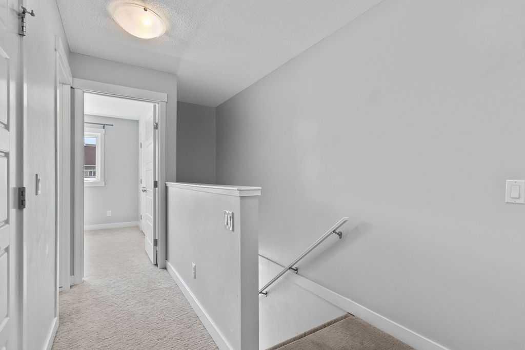 Welcome to Your Exquisite Townhouse in Sought-After Coventry Station Discover refined living in this impeccably maintained townhouse nestled in the vibrant and well-loved community of Coventry Station. Bathed in natural light thanks to expansive windows and an open-concept layout, this home offers an inviting and spacious atmosphere from the moment you enter. The main level exudes sophistication, showcasing rich hardwood floors and luxurious granite countertops in both the kitchen and bathrooms. The gourmet kitchen is thoughtfully appointed with sleek dark cabinetry, gleaming stainless steel appliances, and ample space for culinary creations or entertaining guests. Just off the kitchen, step onto a charming deck that overlooks back green space. Upstairs, retreat to the generously sized primary suite, complete with a 3-piece ensuite and a walk-in closet. A second bedroom also offers a walk-in closet and enjoys access to its own full 4-piece bath. The upper floor is completed by a dedicated laundry area and an additional storage closet, ensuring functionality blends seamlessly with comfort. The lower level with extra storage space—as well as a single attached garage for added convenience. Perfectly positioned with quick access to both Deerfoot and Stoney Trails, and just minutes from a wealth of shopping, dining, and amenities, this home truly offers the best of comfort, convenience, and character. Don’t miss the opportunity to make this exceptional property your own. New roof, new sidings and new windows.