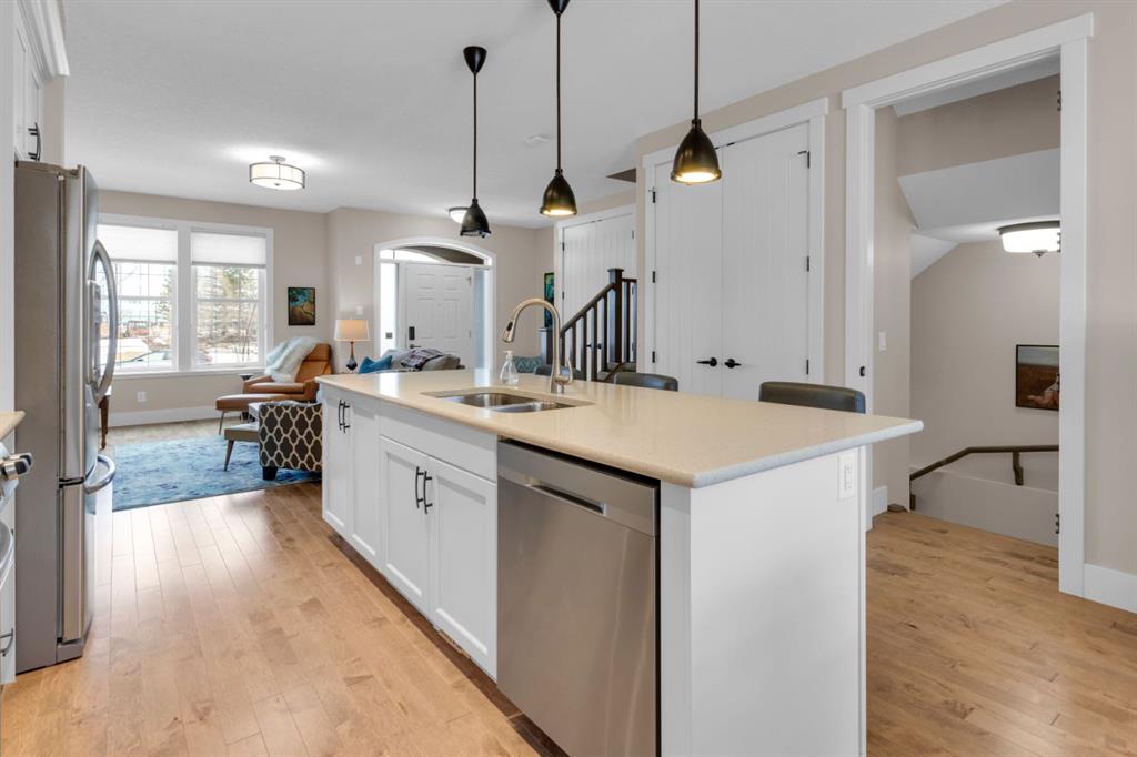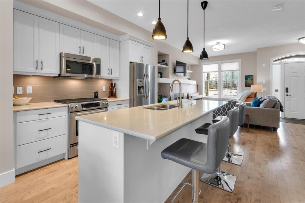 Welcome to Quarry Park, one of Calgary’s most vibrant and thoughtfully planned communities. Known for its beautiful green spaces, walkable pathways, and convenient amenities, Quarry Park offers an exceptional lifestyle along the banks of the scenic Bow River. Residents enjoy easy access to parks, off-leash dog areas, extensive pathway systems, boutique shopping, local cafés, and popular neighbourhood pubs — all while being ideally located for commuting to downtown or anywhere across the city. This stylish two-storey townhouse blends comfort, functionality, and modern design. With its separate front entrance from the street and a private fenced backyard, the home offers the feel of a detached property while maintaining the convenience of townhouse living. A detached double garage adds practical everyday ease. The open-concept main floor is bright and inviting, perfect for both daily living and entertaining. The living room centers around a beautiful gas fireplace with built-in shelving, creating a warm focal point. The spacious kitchen features stainless steel appliances, a massive island, and plenty of prep and gathering space. Just off the kitchen, the sunny dining area overlooks the backyard, bringing in natural light throughout the day. A convenient main-floor half bath completes this level. Upstairs you’ll find a unique and highly functional layout with two primary bedrooms, each with their own private ensuite. Separating the bedrooms is a dedicated laundry room and built-in desk workspace, offering the perfect spot for working from home or staying organized. There is also a pull-down attic hatch, providing valuable extra storage. The fully developed basement offers a cozy yet open extension of the home. The large family room provides plenty of flexible space and is currently set up for spin bikes and fitness equipment. This level also features a generous third bedroom with large windows, a walk-in closet, and convenient cheater access to a four-piece bathroom, making it ideal for guests or older children. With its smart layout, private outdoor space, and unbeatable location in Quarry Park, this home offers the perfect blend of urban convenience and natural surroundings.