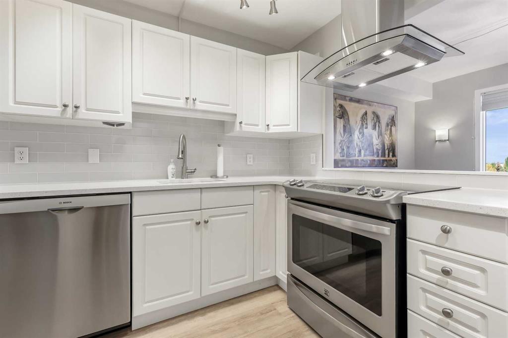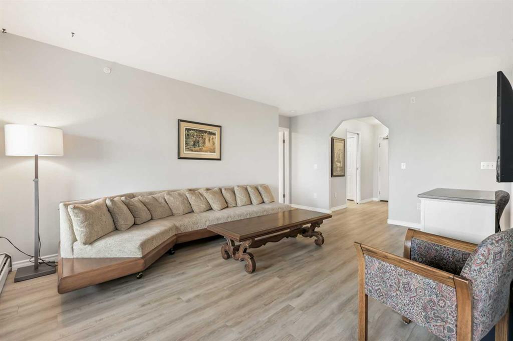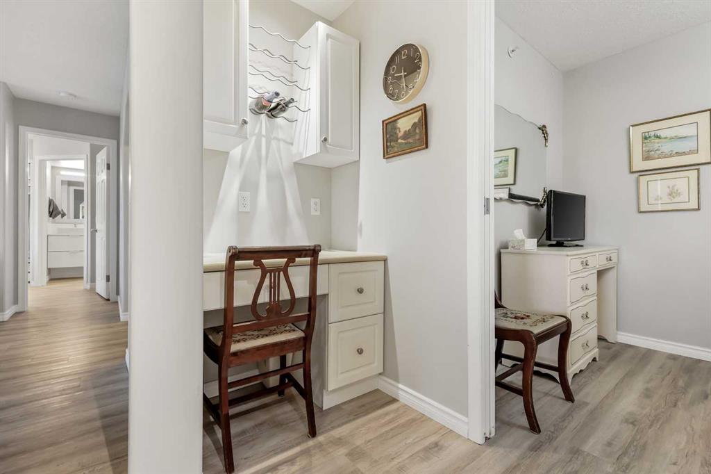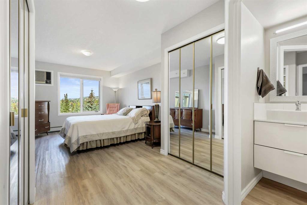 Welcome to #404, 7239 Sierra Morena Boulevard SW – a bright and spacious 1 bedroom plus flex room, 2 bathroom condo located on the 4th floor (top floor) of the desirable Sierras of Richmond Hill, a welcoming 55+ adult community in the heart of Richmond Hill. Very bright and open with updated flooring throughout, this beautifully updated unit features a well-equipped gourmet kitchen with lots of cabinetry, open to a dining room – perfect for cooking, entertaining, and gathering with friends. The generous open-concept great room flows seamlessly into a private sunroom with stunning mountain views – ideal for enjoying your morning coffee or peaceful sunsets. The primary bedroom includes a built-in portable air conditioner for year-round comfort and an updated 4-piece ensuite that showcases double sinks and an oversized shower, followed by a large walk-through closet for excellent storage. An updated 2-piece powder room off the entrance adds convenience for guests. The flex room off the kitchen features built-in desk space and cabinetry, offering the versatility of a home office, sewing room, hobby room, or guest area. In-suite laundry adds everyday convenience. Pride of ownership is shown throughout – this home is truly move-in ready and waiting for you to enjoy. This pet-friendly building (with board approval) offers exceptional amenities, including a Car Wash, Elevator, Fitness Center, Guest Suite, Party Room, Picnic Area, Recreation Room, Workshop, Visitor Parking, and Secured Underground Parking. Includes one underground heated parking stall with a storage locker. Condo fees are all-inclusive, covering electricity, heat, water, sewer, recycling, and garbage, offering truly worry-free living in a professionally managed, beautifully maintained complex. Ideally situated within walking distance to Westhills Towne Centre, grocery stores, restaurants, transit options, and medical services – with quick and easy access to Stoney Trail for seamless travel across the city. This top-floor gem combines comfort, convenience, and community — the perfect place to call home!