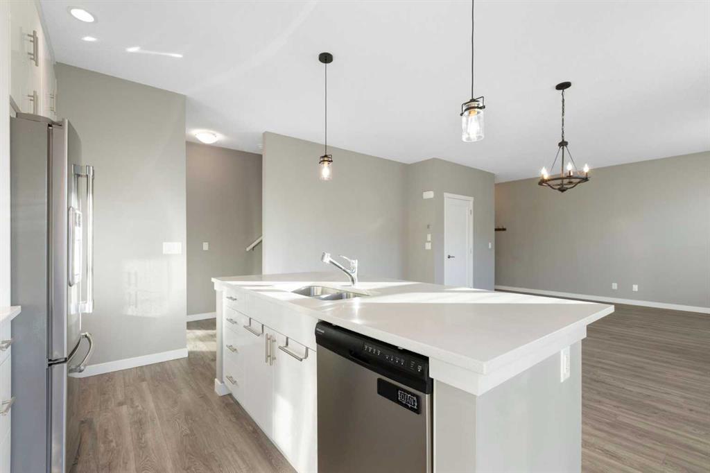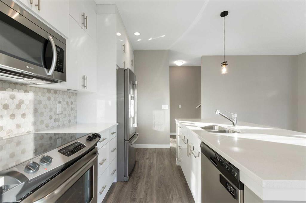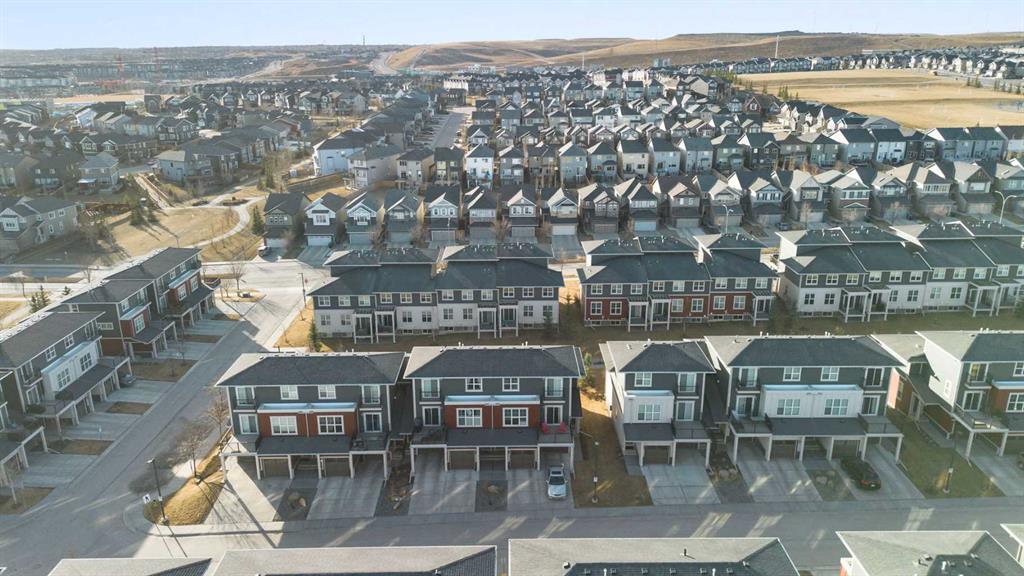Welcome to this beautifully maintained end-unit townhome in the sought-after community of Nolan Hill. Offering 2 bedrooms and 2.5 bathrooms, this thoughtfully designed layout features highly desired layout with dual primary suites — each complete with its own walk-in closet and private ensuite — making it ideal for roommates, guests, or a comfortable work-from-home setup. The open-concept main floor is filled with natural light from additional end-unit windows and showcases 9’ ceilings, modern vinyl plank flooring, and a timeless & modern colour palette. The kitchen is both stylish and functional, featuring quartz countertops, stainless steel appliances, a large centre island with eating bar, floor-to-ceiling cabinetry, and a sleek tile backsplash. The dining and living areas flow seamlessly onto the sunny south-facing balcony overlooking green space, complete with a gas line for BBQ and room for outdoor seating — a rare and peaceful setting for townhouse living. Upstairs, laundry is thoughtfully located for everyday ease. The full-footprint undeveloped basement offers impressive storage and flexibility for future plans, while the attached garage with parking pad ensures practical day-to-day functionality, with additional visitor parking close by. Located just minutes from Beacon Hill Shopping Centre (Costco, restaurants, and amenities), parks, pathways, and major roadways, this home offers exceptional value in a well-connected NW location. An excellent opportunity for first-time buyers, downsizers, or investors seeking a low-maintenance property in a desirable community. Call for your private showing today.