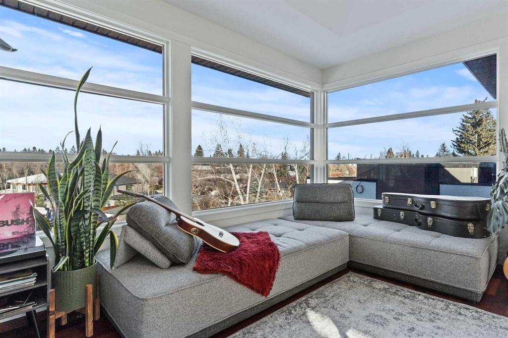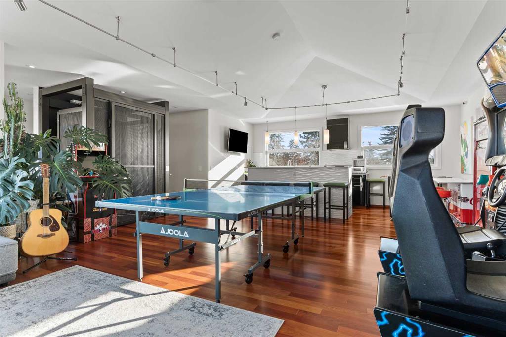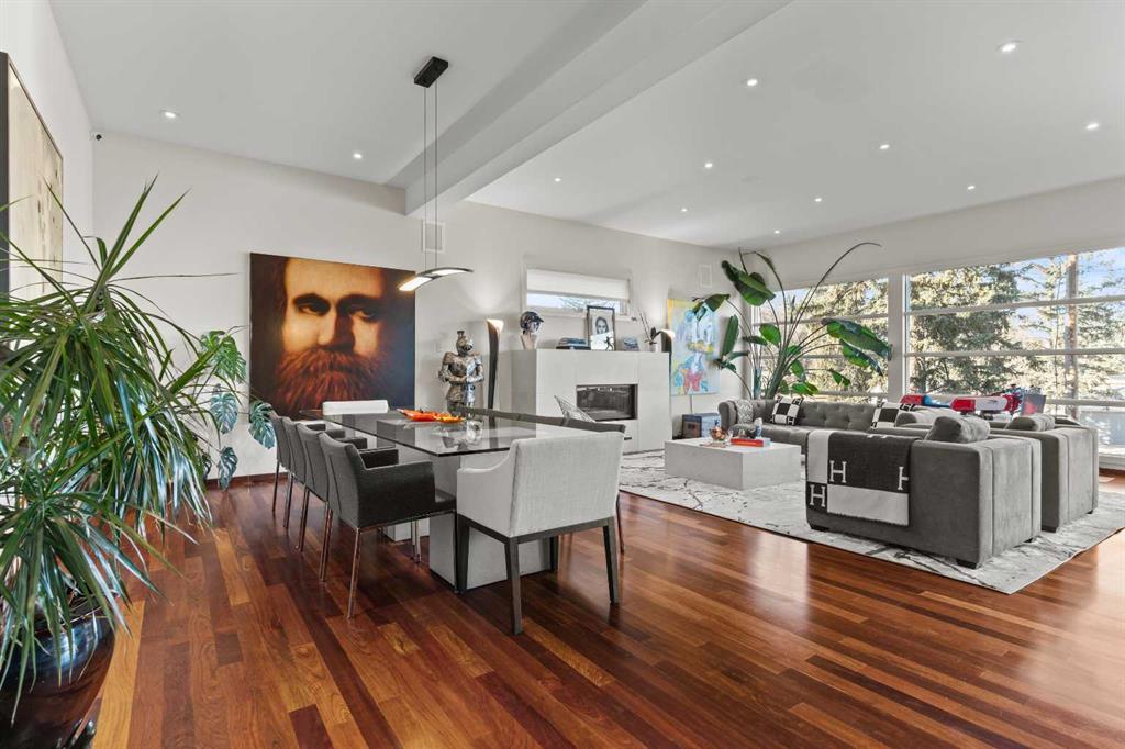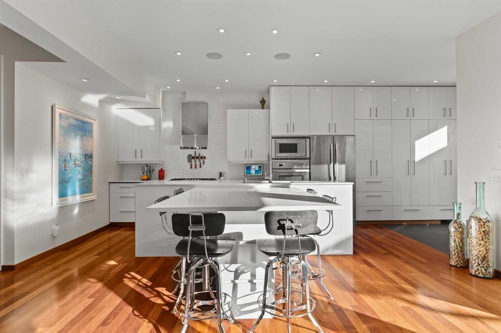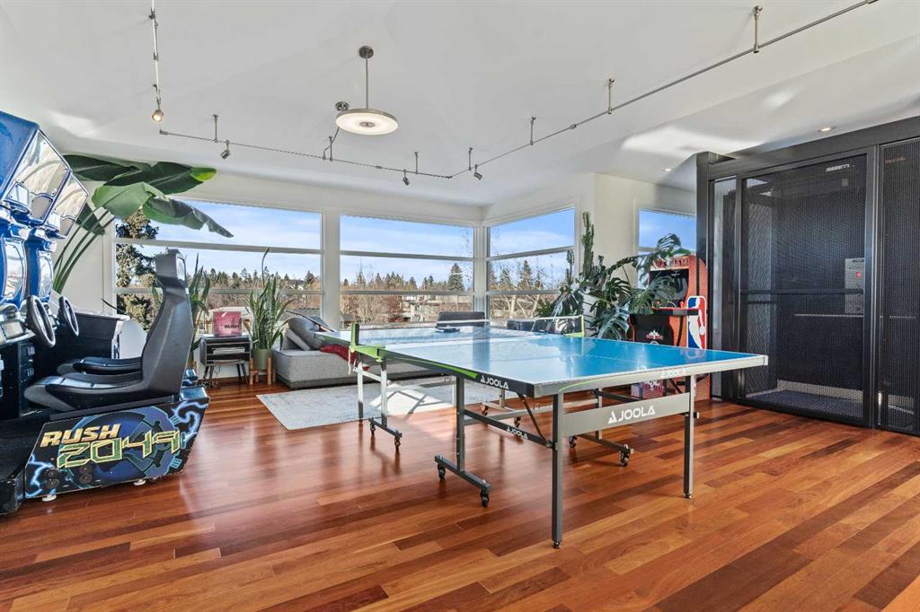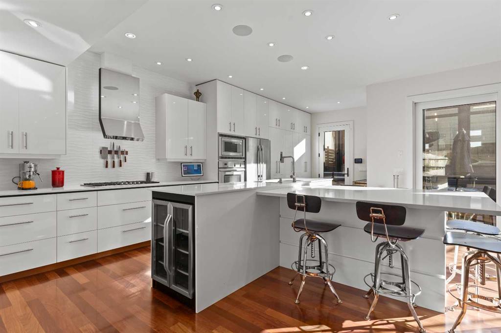 Welcome to this custom-designed 3-storey luxury home offering over 6,000 sq ft of beautifully crafted living space in the prestigious community of Elboya. Designed for large families and avid entertainers, this residence blends modern elegance, thoughtful function, and impressive downtown views, highlighted by a show stopping integrated steel elevator inspired by a New York loft, providing seamless access to every level. The bright, open-concept main floor features Brazilian cherry hardwood, soaring ceilings, and floor-to-ceiling windows allowing an abundance of light into the space and framing mature greenery. A striking marble-faced gas fireplace anchors the living room, while the spacious dining room easily hosts large gatherings. The chef-inspired kitchen offers quartz countertops, peninsula seating, custom cabinetry, and premium appliances including Fisher & Paykel oven, Thermador 5-burner cooktop, Jennair refrigerator, and Bosch dishwasher. A wood-slat feature wall elegantly defines the open concept den, and large sliding doors open onto the private backyard, creating a natural indoor/outdoor flow ideal for year round entertaining. A powder room and laundry room complete the main level. The second floor hosts an exceptional primary retreat with oversized windows, remote-controlled Hunter Douglas blinds, private balcony with downtown views, walk-in closet, and a spa-like 5-piece ensuite with steam shower, soaker tub, and smart toilet. The second bedroom includes a 4-piece ensuite and walk-in closet, while two additional bedrooms share a full bath making it an ideal layout for families. The third level is an entertainer’s dream, offering incredible city views and a rare indoor gathering space designed for hosting at scale. A full secondary kitchen features a bar-height quartz island with wine fridge, making it perfect for get togethers or evening soirees. The fully developed lower level includes a large family/recreation room with generous windows, a spacious fifth bedroom with walk-in closet, dry bar with wine fridge, a 4-piece bath, and a dedicated wine cellar. Enjoy the fully fenced backyard designed for evening gatherings, complete with natural gas hookup, outdoor speakers, and a modern open layout showcasing the impressive showroom-style garage. Car enthusiasts will love the oversized 4-car garage with potential for six vehicles with stackers. Smart-home features include automated lighting, thermostats, security system with 10 cameras, and Sonos sound throughout. Additional features include air conditioning, irrigation system, and french drains. Situated in sought-after Elboya, this exceptional residence is mere steps from top-rated schools, Calgary Golf & Country Club, Britannia Shopping Centre, Stanley Park, Sandy Beach, numerous parks and pathways and quick access to downtown. With its rare combination of scale, craftsmanship, design, and location, this home presents a unique opportunity to own a truly extraordinary inner-city estate.