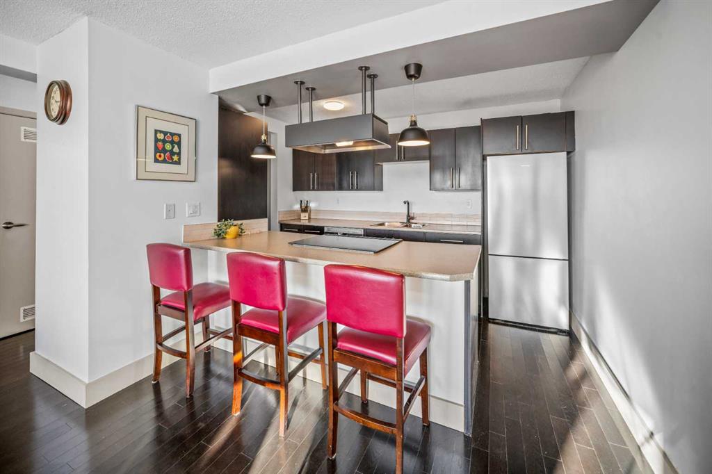 Stylish inner city living in the heart of Mission. This upgraded one bedroom, one bathroom condo offers over 600 square feet of thoughtfully designed space in a short term rental friendly building with secure underground parking. The bright open concept layout features hardwood flooring, updated lighting, and a functional kitchen complete with espresso cabinetry, generous storage, a breakfast bar, and upgraded stainless steel appliances. The living area opens onto a private south facing balcony with beautiful mountain and sunset views, the perfect place to unwind at the end of the day. The bedroom includes brand new carpet, ample closet space, and enough room for additional furnishings. The refreshed bathroom features a new toilet and fully updated shower plumbing. A standout upgrade is the in suite laundry with a full size stacked washer and heat pump dryer, along with updated plumbing and electrical. The building also offers convenient bike storage. All of this in a highly walkable location just minutes from 17th Avenue, 4th Street, river pathways, parks, dining, and boutique shopping. A true turn key opportunity in one of Calgary’s most vibrant inner city communities.