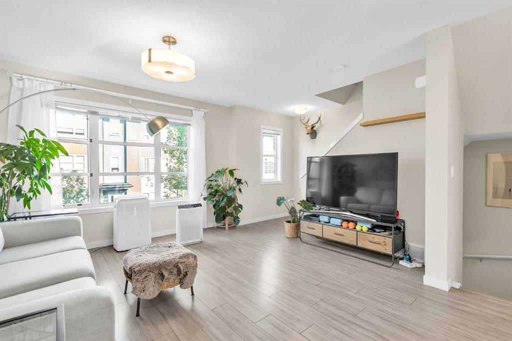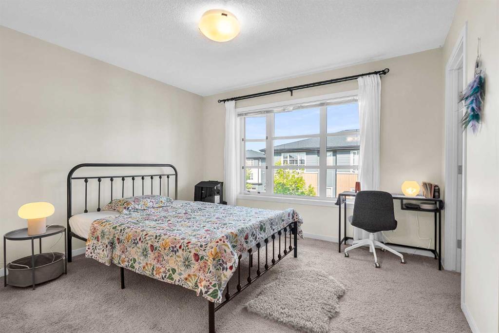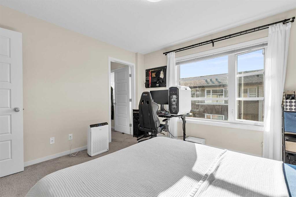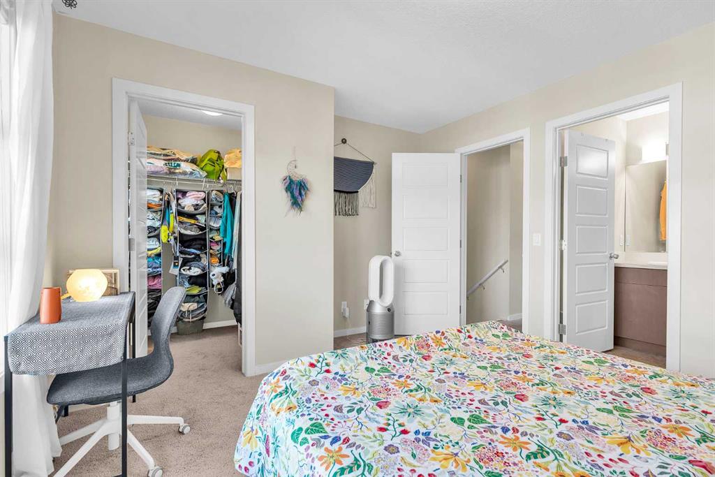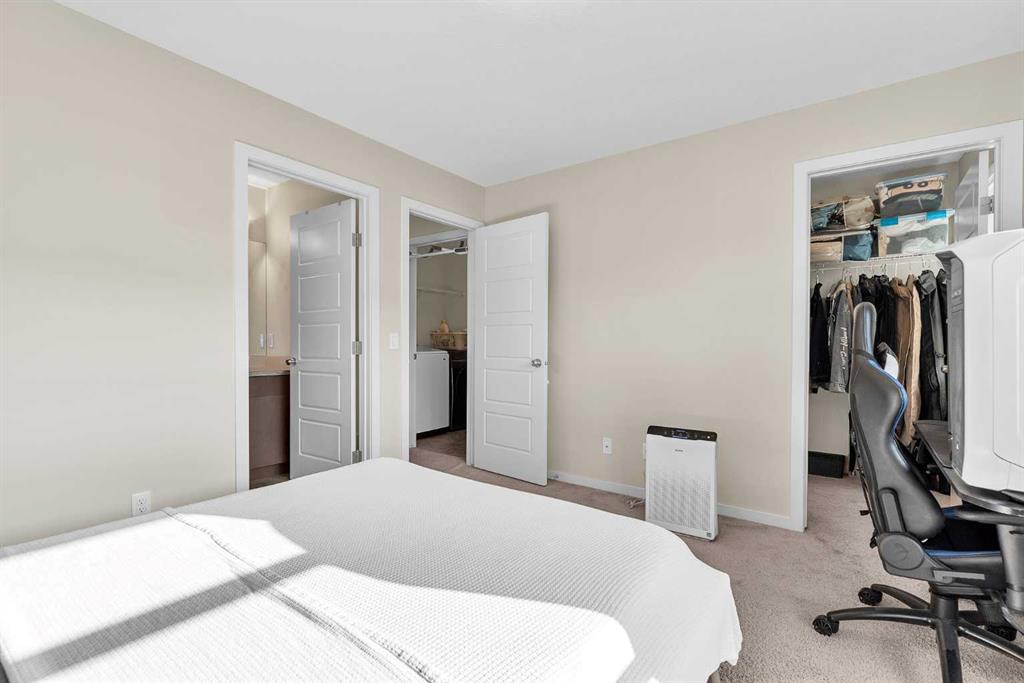 Welcome to this stunning townhouse with a double attached garage, ideally located in the desirable community of Evanston. Surrounded by greenery, scenic views, and beautiful walking and biking trails, this home offers both tranquility and convenience. Families will love the easy access to schools, shopping, dining, and everyday amenities in this vibrant neighbourhood. The entry level features a bright and spacious home office, perfect for working from home or studying, as well as additional storage space and direct access to the double attached garage. Upstairs, the open-concept living area is filled with natural light from large windows, creating a bright and airy atmosphere. The Chef’s kitchen is a true highlight, complete with stainless steel appliances, abundant cabinetry, upgraded quartz countertops, a large centre island with breakfast bar seating, and a pantry. The adjacent dining area opens onto a private west-facing balcony, ideal for relaxing or entertaining. The upper level offers two generous master bedrooms, each featuring a full ensuite bathroom and a bright walk-in closet with windows. A convenient laundry area completes this floor. This home blends modern finishes, functionality, and an unbeatable location. Fridge (2025), Dishwasher (2025), Washer (2025), Dryer (2025), Hot Water Tank (2025), Humidifier (2025).