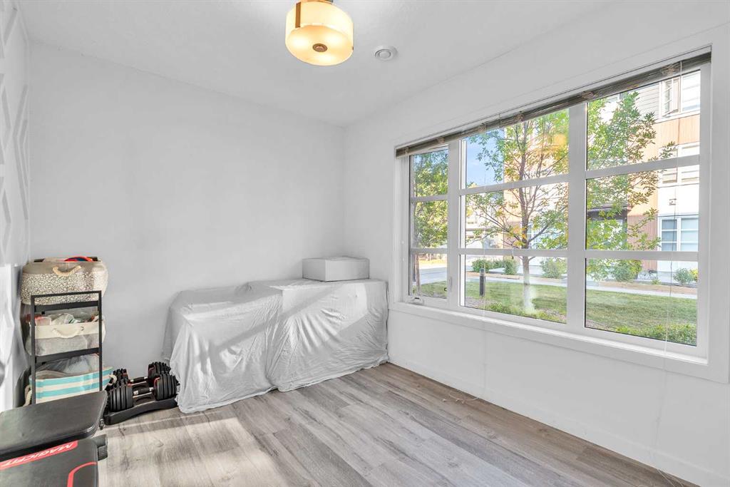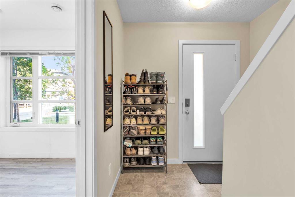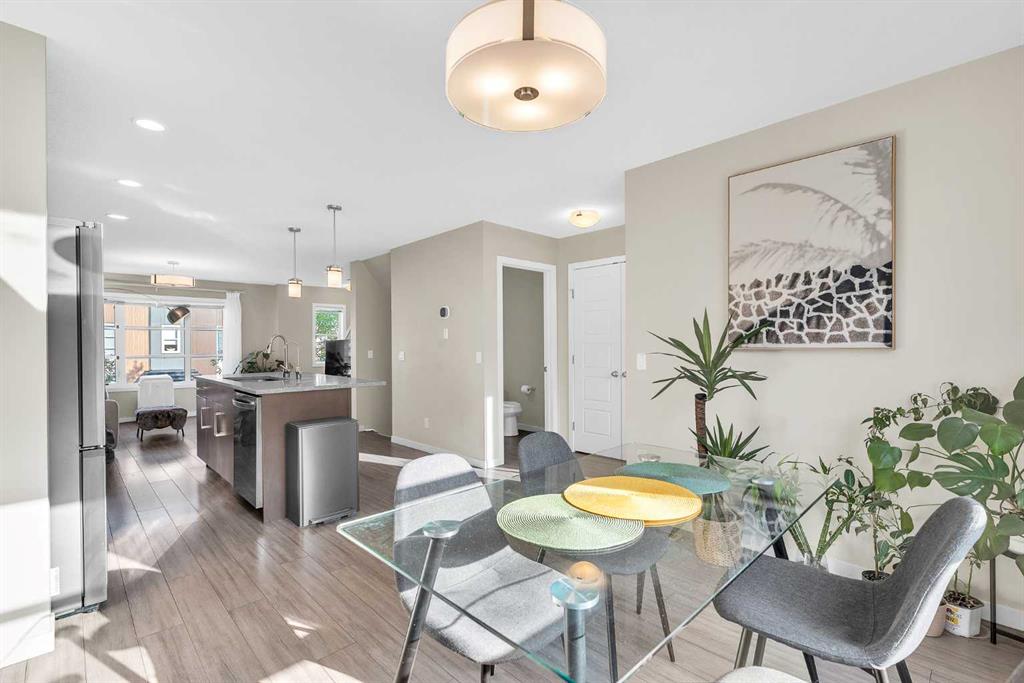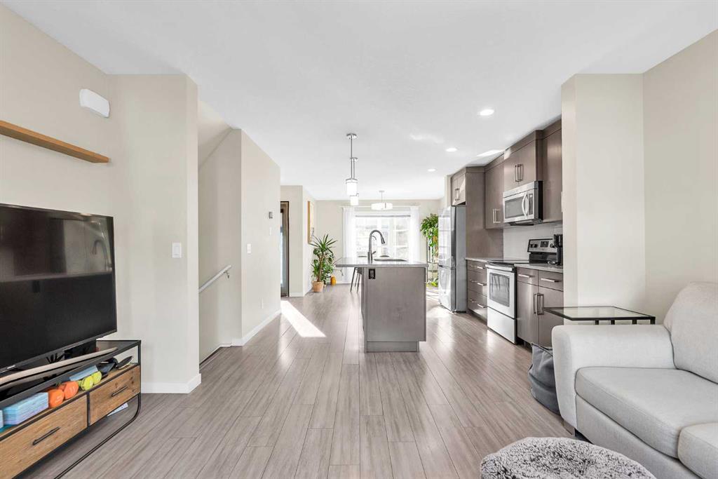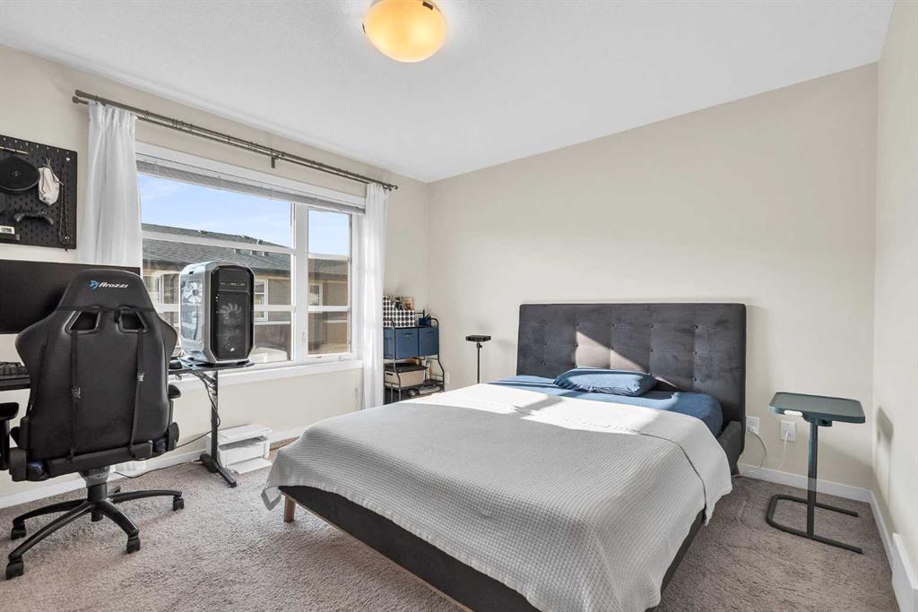 Welcome to this stunning townhouse with a double attached garage, ideally located in the desirable community of Evanston. Surrounded by greenery, scenic views, and beautiful walking and biking trails, this home offers both tranquility and convenience. Families will love the easy access to schools, shopping, dining, and everyday amenities in this vibrant neighbourhood. The entry level features a bright and spacious home office, perfect for working from home or studying, as well as additional storage space and direct access to the double attached garage. Upstairs, the open-concept living area is filled with natural light from large windows, creating a bright and airy atmosphere. The Chef’s kitchen is a true highlight, complete with stainless steel appliances, abundant cabinetry, upgraded quartz countertops, a large centre island with breakfast bar seating, and a pantry. The adjacent dining area opens onto a private west-facing balcony, ideal for relaxing or entertaining. The upper level offers two generous master bedrooms, each featuring a full ensuite bathroom and a bright walk-in closet with windows. A convenient laundry area completes this floor. This home blends modern finishes, functionality, and an unbeatable location. Fridge (2025), Dishwasher (2025), Washer (2025), Dryer (2025), Hot Water Tank (2025), Humidifier (2025).