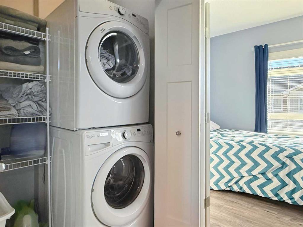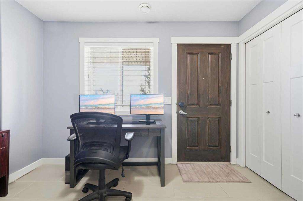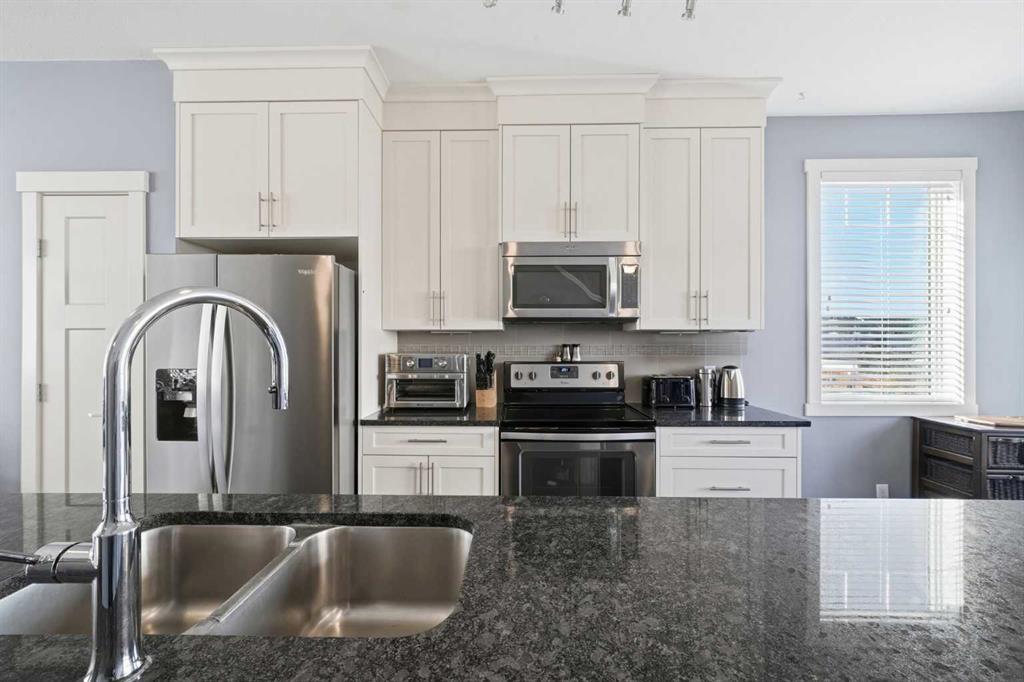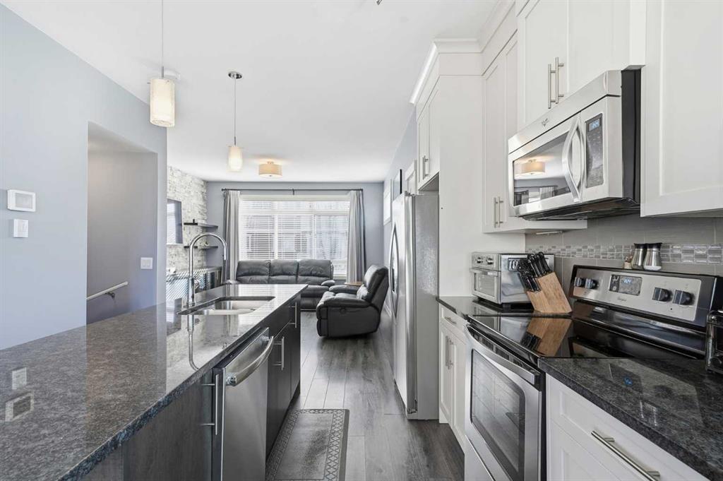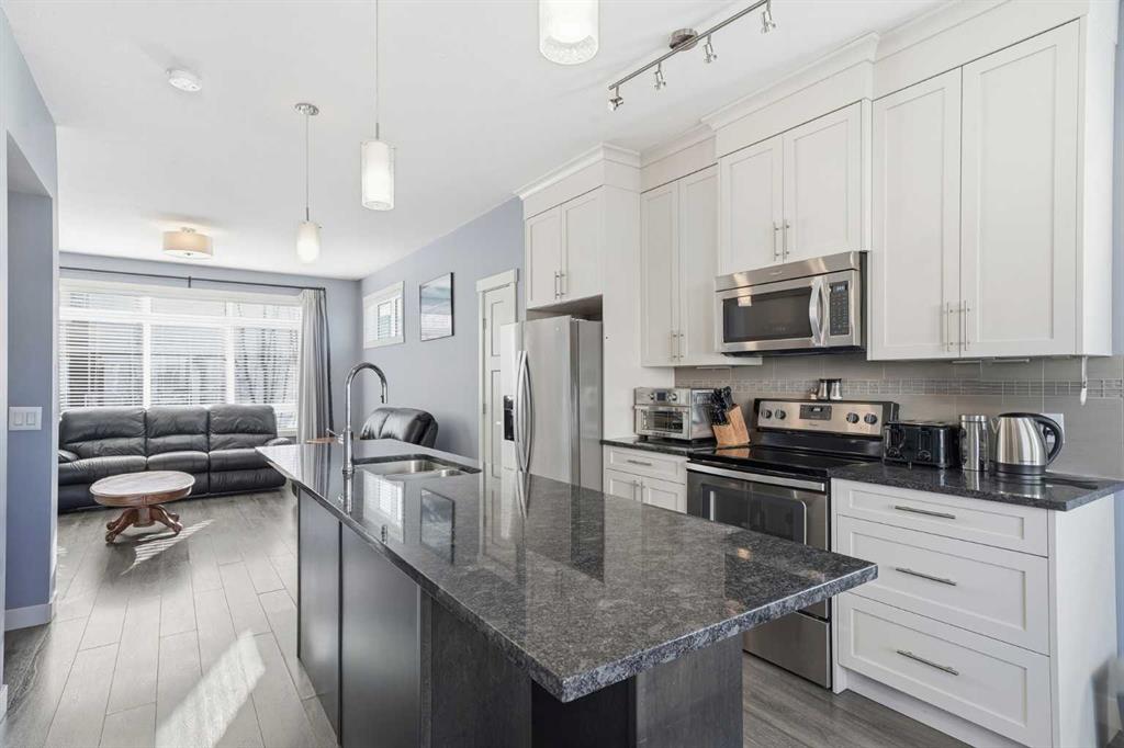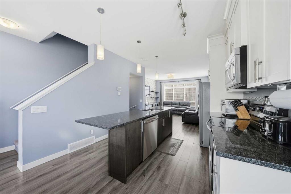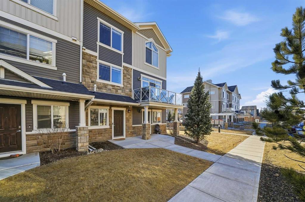 Welcome to this beautifully upgraded corner-unit townhome offering 2 primary bedrooms + den and 2.5 BATHS in a fantastic Calgary location. The bright living room features a stunning REAL STONE FEATURE WALL, custom built-ins, and an elegant electric FIREPLACE. The kitchen boasts granite countertops, a large island with eating bar, and flows into the formal dining area with access to a private balcony complete gas BBQ hookup. Upstairs you’ll love the VAULTED ceilings, convenient upper-floor laundry, and two spacious bedrooms including a generous master suite with room for a king-sized bed, walk-in closet, and a 3-piece ensuite featuring HEATED TILE flooring and an upgraded quartz vanity. The single attached garage includes CUSTOM SHELVING. Ideally located near visitor parking, schools, and shopping. A must-see corner unit with excellent upgrades and unbeatable convenience!
