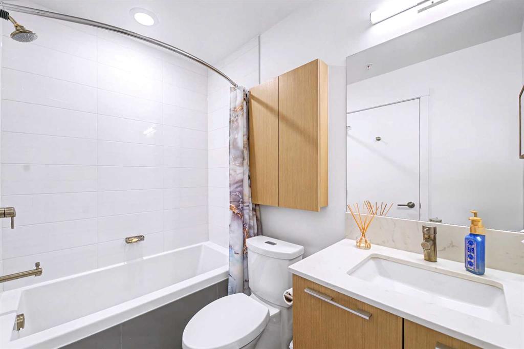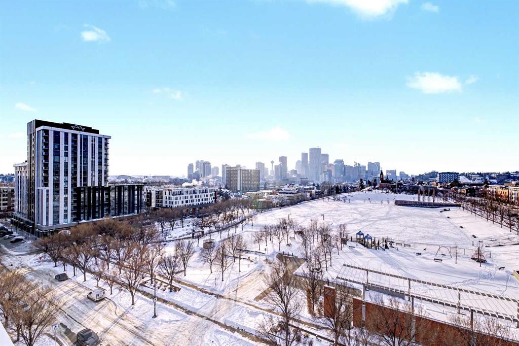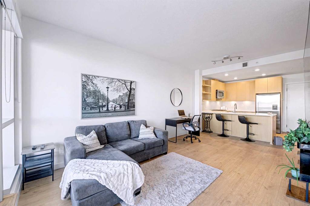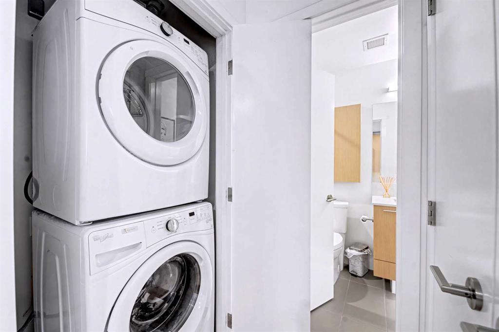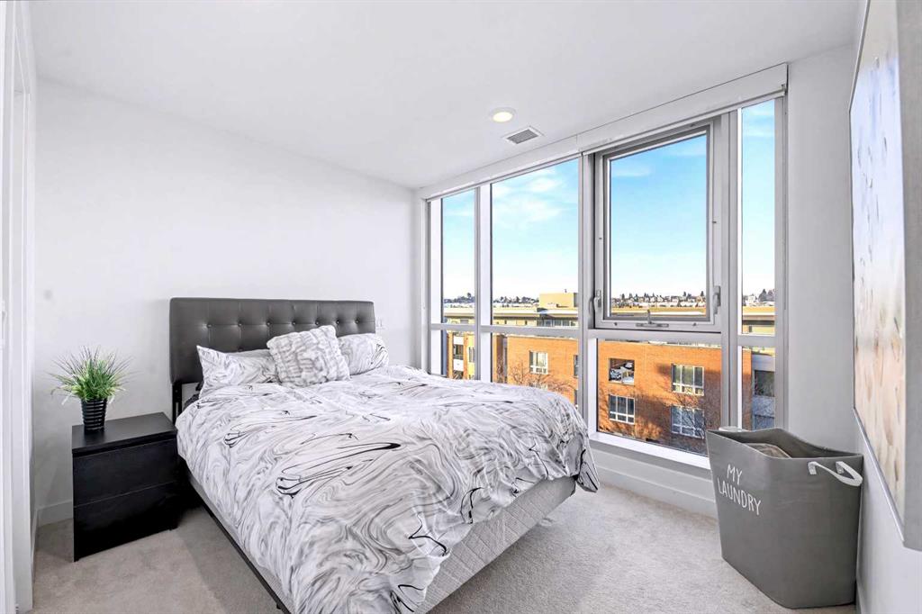 Bridgeland is defined by its rhythm, a unique pocket of Calgary where historic character sits comfortably alongside a modern, high energy main street. Life here means having Murdoch Park across the street and the Bow River pathways just a short walk away. This 2019 built residence offers a front row seat to the best of the community, with immediate proximity to local staples like Una Pizza, Village Ice Cream, and the upcoming Native Tongues Taqueria. For those looking to see the space in detail, a virtual tour is available to view online. The interior is shaped by light, efficient geometry and has central AC. Concrete construction ensures a quiet environment, while floor to ceiling windows and high ceilings create a sense of volume that belies the square footage. The kitchen is anchored by a Bosch GAS RANGE and a Fisher & Paykel refrigerator, finished with beautiful quartz countertops. The layout transitions seamlessly into the living area, where a built-in Murphy bed offers clever flexibility for guests or a home office setup. The primary suite is a private retreat, highlighted by a modern, spa inspired ensuite featuring a double vanity with quartz countertops, sleek wood cabinetry, and a glass enclosed shower with marble style tile. Beyond the unit, the building prioritizes convenience; storage is located just down the hall on the same floor, and the LEED Platinum certification reflects a high standard for air quality and energy efficiency. Residents of Radius Bridgeland by Bucci enjoy a wide range of thoughtfully designed amenities throughout the building. The 7th floor features a rooftop patio with impressive views, while the 5th floor includes storage units, and the Spin Bike Room. The 4th floor offers a dedicated yoga room, and the 2nd floor includes the convenient Spud Room for parcel deliveries. On the main floor, residents have access to a fully equipped fitness centre and a concierge. The amenities within the building act as an extension of the home, providing professional grade fitness spaces, spin and yoga studios, and a concierge service. The rooftop patio serves as a central gathering point with clear views of the downtown skyline. When it is time to commute, the Bridgeland/Memorial CTrain station is nearby, connecting you to the downtown core in minutes without the need for a car. There’s no wasted space in this wonderful open concept layout. Featuring two bedrooms and two bathrooms across approximately 693 square feet of well maintained living space, the home is filled with natural light thanks to large windows and also offers a spacious balcony. The underground parking stall is conveniently located close to the elevator lobby, and residents can enjoy added amenities including a dog wash and car wash station. This is a great opportunity to own in one of the best buildings in Bridgeland. The property is vacant and move-in ready. Book your showing today!