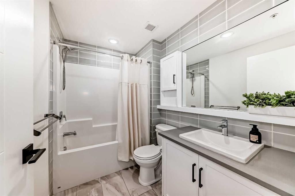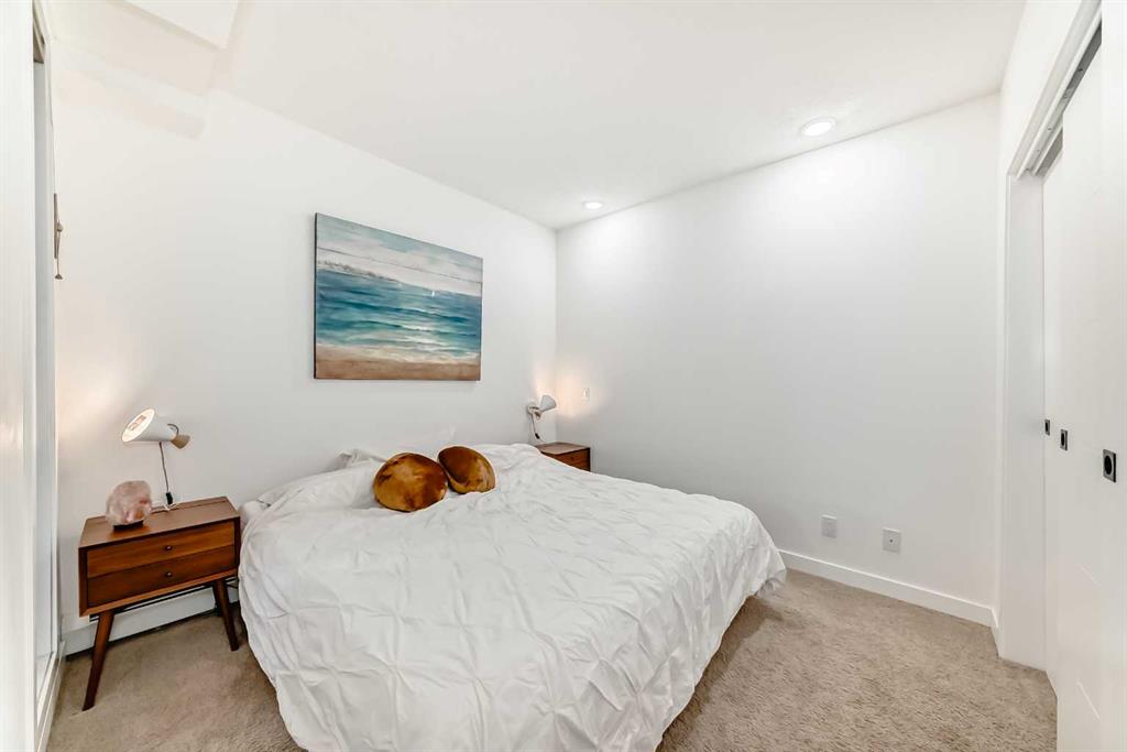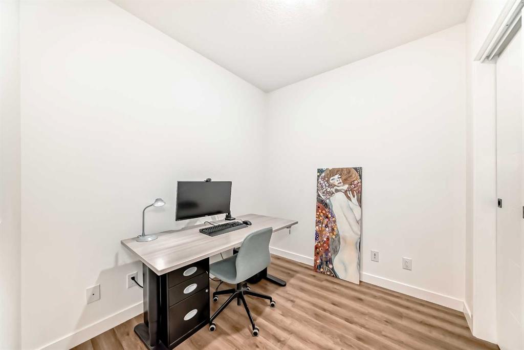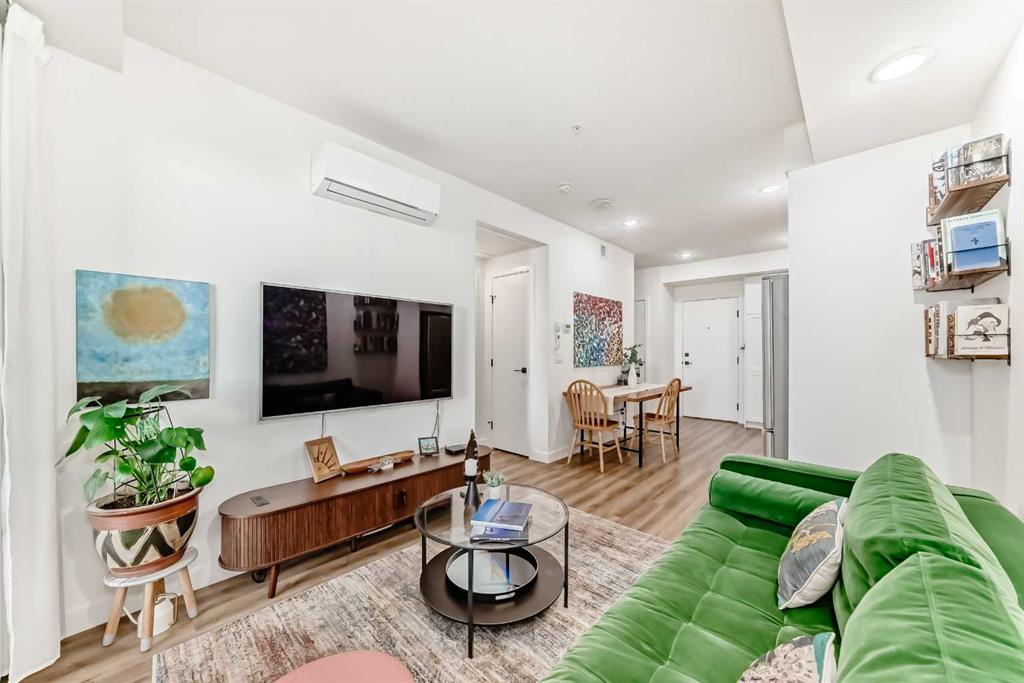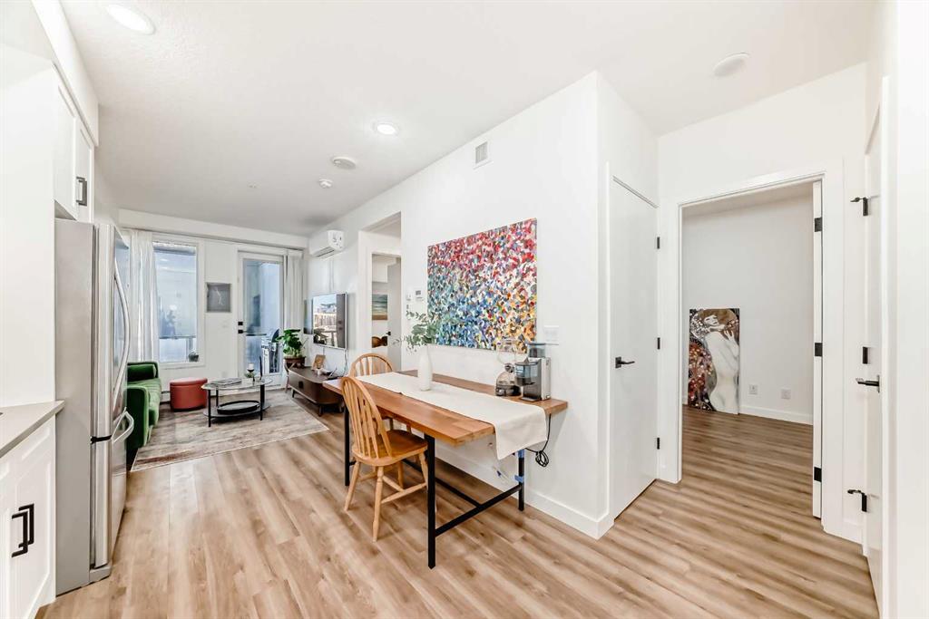 Welcome to this gorgeous 1 bed/1 bath + den unit in the heart of the University District! The unit features an open concept living space w/9' ceilings, luxury vinyl plank throughout the living space and loads of light through the large windows. The kitchen/dining features gorgeous white cabinetry, quartz counters, gas range, stainless appliances and enough space for a farm style table. The living area is great for entertaining, with mini split AC for the summer and walks out to a good sized balcony with extra storage & gas line for your BBQ., perfect for al fresco dinners The good sized primary bedroom has room for a king sized bed and amazing closet fitted with California Closet built ins. The den/office is great for those who work or study from home & also feature closet built ins. The bright 4 piece bath & in unit laundry complete the property. As well, there is one titled parking spot and an assigned storage unit, underground visitor parking, bike storage & car wash. The August in University District features a warm contemporary lobby and large common room w/kitchen, perfect for celebrating with family & friends. The building is ideally located next to the Alt Hotel by Le Germaine & Charcut restaurant, one block from the Children's Hospital, just blocks from U of C, and a quick walk to Save On, Cineplex cinemas, fitness centres, and many more restaurants & services. As well, it's close to the Bow River, Bowness Park, the Calgary Farmers Market and Winsport., and an easy jaunt out to the mountains. Book your showing today!