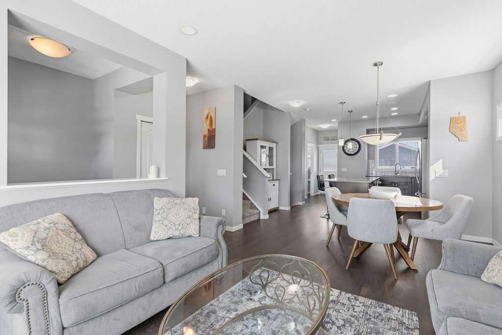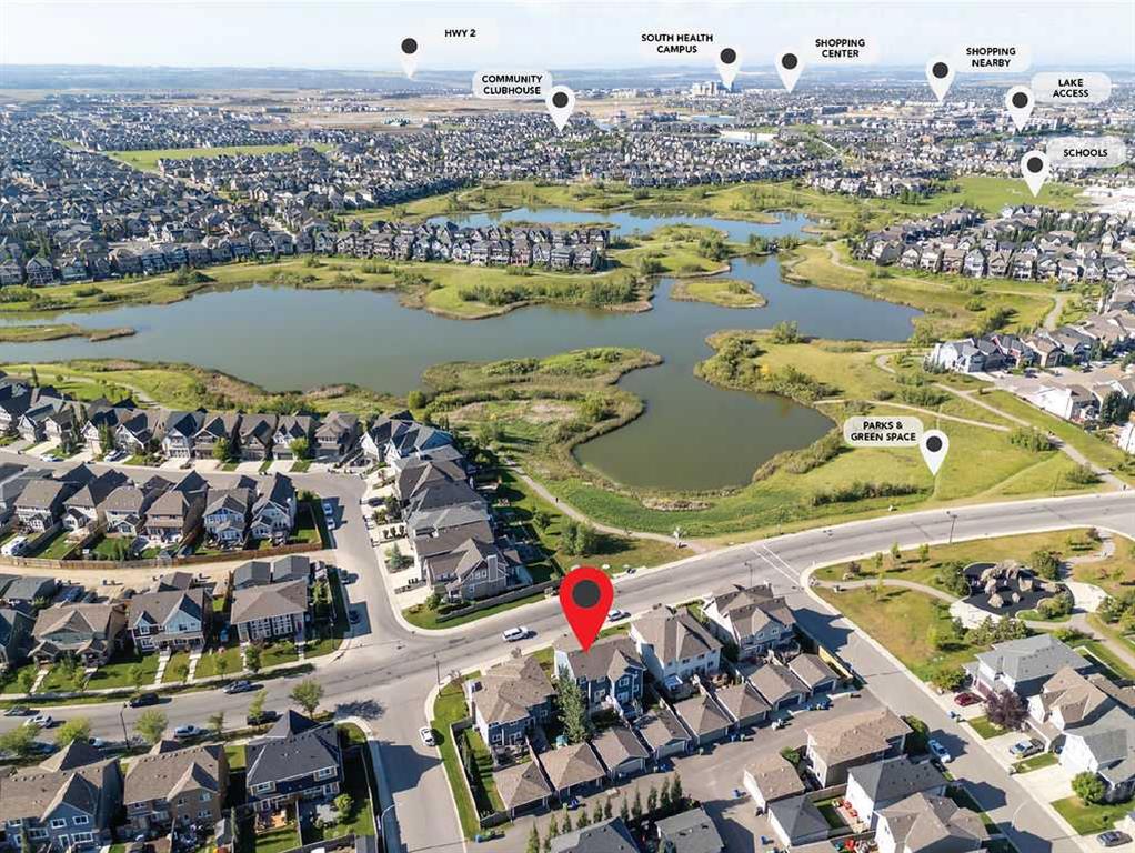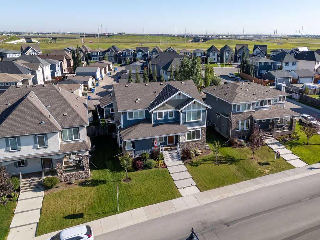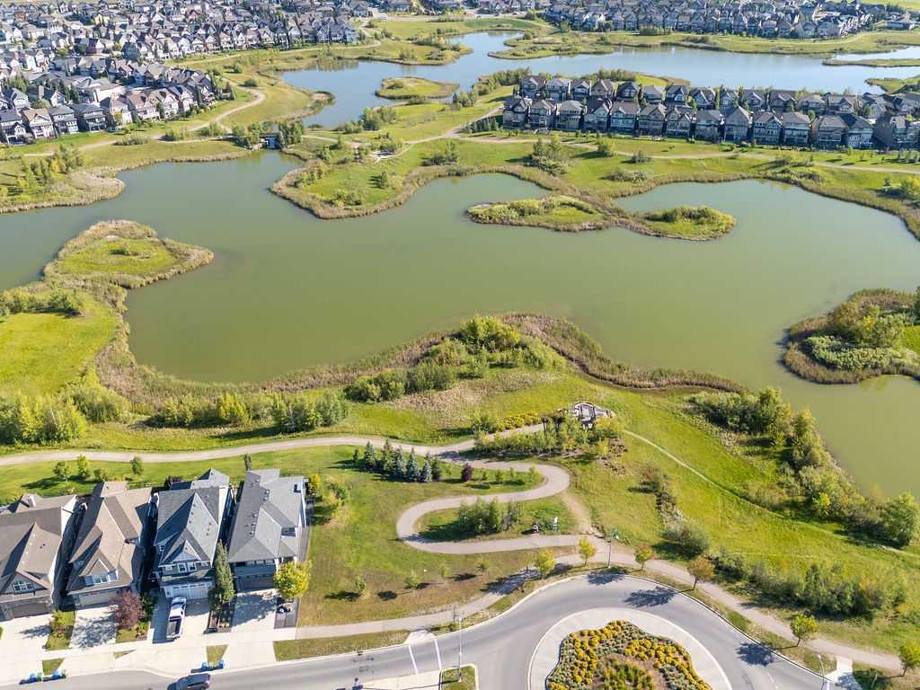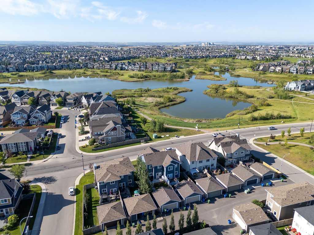 Welcome to this beautiful fully finished home in Calgary’s award-winning lake community of Mahogany, offering incredible value and an unbeatable location just steps from Rock Park, with sweeping views of the wetlands and pathway system right from your front door! Stepping inside, you’re welcomed by a bright, open concept main floor and a spacious front living room anchored by an oversized window that perfectly frames the natural wetlands and bike paths across the street. The seamless flow carries you into the dedicated dining area and into the well appointed kitchen overlooking the backyard, complete with a walk-in pantry and designed for both everyday living and entertaining. Here you’ll find a large central island with upgraded stone countertops, stainless steel appliances, warm wood-toned cabinetry, and a classic subway tile backsplash tying the space together. Upstairs, the home offers three comfortable bedrooms, including a spacious primary suite where large windows showcase tranquil wetland views adding a touch of nature to your daily routine. This retreat is complete with a walk in closet and a 5 piece ensuite featuring dual vanities, quartz countertops, and tile flooring, creating a functional and relaxing space to start and end your day. Heading down to the fully developed basement, you’ll find even more versatility with a generous rec room equipped with a dry bar, a large fourth bedroom, laundry closet and a full bathroom ideal for guests, older kids, or extended family. The exterior is finished in a timeless craftsman style, showcasing durable Hardie board siding, attractive stonework, and detailed dentil moulding accents that elevate the home’s curb appeal. The private backyard is designed for summer enjoyment, featuring a large deck with a gas line for your BBQ and plenty of space to relax, along with a double detached garage with paved lane access to keep your vehicles clean and protected year round. With central A/C and a location within walking distance to schools, the lake, clubhouse, and over 22 km of walking and biking trails all while fronting a portion of the stunning 74-acre wetlands this home offers the perfect balance of comfort, convenience, and community living. A complete package in the ever-popular Mahogany call today to book your private showing!