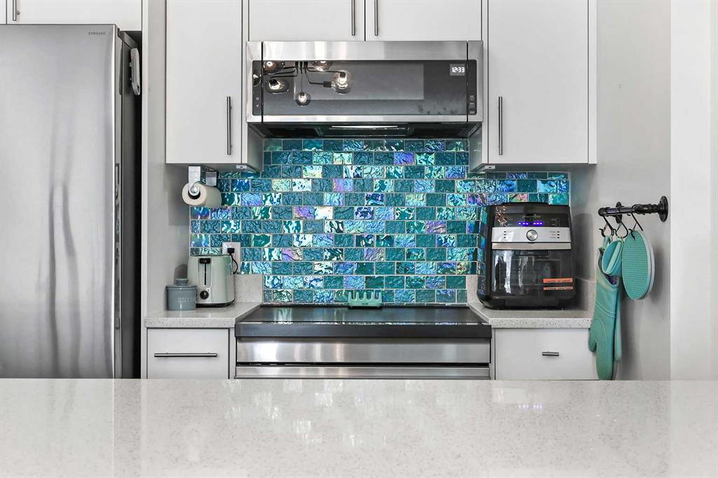 Discover an incredible opportunity to own a BEAUTIFULLY RENOVATED condo in the PRESTIGIOUS EAU CLAIRE district at an affordable price! Step inside to find a bright open-concept layout anchored in this 1 Bed/1 Bath condo in PRINCES CROSSING with sunny SOUTH EXPOSURE and lovely views from the 6TH FLOOR in this CONCRETE BUILDING. You'll fall in love with the designer KITCHEN showcasing ceiling- height CUSTOM CABINETRY featuring UPGRADED STAINLESS STEEL APPLIANCES including a sleek INDUCTION COOKTOP WITH CONVECTION OVEN, glass mosaic backsplash, QUARTZ COUNTERTOPS, and expanded eat-at island that seats four. Additional CUSTOM CABINETRY added to island for more storage. The spacious living area is bathed in natural light through large patio doors that open to your circular 180 degree balcony where you can take in the south URBAN SKYLINE AND WEST VIEWS. Renovated full bath with NEW VANITY, QUARTZ COUNTER-TOP, mirrored storage cabinet and DEEP SOAKER TUB. Updated baseboards, lighting and hardware throughout. Smart details like IN-SUITE LAUNDRY and a SPACIOUS STORAGE ROOM (big enough for a bike and more) make everyday living easy and organized. Pets allowed with Board approval. Princes Crossing offers a variety of lifestyle amenities including a well-equipped fitness centre with steamroom, on-site convenience store, meeting room, concierge service and a heated underground parking stall. All of this just steps from Calgary's river pathways, fine dining and trendy cafes yet nestled on a quiet, tree-lined street in one of the city's most exclusive enclaves. Experience the best of downtown living - elegant, effortless and affordable!
