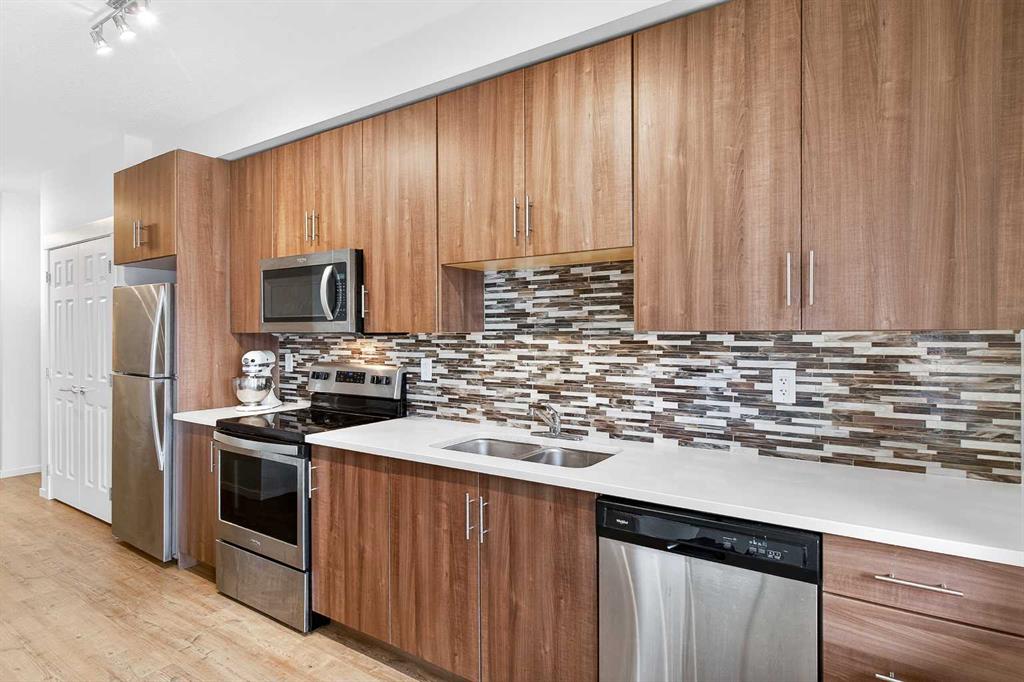 Immaculate 1 bedroom, 1 bathroom unit in Legacy Park, offered FULLY FURNISHED AND COMPLETELY TURNKEY — including all kitchen items and linens as viewed. This gorgeous unit is truly move-in ready or an ideal opportunity for an investor looking to rent immediately. Ideally located on the 2nd floor with an east-facing exposure and 9’ ceilings, the open living area features an electric fireplace and oversized patio doors that flood the space with natural morning light and lead to a sunny balcony with natural gas hookup, perfect for relaxing or entertaining. The modern kitchen offers stainless steel appliances, quartz countertops, full backsplash, and full-height cabinetry with excellent storage and workspace. The spacious primary bedroom, in-suite laundry, and a well-appointed 4-piece bathroom complete the interior. Titled heated UNDERGROUND PARKING and an assigned storage locker add everyday convenience. Walk to shops, restaurants, transit, schools, and pathways. A fantastic opportunity!