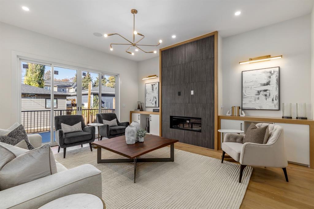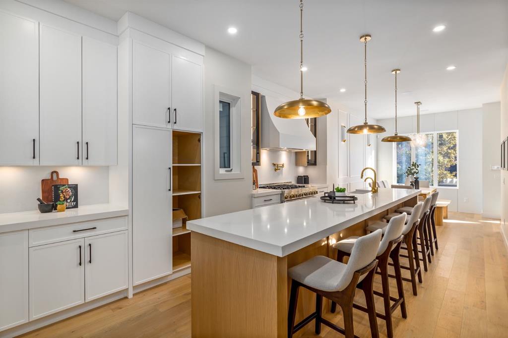 OPEN HOUSES Sat Jan 31st, 2-4PM & Sun Feb 1st 4-6PM! Experience elevated inner-city living with this impeccably designed, brand-new home nestled in one of Calgary’s most sought-after neighbourhoods: Hillhurst. Constructed by a trusted local builder known for craftsmanship, functionality, and aesthetic excellence, this 2-storey residence offers 2,224 SF above grade, with a fully developed basement, 4 bedrooms, and 4.5 bathrooms—a perfect blend of modern luxury and thoughtful detail. From the striking brick facade to the high-end engineered wide plank oak hardwood, every inch of this home exudes quality. The main floor welcomes you with a built-in entry feature and a front formal dining area, accented by elegant wall mouldings, white and gold sconces, and a designer chandelier. At the other end, an open-concept living room is a showstopper, featuring a large-format textured tile fireplace, custom built-ins with display lighting, and massive patio sliders leading to a west-facing, 135-ft deep backyard with a raised patio and gas line—ideal for indoor-outdoor entertaining. The chef’s kitchen is nothing short of stunning, complete with a 2.5" thick quartz island, panel-ready fridge/freezer with knurled handles, sleek quartz countertops, a gas range with pot filler, and backlit display cabinets framing the custom hood fan. You’ll also find a farmhouse sink, full slab backsplash, hidden coffee/appliance nook, built-in pantry, and a drawer-style microwave—each designed to inspire culinary creativity. Tucked behind a barn-style sliding door, the den offers a quiet workspace with a built-in desk, shelving, and bright window. The mudroom, also with a barn door, features tiled flooring, a built-in bench, and a large closet for seamless organization. Upstairs, each of the three spacious bedrooms come with walk-in closets and custom built-ins, along with private ensuites. The primary is sure to impress with vaulted ceilings, a LED-lit feature wall, statement gold light fixture, and a spa-inspired ensuite that boasts a steam shower, dual vanities, and a standalone soaker tub with dramatic black and white tile wall backdrop. A nearby laundry room offers convenience with a sink, folding station, shelving, and tile backsplash. The fully finished, carpeted basement, with 9-ft ceilings, is roughed in for in-floor heating and designed for comfort and versatility—featuring a spacious rec area, a TV wall with built-in components, a wet bar with lit display shelves and tile flooring, a full bath, and a large fourth bedroom with built-ins including a desk. An efficient mechanical room completes the lower level, with additional upgrades including solid core doors and built-in speakers throughout the entire home. Perfectly situated just steps from shops along 14 St NW and walking distance to Kensington Village, Calgary’s extensive river pathways, and the Downtown Core—this is urban luxury at its finest. Act now and make this exceptional Hillhurst property your forever home.