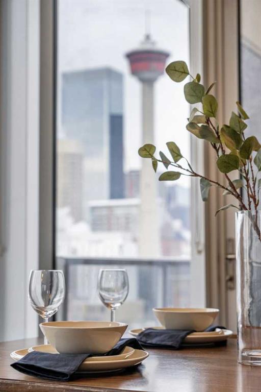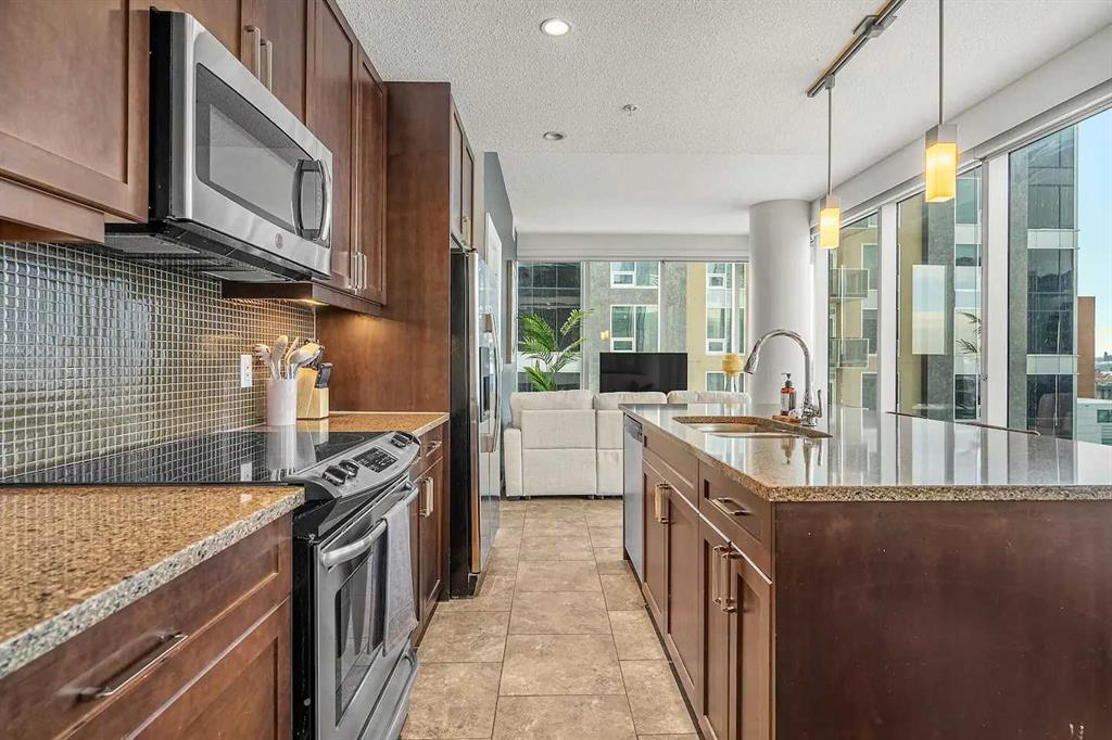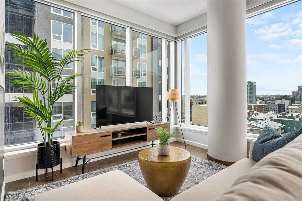 Experience Elevated Urban Living at Nuera! Step into sophisticated city living in one of Victoria Park’s most coveted buildings—Nuera. This stunning corner unit offers uninterrupted views of downtown Calgary, including the iconic Calgary Tower, through dramatic floor-to-ceiling windows and soaring 9-foot ceilings that flood the space with natural light from the west facing windows. Designed with both style and function in mind, this expansive 2-bedroom, 2-bathroom residence is the perfect blend of modern luxury and everyday comfort. The chef-inspired kitchen is the heart of the home, featuring sleek granite countertops, stainless-steel appliances, rich cabinetry, and a breakfast bar—ideal for entertaining or casual dining. The open-concept layout flows effortlessly from the kitchen to the designated dining area and bright, inviting living room, which opens onto a spacious private balcony with panoramic city views. The primary suite is a true retreat, complete with a generous walk-through closet with dual sides and a well-appointed 4pc ensuite. The second bedroom is thoughtfully positioned on the opposite end of the unit for optimal privacy—perfect for guests or a home office—and is paired with a stylish 3-piece bathroom just steps away. Additional features include in-suite laundry, a titled underground parking stall, secure storage, bike storage, and access to a state-of-the-art fitness centre. The building also offers the peace of mind of full-time security, concierge service, and underground visitor parking. All this in a prime location—just steps to the downtown core, C-Train, Sunterra Market, and the vibrant energy of 17th Avenue’s dining and boutique scene. Luxury. Convenience. Location. This is city living at its finest. Book your private showing today!