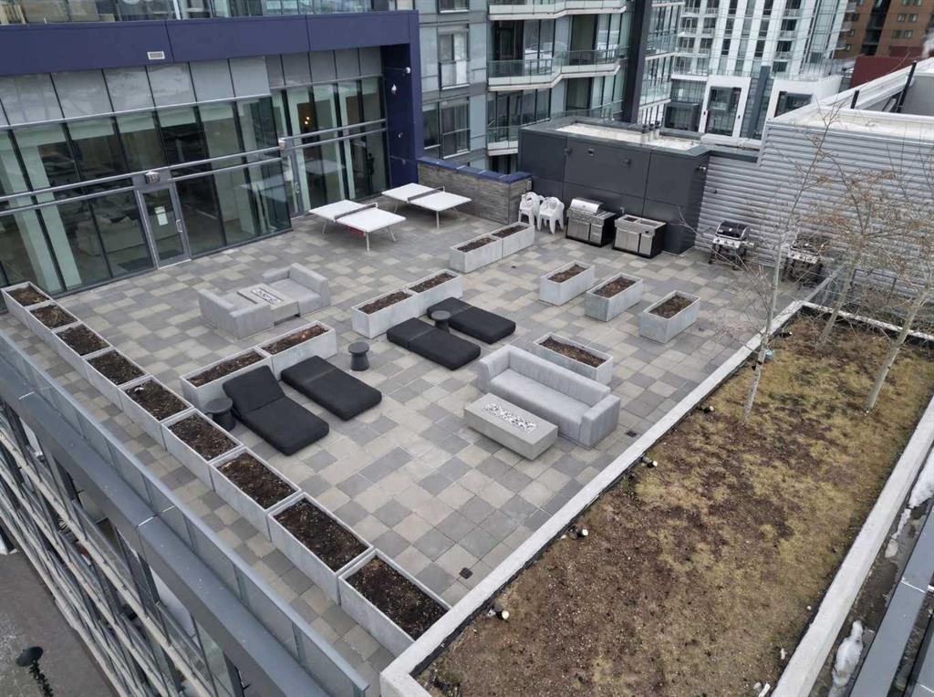 This is downtown living at its best. Welcome to this stunning corner unit in The Verve, located in the heart of East Village — one of Calgary’s most vibrant and walkable communities. This modern 2-bedroom, 2-bathroom condo features floor-to-ceiling windows with panoramic west-facing views, an open-concept layout flooded with natural light, and a sleek kitchen complete with quartz countertops, built-in oven, electric cooktop, and fully integrated appliances. The bright corner primary bedroom offers a stylish 3-piece ensuite, while the second bedroom is thoughtfully positioned on the opposite side of the unit beside a full 4-piece bathroom — ideal for guests, roommates, or a home office. Additional highlights include full-size in-suite laundry, central A/C, custom blinds, and a covered west-facing balcony with a BBQ gas line and space for patio furniture. The Verve offers exceptional amenities including full-time concierge, a fully equipped fitness centre, large social lounge with outdoor patio and fire tables, guest suites, bike storage, visitor parking, and a spectacular 25th-floor rooftop patio with breathtaking views of the downtown core, mountains, and river valley. All just steps from the River Walk, Bow River pathways, St. Patrick’s Island, Studio Bell, the Central Library, restaurants, cafés, and more. Underground titled parking and assigned storage included — an exceptional opportunity to own a premium corner unit in one of Calgary’s most desirable downtown locations.