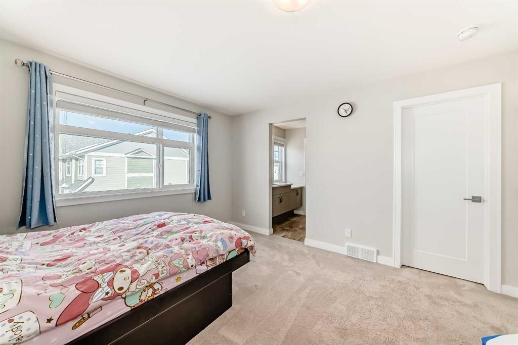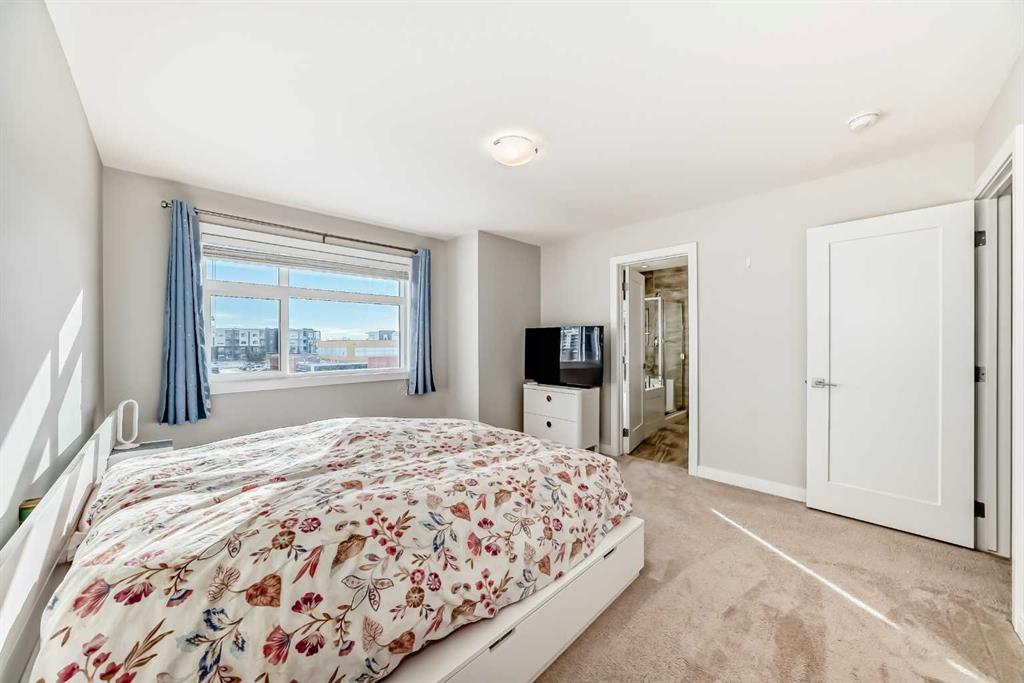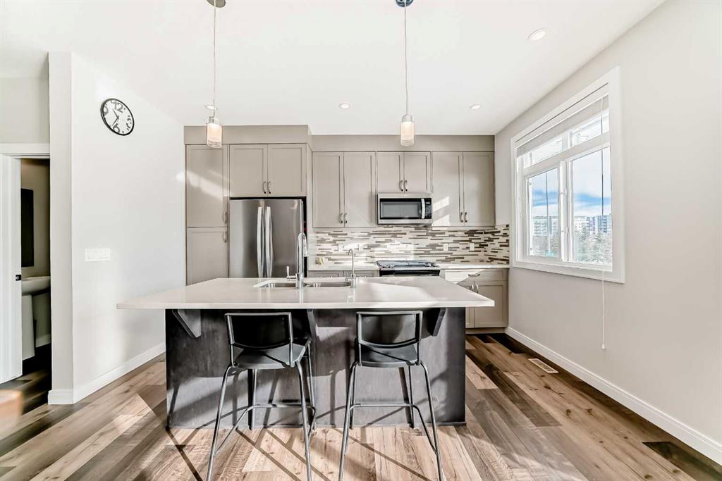 Located in the desirable community of West Springs, this well-maintained three-storey townhouse offers bright, functional living space throughout. The entry level features 9-ft ceilings, tile and laminate flooring, and a spacious den/office. The main floor showcases 9-ft ceilings and laminate flooring, with a generous kitchen featuring quartz countertops, stainless steel appliances including a gas stove, and a large island with a flush eating bar. The open layout flows into the dining area and spacious living room with a study nook/additional paly area, plus a 2-pc bathroom and access to the west-facing balcony. Upstairs offers two huge primary bedrooms, each with a walk-in closet and private ensuite. One ensuite includes double sinks, a soaker tub, and separate shower. Laundry is conveniently located on this level. The fully finished basement adds a third bedroom, a 3-pc bathroom, and a long storage room. Additional features include a double attached garage, front patio, A/C, and plenty of natural light. Walk to shopping, restaurants, schools, pathways. Pride of ownership throughout.