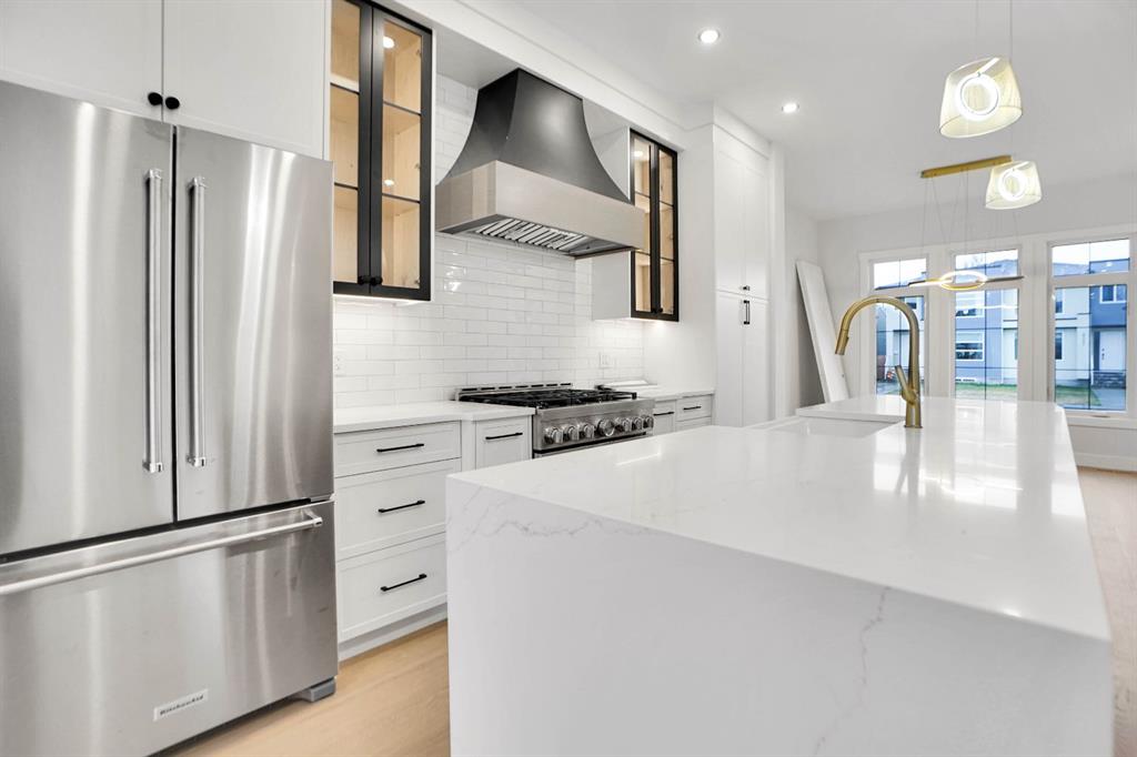 Brand-New Luxury Infill in Bowness | Legal 2-Bedroom Suite | South Backyard Luxury + Income Potential + Lifestyle – All in One Home. Move right in to this stunning, never-lived-in luxury infill featuring a bright open floor plan, designer finishes, and a legal 2-bedroom basement suite for rental income or multigenerational living. Enjoy a chef-inspired kitchen with quartz countertops, warm wood accents, premium stainless steel appliances, and a show-stopping waterfall island. The living room boasts a modern fireplace with custom built-ins and opens to a sunny south-facing backyard – perfect for entertaining. Upstairs, a spa-like primary suite with walk-in closet, dual sinks, freestanding tub, and glass custom shower, plus two additional bedrooms and full bath. The bright basement suite offers its own kitchen, laundry, private entrance, and full bath – ideal for guests or tenants. Prime location near Bow River pathways, Bowmont Park, Market Mall, Winsport, schools, and quick highway access to the mountains.