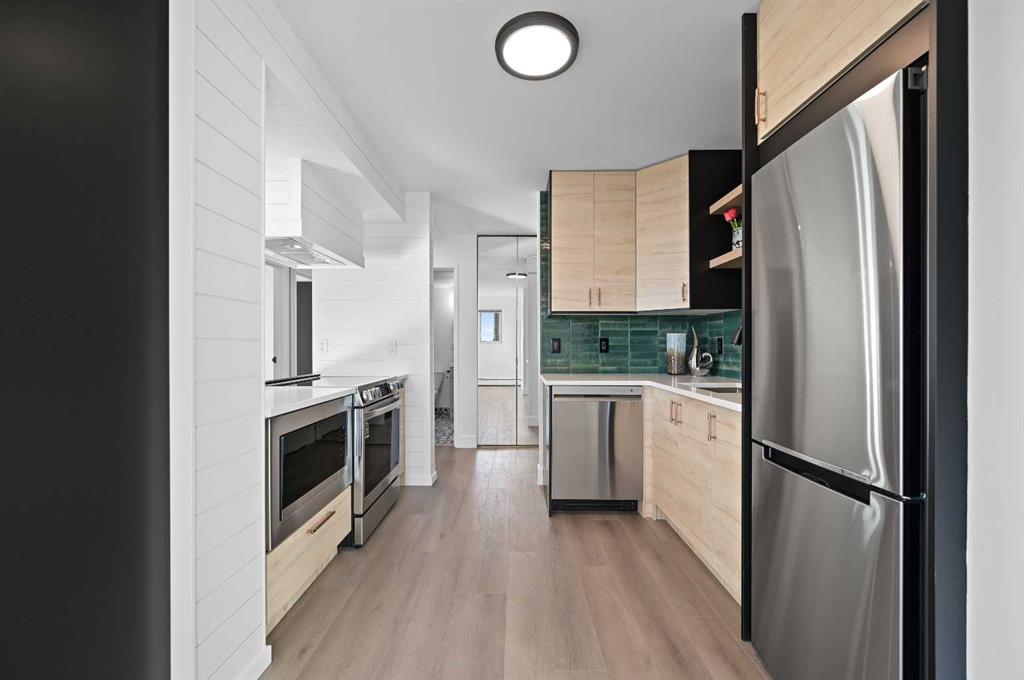 MOVE IN READY!! Welcome to this beautiful fully updated and refinished 2 bedroom and 1 bath south facing PENTHOUSE with great city views. All new appliances with manufacturers warranty for peace of mind. You will fall in love with the gorgeous kitchen with new cabinets, designer tile and ship lap features along with quartz countertops and a fantastic butler's pantry for even more wow. The large wrap around balcony provides even more city views and lots of room to entertain. There is new in-suite laundry adding another level convenience. This unit also features beautiful waterproof luxury vinyl plank flooring throughout. Underground secure heated parking is included. Additional parking in the gated secure ground level can be privately rented. Don't miss this opportunity to call this place home at an affordable price!