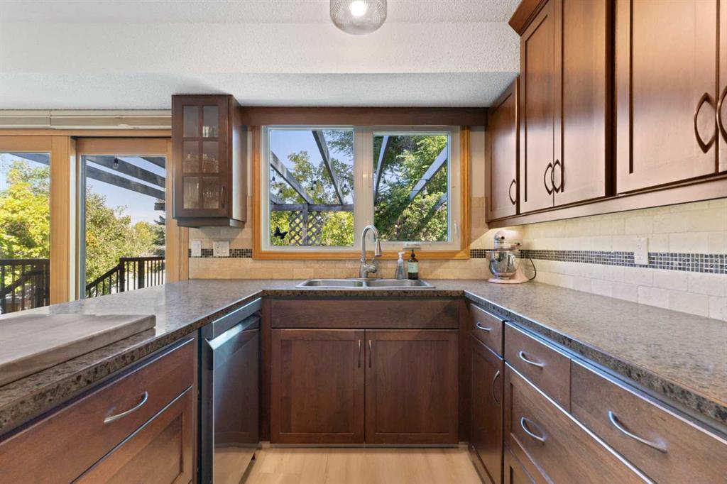 Beautifully updated 4-level split in the heart of Oakridge offering 2,446 sq ft of total living space (1,315.93 sq ft above grade). From the landscaped yard and brick column entrance to the newly levelled driveway curb, this home shows pride of ownership inside and out. The main level features a bright living room with skylight, large windows, and a stone-faced fireplace, a formal dining area, and an updated kitchen with espresso-stained cabinetry, 5-burner gas stove, brand new stainless steel appliances, ample counter space, and breakfast nook with patio doors to the private backyard and deck. The open-to-below family room offers a second fireplace, wainscotting, and flexible space for a playroom or office. A powder room, laundry with new washer/dryer, another guest bedroom, and side access to the oversized heated garage complete this level. Upstairs are three bedrooms and two renovated bathrooms, including the primary suite with its own fireplace, closet space, and sleek ensuite. Pot lights brighten the upper hallway, while new sconces add warmth in the living room. The lower level provides a versatile recreation spaces (currently used as a shop) and tons of storage! Extensive updates include: new LVP flooring, appliances, washer/dryer, heat pump, smart thermostat, electrical panel, fire alarms/CO detectors, attic insulation, light fixtures, bathroom fixtures, electrical outlets, new baseboards and paint throughout, new deck boards and railing, and epoxy flooring in the basement. A custom front door will be installed prior to possession. The private backyard is a retreat, with mature trees, gardens, and a full-sized deck. Located steps from Glenmore Park, schools, paths, shopping, and the community rec centre, with quick access to Southland Drive and Stoney Trail.