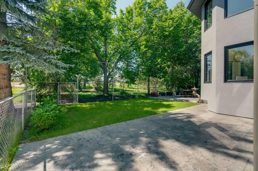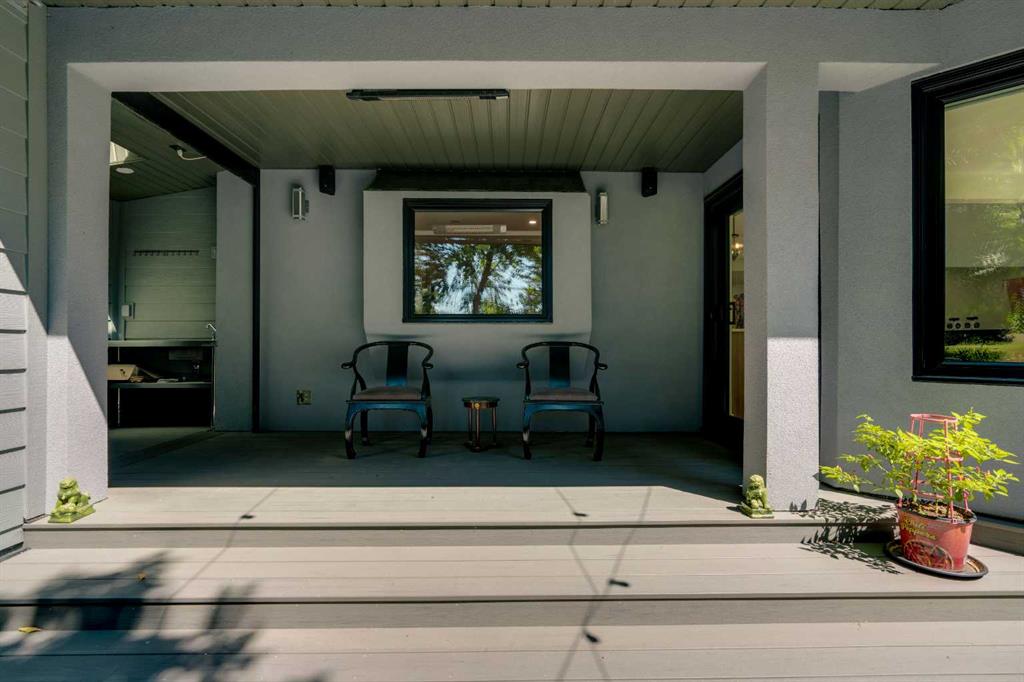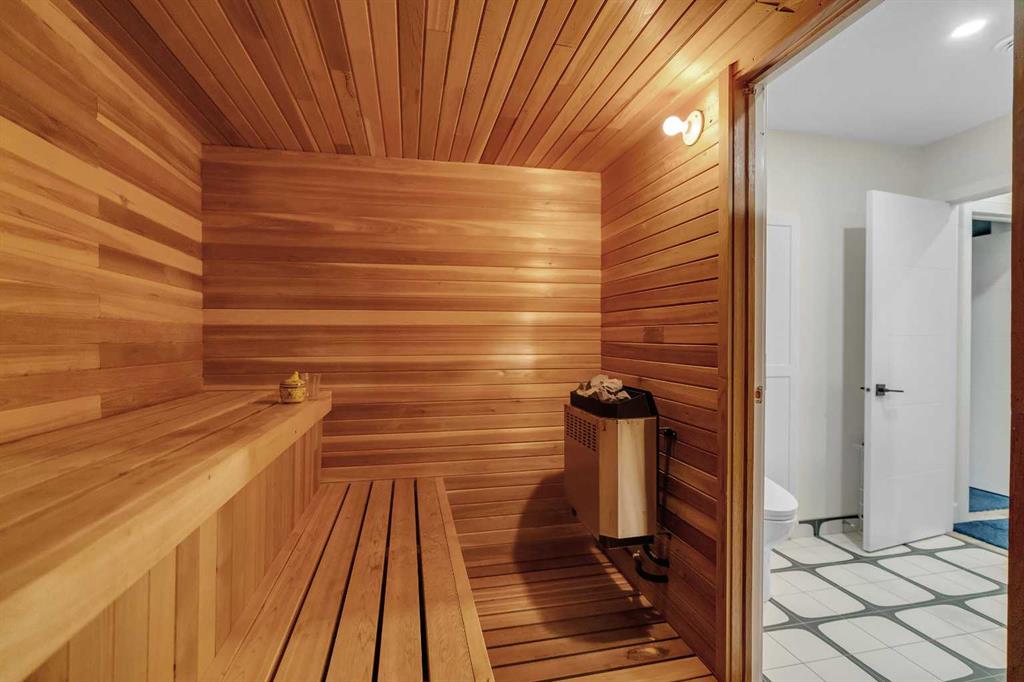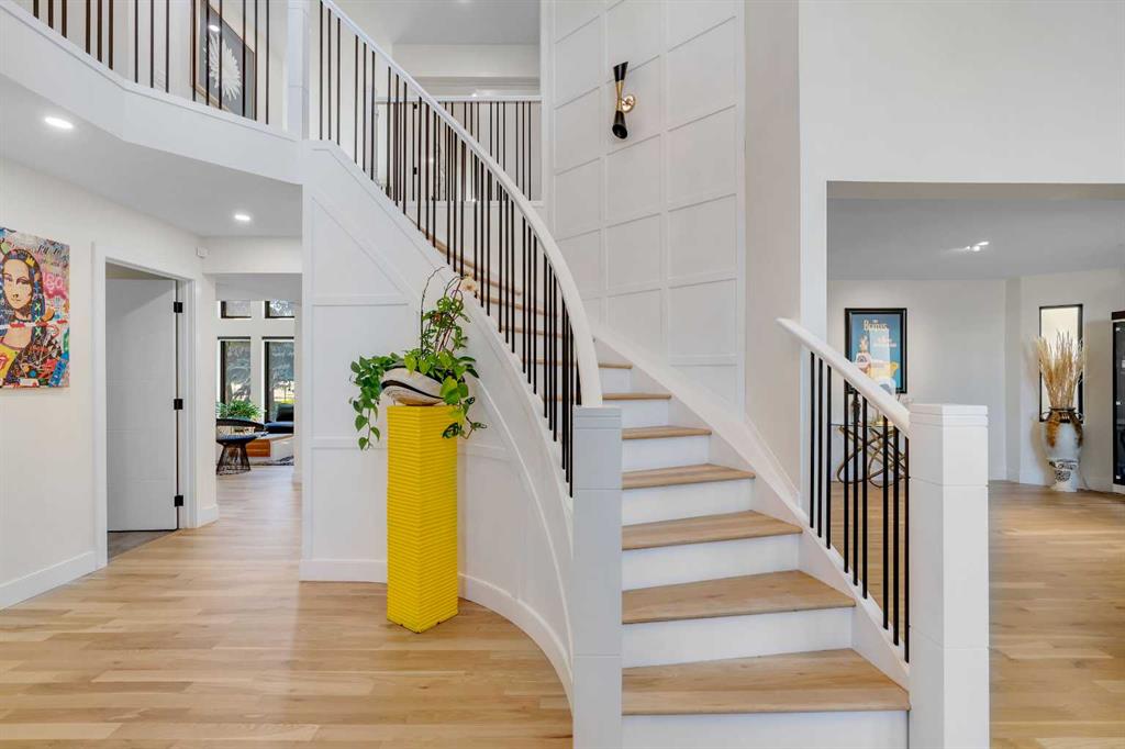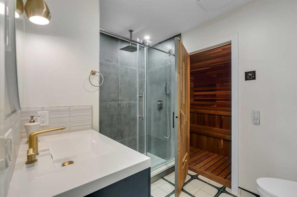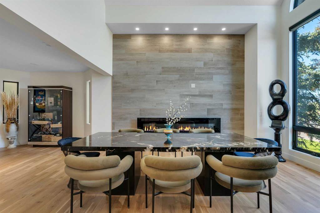 This showstopping residence blends architectural sophistication with modern luxury, backing directly onto a serene green space with a sun-filled south-facing backyard. Spanning over 3,000 sq ft above grade plus a fully finished basement, this extensively renovated custom home delivers an unforgettable living experience tailored for both refined entertaining and comfortable family living. The main level is defined by designer finishes, white oak hardwood, and expansive black-trimmed triple-pane windows that flood the space with natural light and frame peaceful views of the treed landscape beyond. The soaring open to above living room is anchored by a dramatic feature wall with a sleek fireplace, while the adjacent front-facing family room complete with its own fireplace and soaring ceiling offers versatility as a formal dining space or lounge. At the heart of the home, the gourmet kitchen is a true chef’s haven, showcasing a quartz waterfall island, full-slab backsplash, designer cabinetry, custom hood fan, and premium integrated appliances including a 6-burner gas cooktop, Thermador fridge, Miele dishwasher, built-in oven, steam cooker, and warming drawer. A sunny breakfast nook with built-in seating opens to the covered deck, ideal for al fresco dining while overlooking the yard and park beyond. A stylish powder room and a spacious mudroom with built-in laundry and a convenient dog wash complete the main level. Ascend the elegant curved staircase to discover a swoon-worthy primary retreat that impresses with its grand proportions, serene sitting area, and private balcony overlooking the treetops. The spa-inspired ensuite features dual sinks, heated floors, and an oversized steam shower, while the large walk-in closet completes the experience. Three additional bedrooms are thoughtfully positioned on the opposite side of this level, alongside a stylish 5-piece bathroom with dual sinks to keep busy mornings stress-free. The basement is an entertainer’s dream, complete with a full wet bar with beverage fridge, a mood-lit rec room perfect for movie nights and social gatherings, two additional bedrooms, a 3-piece bathroom, and a rejuvenating sauna. Outside, the south-facing backyard is a private sanctuary with two patio areas, grassy play space, and a unique enclosed shed with skylight perfect for gardening or creative use. Extensive upgrades include hardwired motorized blinds, custom millwork, updated plumbing and electrical, new roof, exterior foam insulation and stucco, driveway extension, EV charger, heated garage with epoxy floors, water filtration system, motorized deck screens, Gemstone lighting, and more. Located just steps from Fish Creek Park, community ponds, and walking trails, this extraordinary home is an unparalleled blend of thoughtful design, luxurious comfort, and timeless appeal.