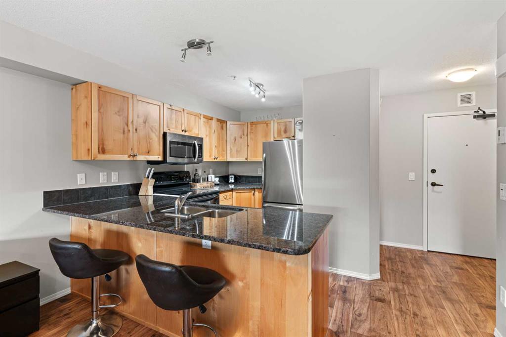 Wake up to unobstructed mountain views in this bright and stylish 1 bedroom + den condo in Canmore. Perfectly positioned on the 3rd floor, this home captures endless light and sweeping vistas from every angle. Inside, an open-concept kitchen with granite countertops flows into the dining and living area, opening to a private balcony where the mountains feel like part of your living room. The bedroom shares the same incredible views, while the versatile den is perfect for a home office or guest space. Practicality meets lifestyle with an outdoor parking stall just steps from the entrance and an oversized 11’ x 7’ heated storage locker—the largest in the building. The community offers it all: a fitness centre, children’s playground, dog park, and workshop, plus direct access to trails that take you deeper into the Canmore lifestyle. This is more than a condo—it’s your front-row seat to the Rockies.