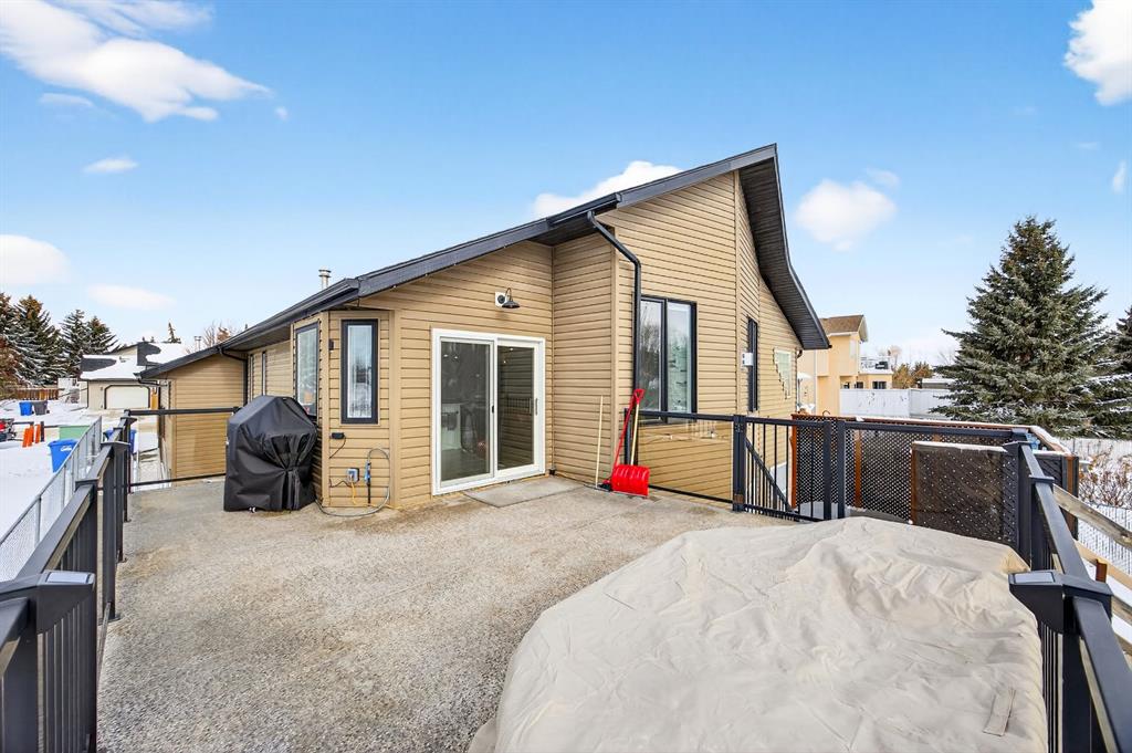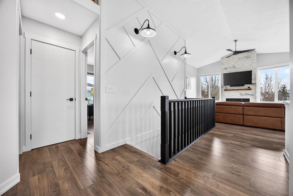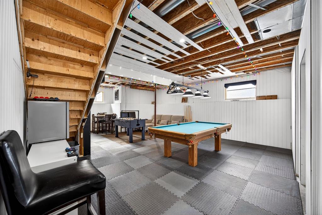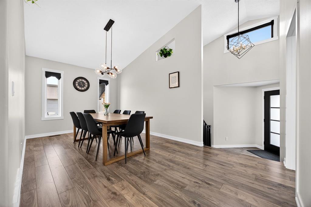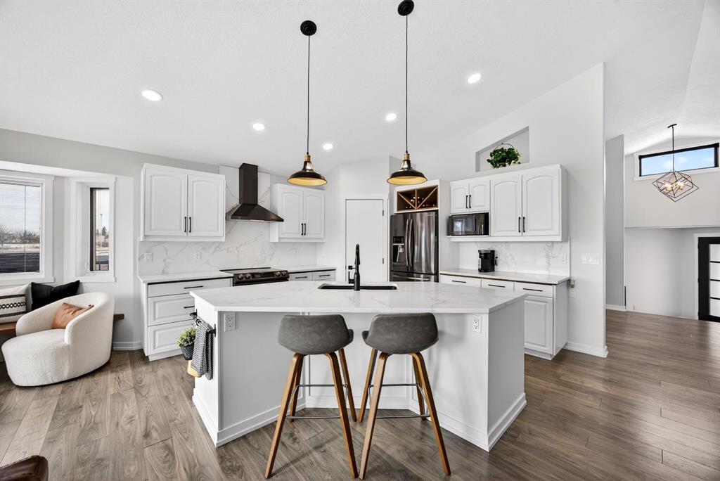 Welcome to this stunning raised bungalow offering over 2,700 sq ft of living space on a huge 7,500+ sq ft lot, complete with an oversized driveway large enough to accommodate an RV. This immaculate home has undergone extensive updates, including a newer roof, new furnace, new hot water tank, and impressive renovations throughout the main floor. Step inside to soaring 12+ ft vaulted ceilings and an open-concept layout that creates a bright, airy atmosphere. The fully renovated kitchen is a true showstopper, featuring quartz countertops, an undermount sink, beautiful vinyl plank flooring, and modern finishes throughout. The main living area is highlighted by a dramatic floor-to-ceiling stone accented gas fireplace, complemented by expansive brand new windows that flood the space with natural light. Several thoughtfully designed feature walls add character, including a welcoming front entry with built-in paneling and sliding barn doors. The centrally located laundry room features striking black wood accents and recessed lighting for a sleek, modern touch. A spacious separate dining room offers additional room for hosting family gatherings. The main floor includes two generous bedrooms: • A spacious primary bedroom featuring a large walk-in closet with built-in organizers and a private four-piece en suite bathroom • A second oversized bedroom featuring sliding barn-style closet doors Downstairs you’ll find two additional bedrooms, a four-piece bathroom, and a partially finished basement that includes a pool table — ideal for recreation or entertaining. The heated garage is exceptionally spacious, equipped with two separate single overhead doors and ample room for a full-size truck. Step outside to enjoy the large 16’ x 15’ deck, complete with built-in storage underneath, overlooking the expansive backyard. This beautifully updated property combines space, style, and functionality — a rare opportunity in Carstairs that truly must be seen to be appreciated. Absolutely stunning and move-in ready — this one will not last.