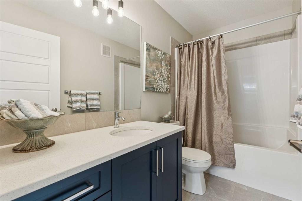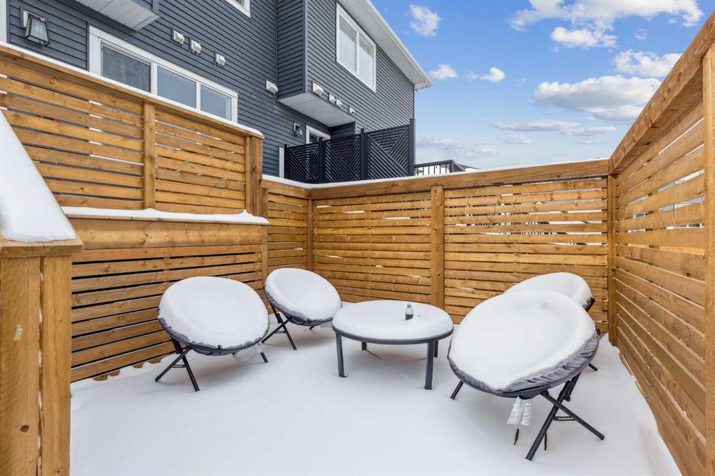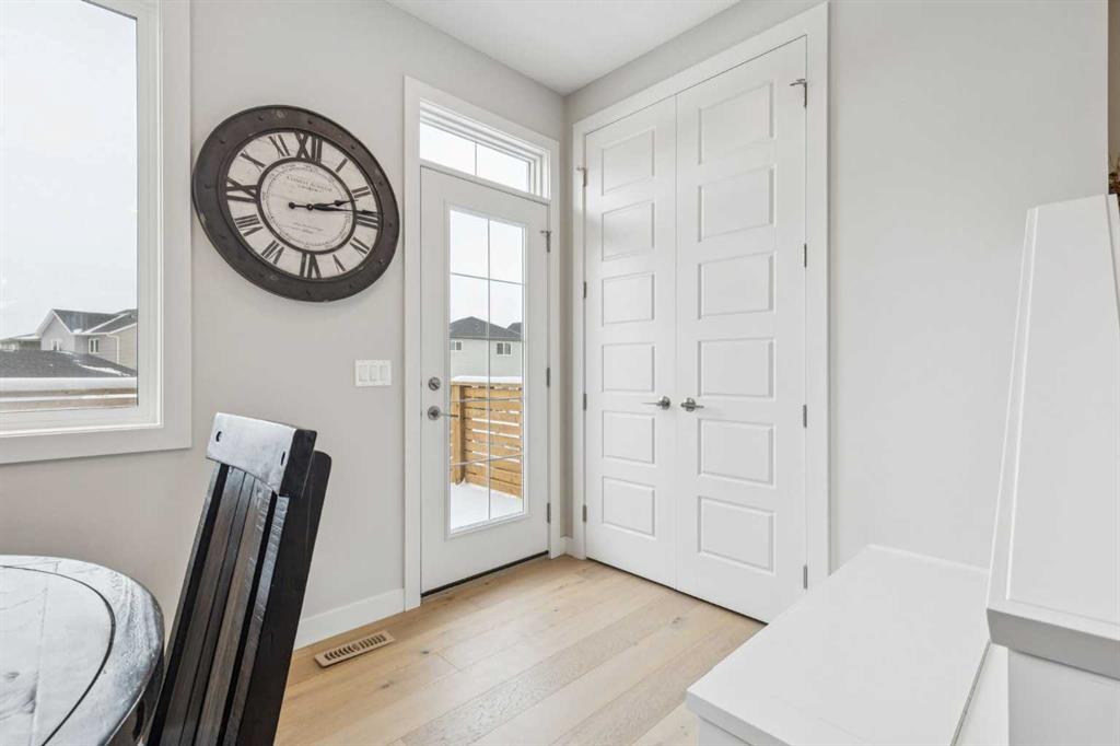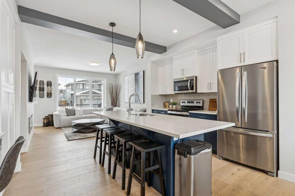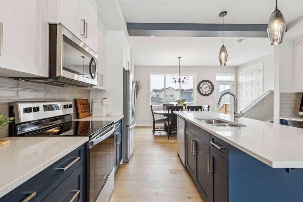 Located in the heart of Greystone in Cochrane, this home is just a short walk to parks, the Bow River, major shopping, and the extensive pathway system that runs along the river. Situated on a quiet street, you’ll love the east facing sun in the morning out back. Offering over 1,300 sq. ft. of thoughtfully designed living space, this beautifully upgraded 3-bedroom, 2.5-bath home blends style and function throughout. The open-concept main floor welcomes you with an impressive 8’ glazed front door, 9’ ceilings, and oversized windows making it feel so bright. Light Vinyl plank flooring flows seamlessly through the foyer, hallway, great room, kitchen, and nook, creating warmth and continuity. The kitchen is designed for both everyday living and entertaining. A 9’ single-level island with breakfast bar anchors the space, complemented by quartz countertops, dual banks of upper and lower cabinetry, a quad-door over-height pantry, 42” upper cabinets with painted bulkhead, pots and pans drawers, and soft-close doors and drawers throughout. The stainless steel appliance package includes a smooth-top electric range, microwave/hood fan combo, refrigerator, and built-in dishwasher. Exposed dropped beams add architectural character, while the bright great room and dining nook feature over-height windows and a full French rear door that leads to the backyard. A Napoleon “Entice” fireplace creates a cozy focal point. A double-door closet with built-in bench at the back completes the main floor. Upstairs, the spacious primary retreat features a 4-piece ensuite with twin undermount sinks, a large quartz vanity with drawers, ceramic tile flooring, and an oversized 5’ x 3’ maintenance-free shower. A bright walk-in closet is conveniently accessed from the bedroom. Two additional generously sized bedrooms with double-door closets share a stylish main bathroom with quartz countertops, undermount sink, and tile flooring. Second-floor laundry with ceramic tile adds everyday convenience. Perfect for families, investors, or downsizers, this home offers bright, spacious, and elegant living in one of Cochrane’s most sought-after communities.