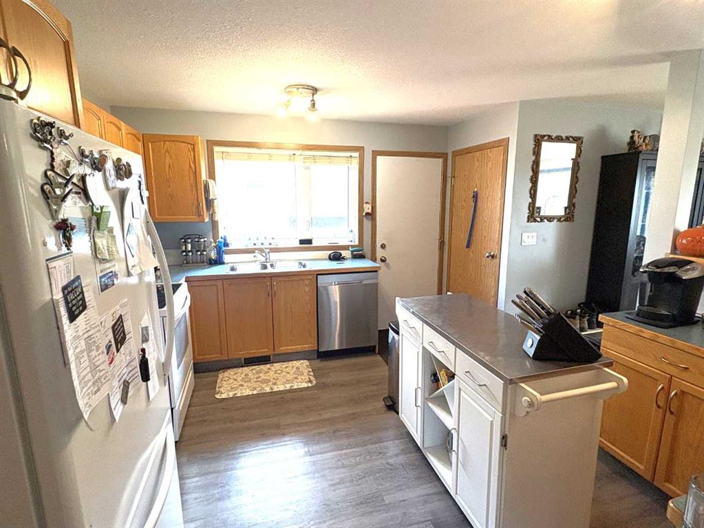 Take a look at this great family home. 1170 sqft. Bungalow, three bedrooms, 2.5 bathrooms. You will appreciate the open floor plan. Kitchen flows into a separate dining room. The living room has a cozy wood-burning stove for those cold winter nights. Primary bedroom has a two piece ensuite, two more nice size bedrooms, and a four piece bathroom. You will love the new renovated basement. The spacious family room has extra space for games table, two office/computer rooms. Possibility for these two rooms to be converted to bedrooms. Three piece bathroom with extra storage space and mechanical room. Some newer renovations over the years include. H.E. furnace, shingles, windows, hot water tank, flooring and a nice size deck. You will truly enjoy the outside space. Have your morning coffee on your new deck or patio area. Nice size backyard with a single detached garage with back lane access and a carport out front. This home is clean and move in ready. All this in the vibrant community of Forestburg.