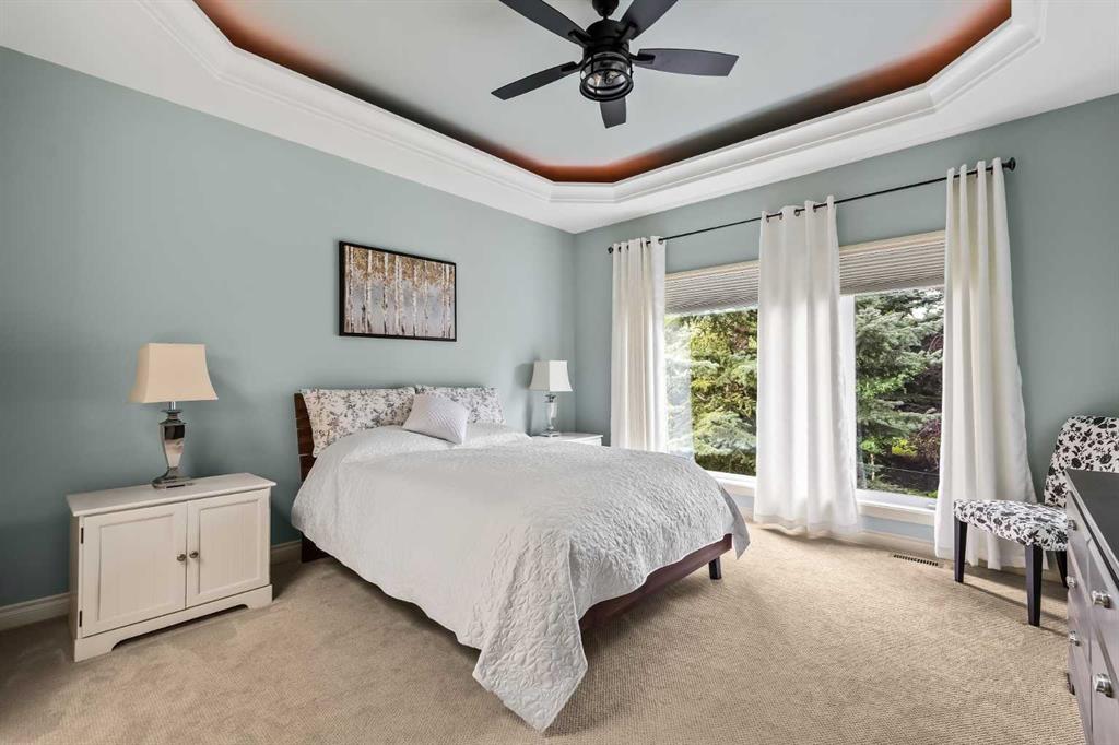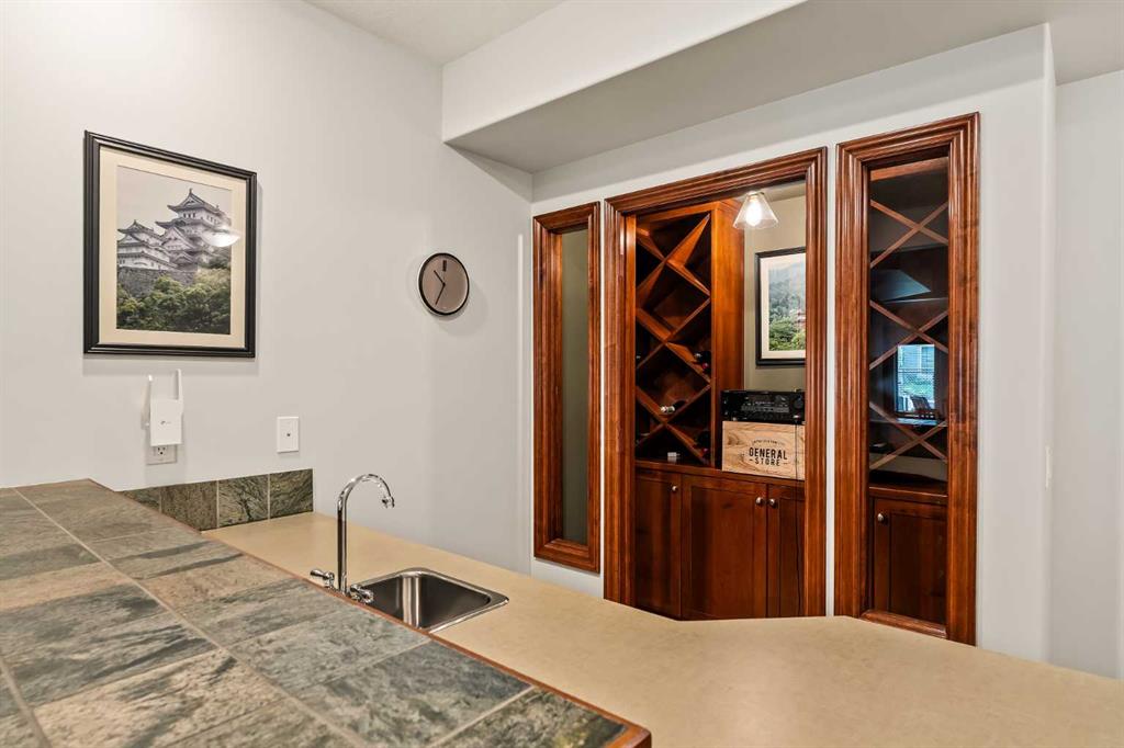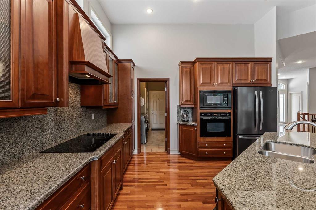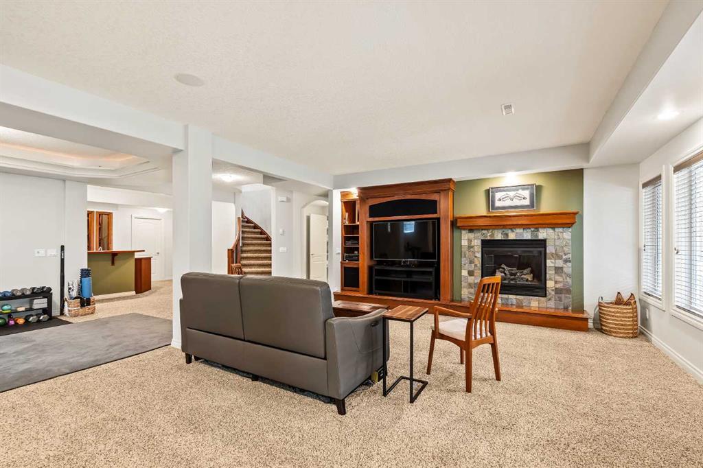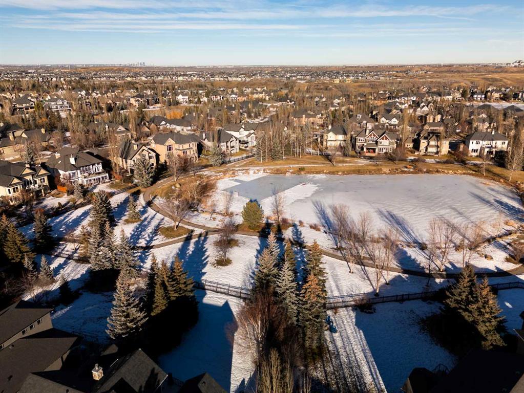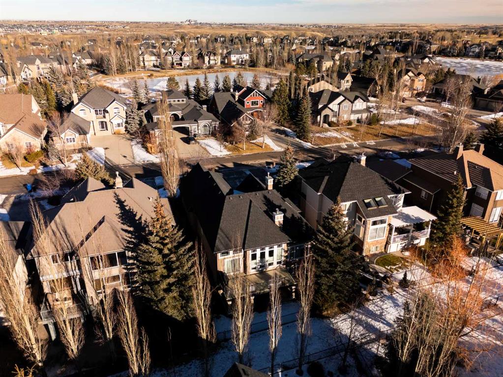 Luxurious, fully finished & beautifully updated, this walkout bungalow showcases exceptional craftsmanship & refined design throughout. Stunning curb appeal sets the tone, highlighted by an oversized double garage with in-floor heating and built-in speakers. Set within the picturesque lake community of Heritage Pointe & backing directly onto green space, the setting delivers privacy, views & a calm connection to nature rarely found so close to the city, with added peace of mind from the community’s independent water system and a full alarm system. Inside, soaring 12’ ceilings & an abundance of natural light elevate the main level, complemented by exotic cherry hardwood flooring & updated lighting for a warm, cohesive flow. A dedicated den with floor-to-ceiling built-ins offers an ideal home office, while a formal dining room framed by tray ceilings creates an elegant setting for hosting with built-in speakers. The open-concept layout unfolds with expansive windows, drawing the outdoors in. At the heart of the home, the chef’s kitchen impresses with granite countertops, custom cabinetry, stainless steel appliances & a large breakfast bar island. Adjacent dining adds everyday flexibility, while patio sliders open to the upper deck for effortless outdoor entertaining. Anchoring the main level, a spectacular living room centers around a striking fireplace with built-in speakers, creating an inviting space to unwind. The private primary suite is a true retreat, featuring a tray ceiling, oversized window, walk-in closet & a beautifully updated ensuite complete with an oversized skylight, deep jetted tub, oversized glass shower, heated floors, built-in speakers & dual vanities. A discreet powder room adds convenience. The walkout lower level is an entertainer’s dream, offering a spacious family room with built-in media area, gas fireplace, integrated storage & elevated seating, with built-in speakers throughout the family room and flex space. A pub-style wet bar with raised seating & a built-in wine cellar is ideal for entertaining, while an additional flex space suits fitness or hobbies. Two bedrooms & a 4-piece bathroom complete this level. Outdoor living continues with a covered lower patio overlooking green space, complemented by an easy-maintenance west-facing backyard with underground sprinklers and a garden shed. Located in sought-after Heritage Pointe, residents enjoy access to a private lake with sandy beach, parks, playgrounds & scenic pathways, all close to schools, shopping & dining, making this an exceptional opportunity to experience refined living in a truly special setting.