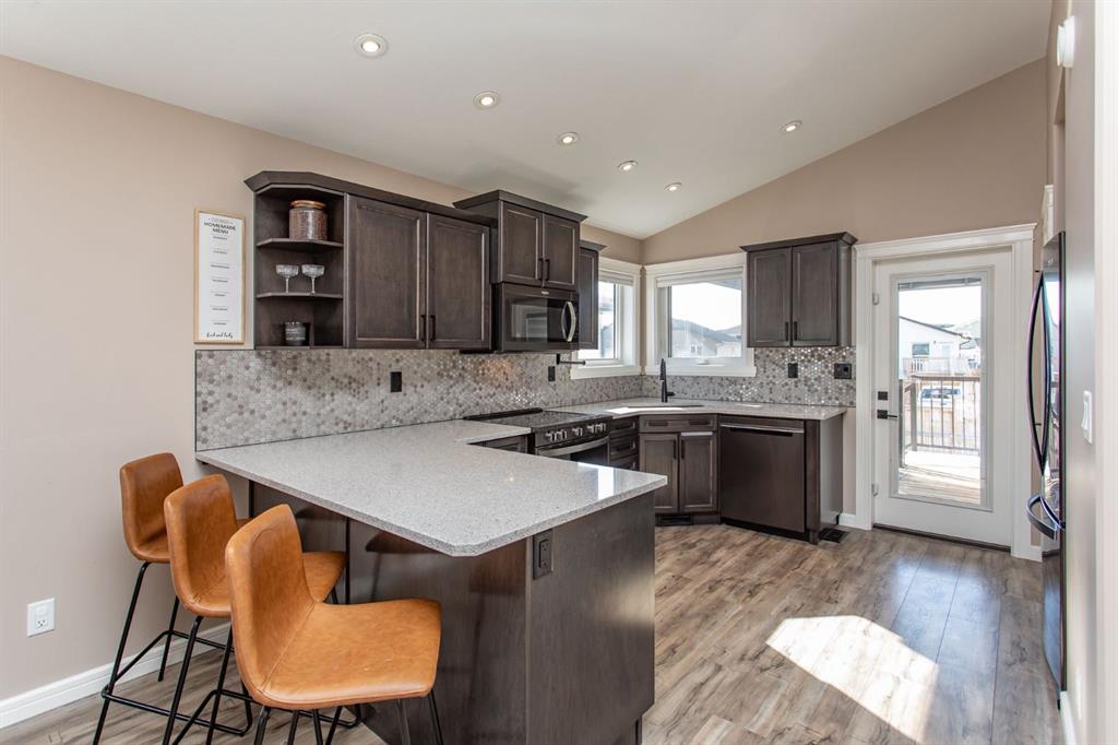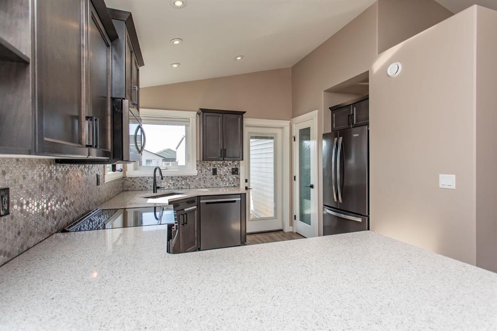 Lacombe is one of those towns people move to and don’t want to leave. It’s safe, the lots are bigger, the schools are great, and there’s a real sense of community here. You also get a lot of value for your money, with more than 2,300 sq ft of livable space in this air-conditioned home. Being a bilevel, it gives you that nice separation while still feeling open and bright. Walking up to the home, you’ll notice the curb appeal right away. Inside, you’re welcomed with a full tile entry and a few steps up into the main living space. The main floor offers 1,162 sq ft and the vaulted ceilings stand out immediately, carrying through the main living area. You’ve got a gas fireplace, open concept layout, and a kitchen that checks all the boxes with quartz countertops, stainless steel appliances, and a sit-up island. There’s also a pantry for extra storage and direct access to the covered back deck, which is perfect for BBQing even when it’s raining. Out back, the covered deck is a great bonus and leads into your south-facing yard, so you’re getting sunlight all day. The yard is fully fenced as well, making it ready for your animals or just giving you that extra privacy. Upstairs you’ll find two good-sized bedrooms, along with a spacious primary bedroom that really stands out. It features double closets, a full ensuite with quartz countertops, and a nice shower with a glass sliding door. Right across the hall is a full 5-piece bathroom, also with quartz countertops, making it a great setup for a growing family. Downstairs offers 1,039 sq ft and you’ll notice the extra ceiling height right away, which makes a big difference. The basement is fully developed with two large bedrooms, another full bathroom, and a good-sized laundry room. There’s also roughed-in in-floor heat, which is a nice upgrade if you ever want to take it that extra step. Overall, it’s a really well-built home with quality finishings throughout, in a town that continues to grow for all the right reasons. Come take a look and see what Lacombe has to offer.