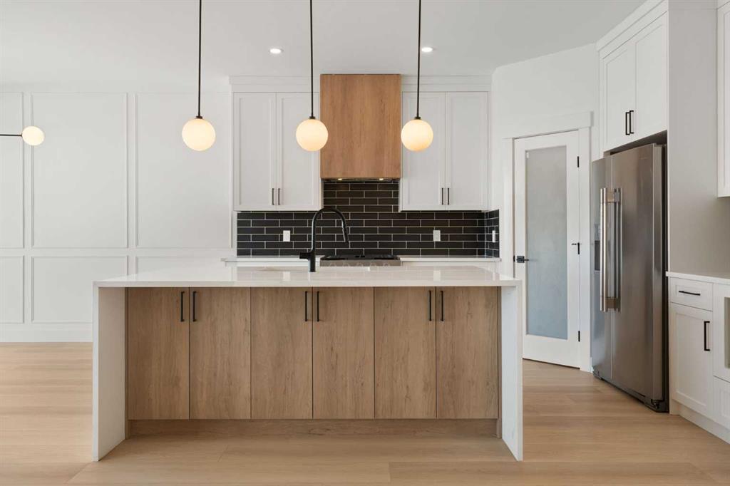 ELIGIBLE FOR FIRST HOME BUYERS GST REBATE. Experience refined canal-side living in this impeccably designed 1,892 sq. ft. walkout bungalow in the prestigious community of Lakes of Muirfield. Showcasing striking board-and-batten siding, rich stone accents, a covered front veranda, and a desirable side-drive triple garage, this home offers impressive curb appeal and elevated design from the moment you arrive. Inside, soaring vaulted ceilings and expansive windows create a bright, airy ambiance while beautifully framing the tranquil canal views. The chef-inspired kitchen blends sophistication and function, featuring quartz countertops, a dramatic waterfall island, custom white cabinetry complemented by warm wood accents, sleek black hardware, stainless steel appliances, statement pendant lighting, and a walk-in pantry. The open-concept layout flows effortlessly into the dining and living areas, with direct access to the full-length upper deck—perfect for seamless indoor-outdoor entertaining. Privately positioned, the primary retreat offers deck access and a spa-inspired five-piece ensuite complete with dual quartz vanities, a freestanding soaker tub, glass-enclosed shower, modern black fixtures, and elegant tilework—creating a serene, hotel-quality escape. Two additional bedrooms and a beautifully finished full bath complete the main level, offering flexibility for family, guests, or a refined home office. The fully developed walkout level is designed for elevated entertaining. A spacious theatre/media room with a dedicated wet bar creates the ultimate setting for movie nights and hosting. Two additional large bedrooms, a full bath, and generous recreation space ensure comfort and versatility, while oversized windows and direct patio access keep the lower level bright and connected to the outdoors. Enjoy multiple outdoor living areas, including the expansive upper deck and covered lower patio, all set against peaceful canal views and open prairie skies. The triple garage offers exceptional space for vehicles, storage, and recreational gear. Set within the sought-after Lakes of Muirfield community, residents enjoy championship golf, scenic walking paths, and a quiet, upscale atmosphere—just minutes to Strathmore and an easy drive to Chestermere and Calgary.
