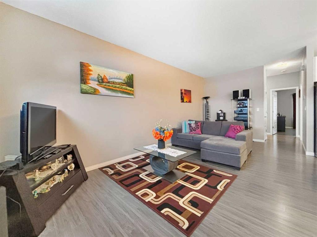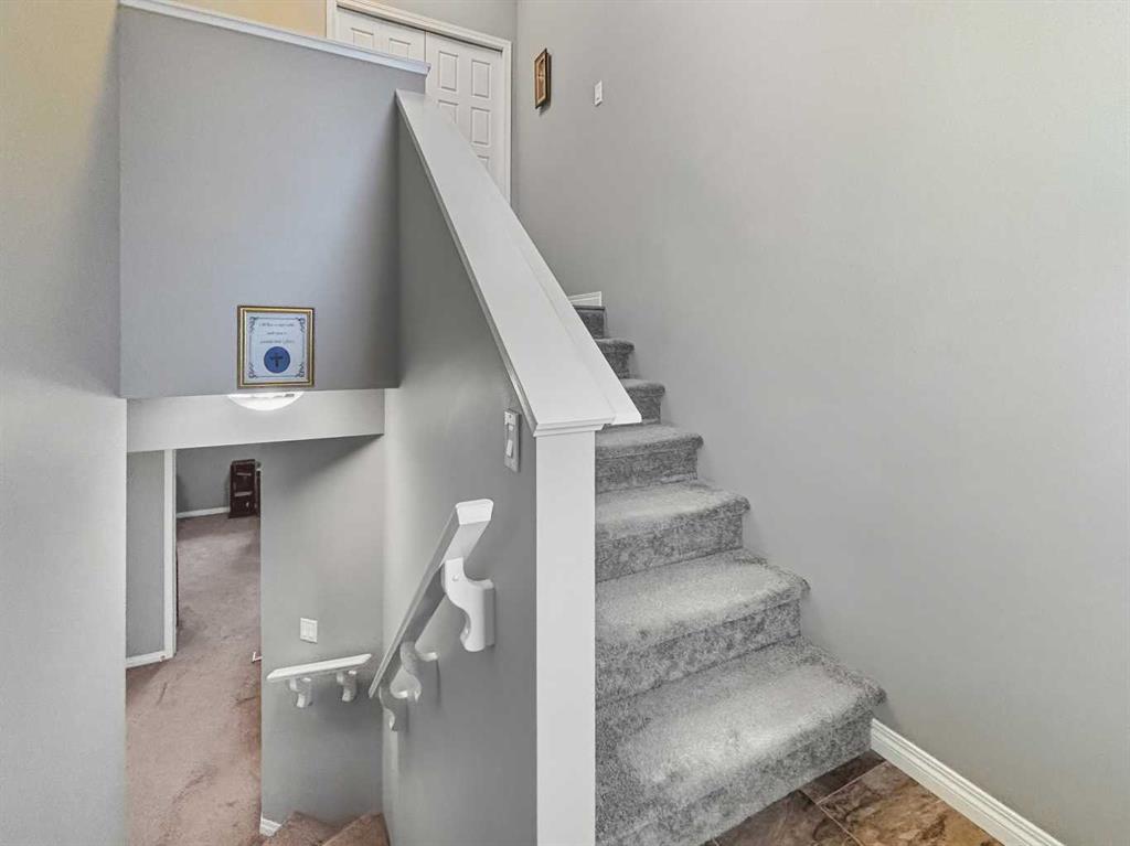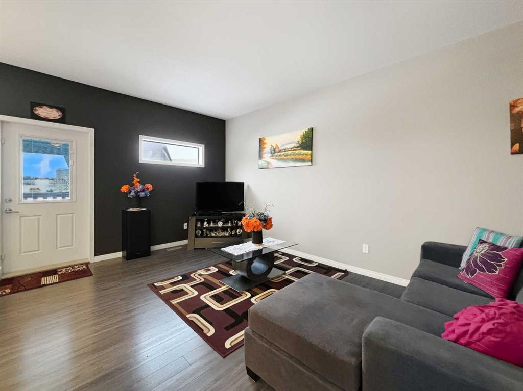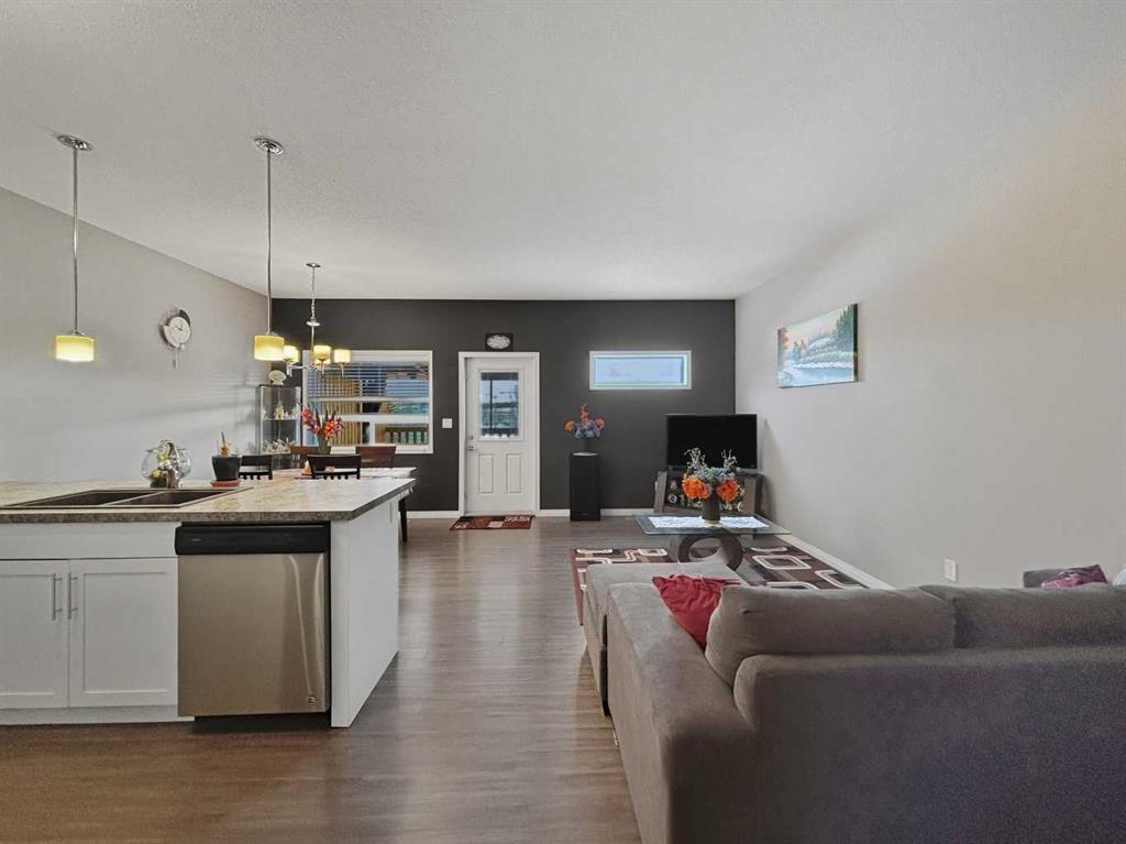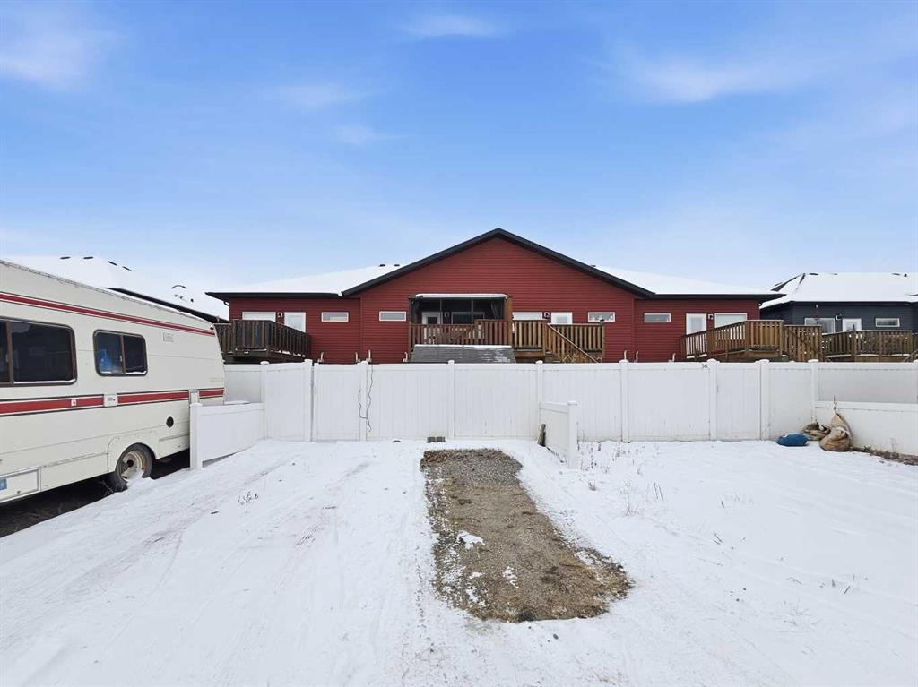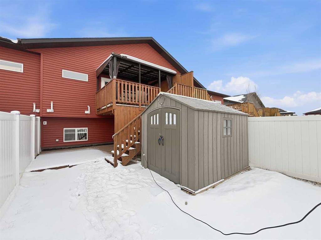 This beautifully maintained 3-bedroom, 2-bathroom townhome sits on a quiet close just steps from the Multi-Plex, schools, and a full range of shopping and services. With an easy 10-minute commute to Red Deer, the location is hard to beat. The main level offers a bright, open layout that seamlessly connects the kitchen, dining area, and living room. From the kitchen, a garden door leads to the east-facing covered deck, perfect for enjoying the morning sun. Below, you'll find an additional ground-level deck, a large storage shed, a fenced (white vinyl) backyard, and a double parking pad. The upper floor also features a comfortable bedroom and a 4-piece bathroom. Downstairs, the lower level presents a fantastic flex space. The expansive room with two walk-in closets could serve as a spacious primary bedroom, second living area, or multi-purpose room to suit your needs. This level also includes another bedroom, a second full 4-piece bathroom, convenient under-stair storage with shelving, and a stacked washer and dryer. Whether you're searching for a move-in-ready home or a hassle-free rental property, this one checks all the boxes.