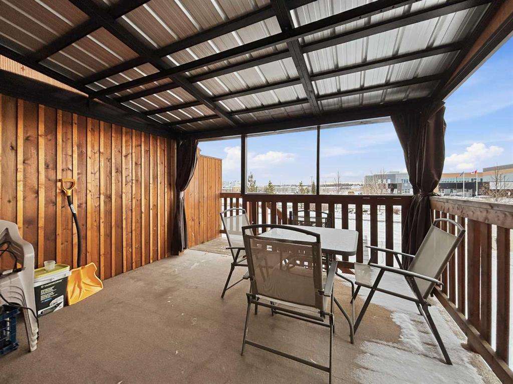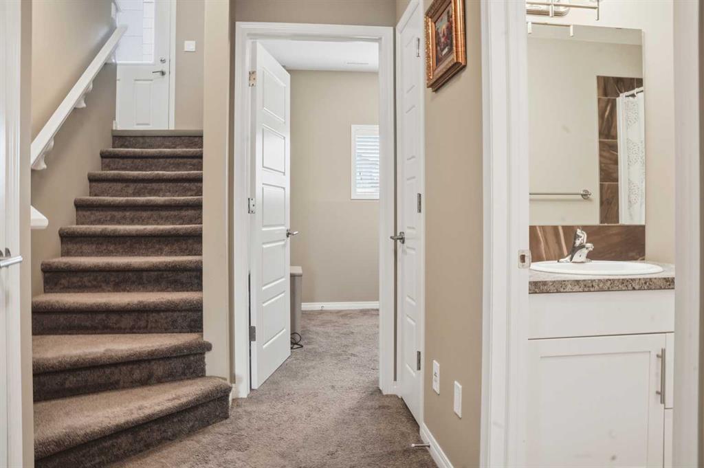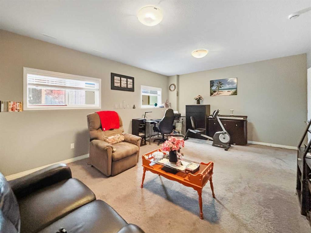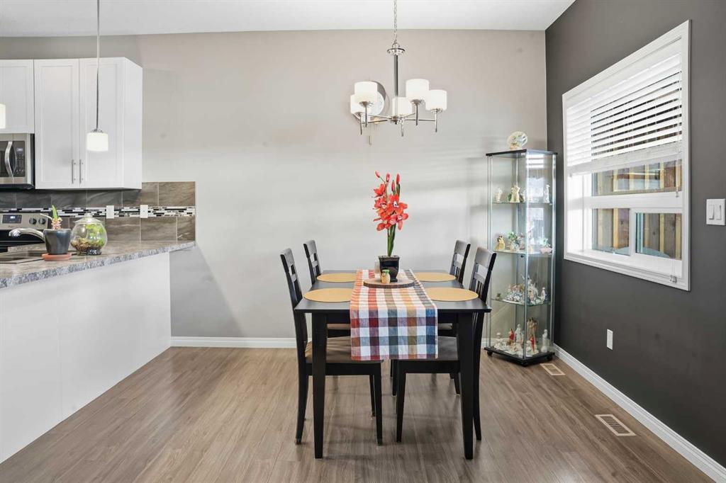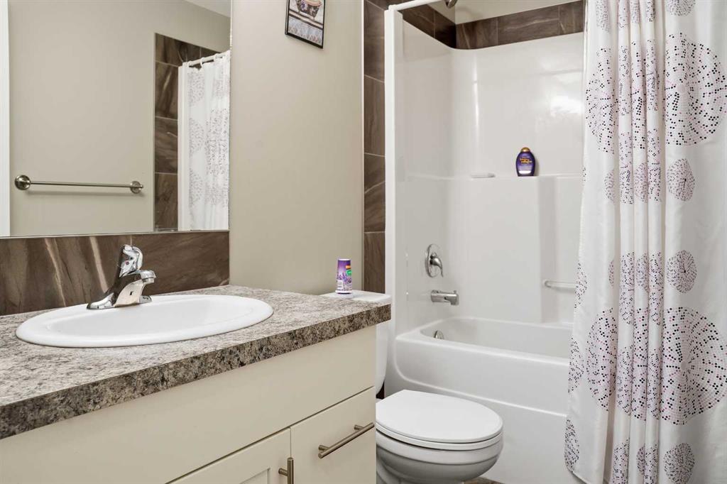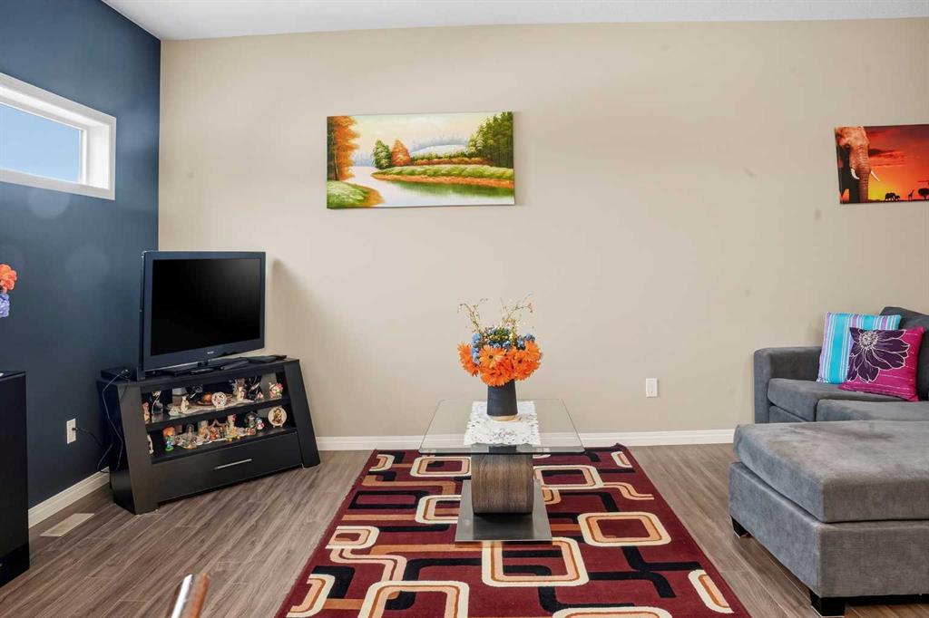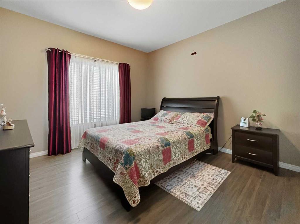 This beautifully maintained 3-bedroom, 2-bathroom townhome sits on a quiet close just steps from the Multi-Plex, schools, and a full range of shopping and services. With an easy 10-minute commute to Red Deer, the location is hard to beat. The main level offers a bright, open layout that seamlessly connects the kitchen, dining area, and living room. From the kitchen, a garden door leads to the east-facing covered deck, perfect for enjoying the morning sun. Below, you'll find an additional ground-level deck, a large storage shed, a fenced (white vinyl) backyard, and a double parking pad. The upper floor also features a comfortable bedroom and a 4-piece bathroom. Downstairs, the lower level presents a fantastic flex space. The expansive room with two walk-in closets could serve as a spacious primary bedroom, second living area, or multi-purpose room to suit your needs. This level also includes another bedroom, a second full 4-piece bathroom, convenient under-stair storage with shelving, and a stacked washer and dryer. Whether you're searching for a move-in-ready home or a hassle-free rental property, this one checks all the boxes.