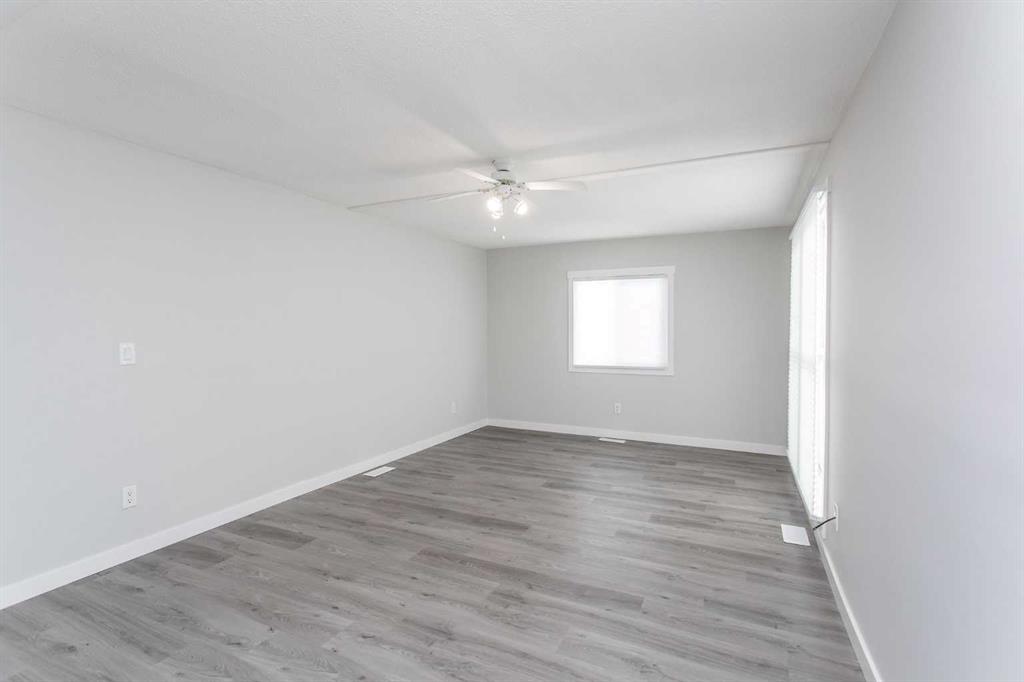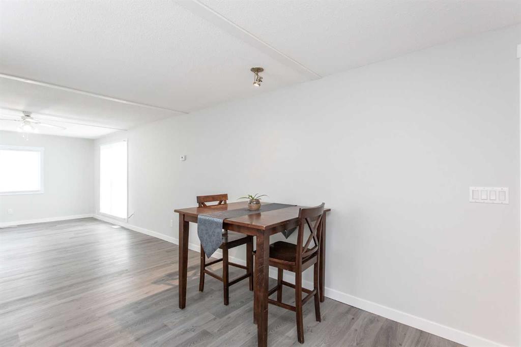 This updated 3-bedroom mobile home offers a comfortable layout with practical upgrades throughout. The entrance features a good-sized mud room with vinyl flooring and leads to one of the bedrooms located in the addition, complete with an electric heater. The main area of the home has been refreshed with a brand new kitchen, including white cabinets, laminate counters, tiled backsplash, updated appliances, and vinyl flooring. The living room is large and bright, with vinyl windows and vinyl plank flooring. The home continues with two additional bedrooms featuring brand-new carpet, plus a 4-piece bathroom with a new vanity and convenient in-bath laundry (stackable washer and dryer). Fresh paint, drywall throughout, newer trim, and updated interior doors add to the modern feel. The home has a metal roof, modern vinyl siding, and sits on a treed, fenced lot with a large deck for outdoor space. Furnace (approx. 1996) and hot water tank (2011) are in place; electrical is believed to have been updated by a previous owner.