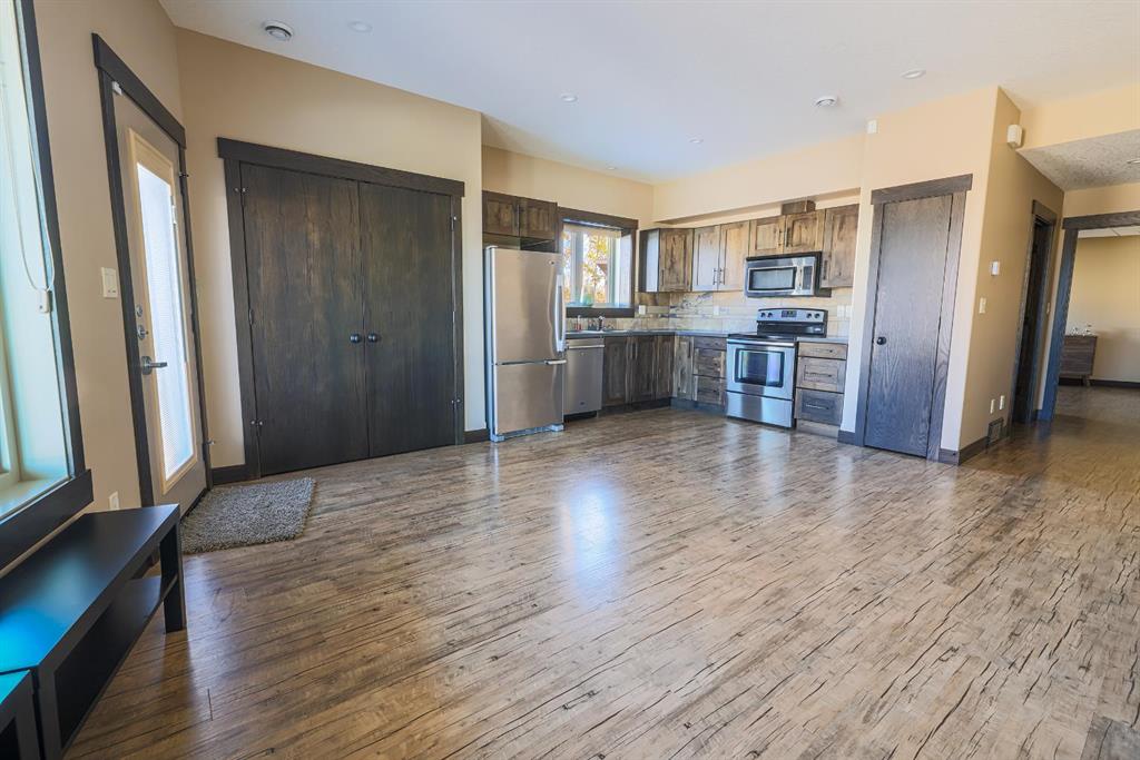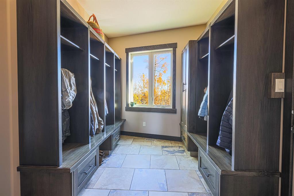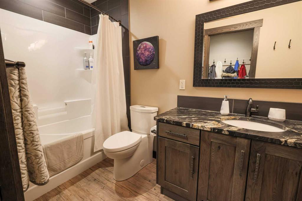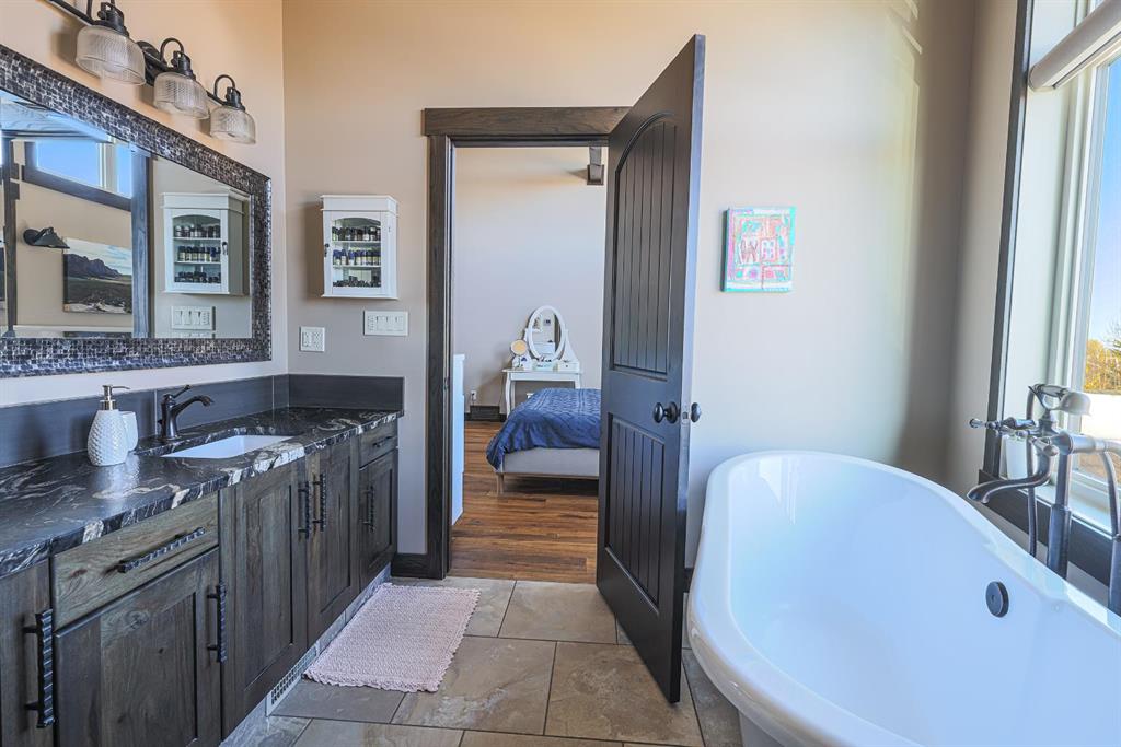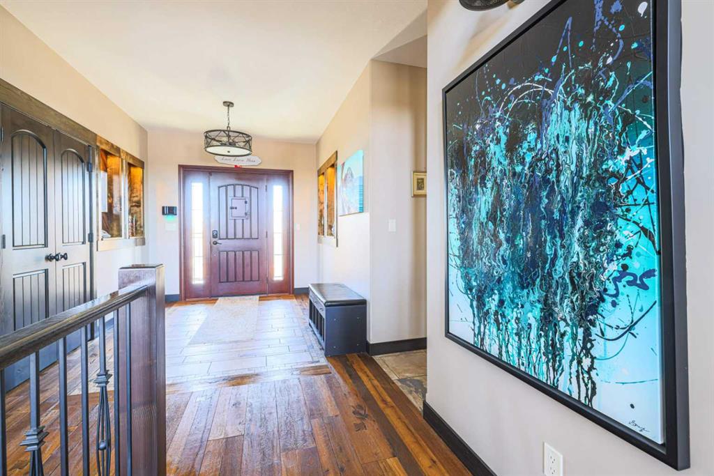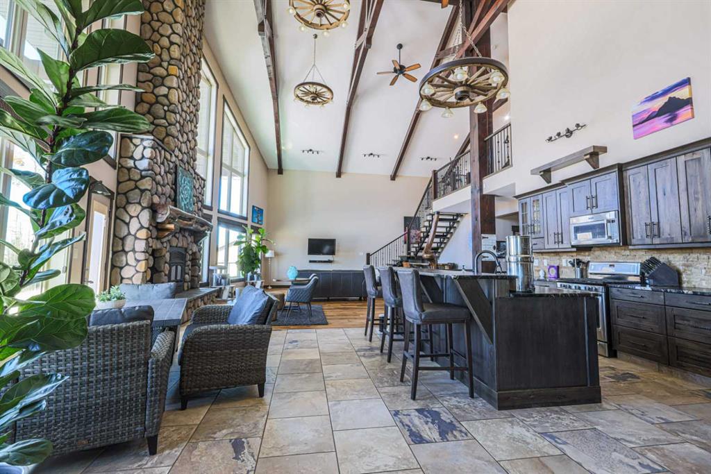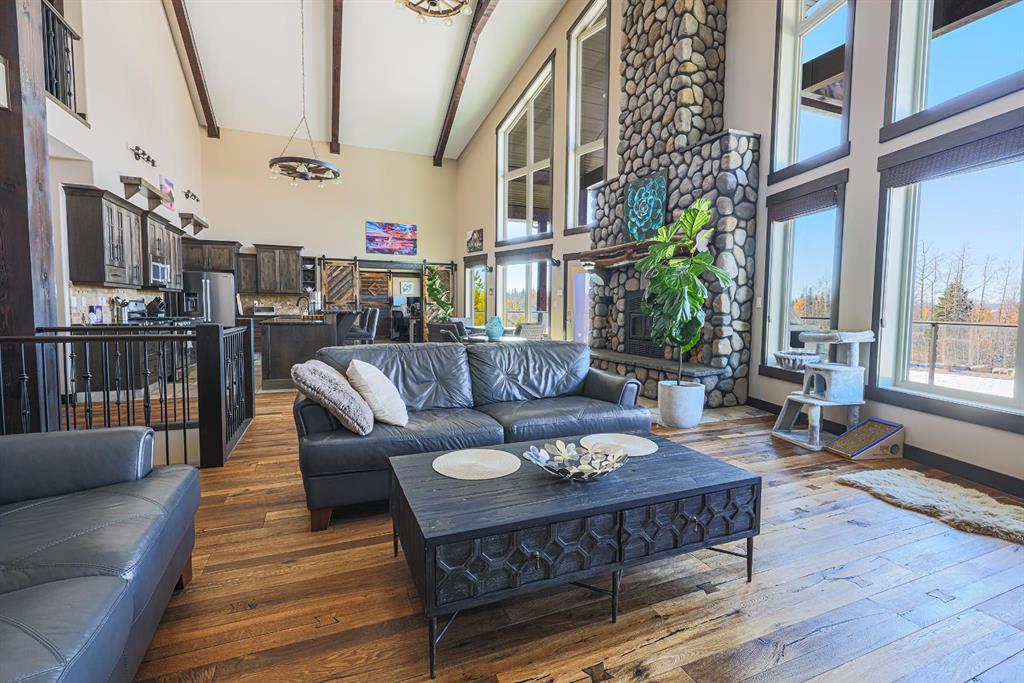 This custom built home offers acreage living at it's finest.. From the moment you enter you'll find many unique features from the open floor plan, wooden beams and a floor to ceiling rustic stone fireplace that makes you feel warm, cozy and glad to be home. Natural light pours in from floor to ceiling where you can enjoy the sunset in your living room or downstairs in the extra large hot tub. There is a self contained one bedroom unit with all appliances including washer and dryer and a separate entry in the walk out basement. Quality abounds in this stylish home featuring leather granite counter tops, reclaimed hardwood and ceramic tiled flooring, interior walls insulated for sound barrier, in-floor heating, custom designed bar with wood detailing, Fir Timber Frame design and so much more. This home really needs to be seen to be truly appreciate the craftmanship throughout. The large workshop(46'X54') has in-floor heating, a mezzanine for additional storage, 14' doors and a full piece bath that includes a washer/dryer. This professionally landscaped property with a quiet parklike setting and beautiful mountain views has something to offer every family.