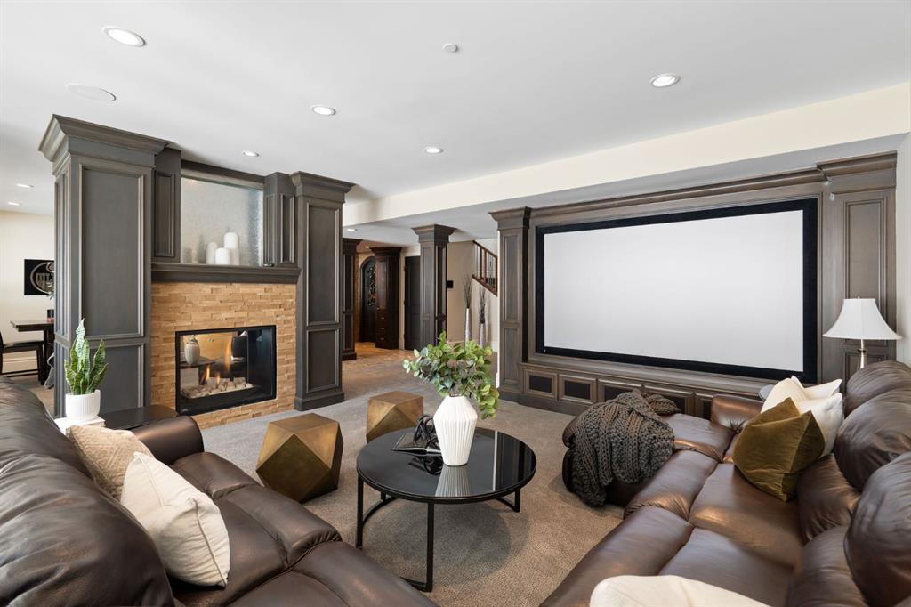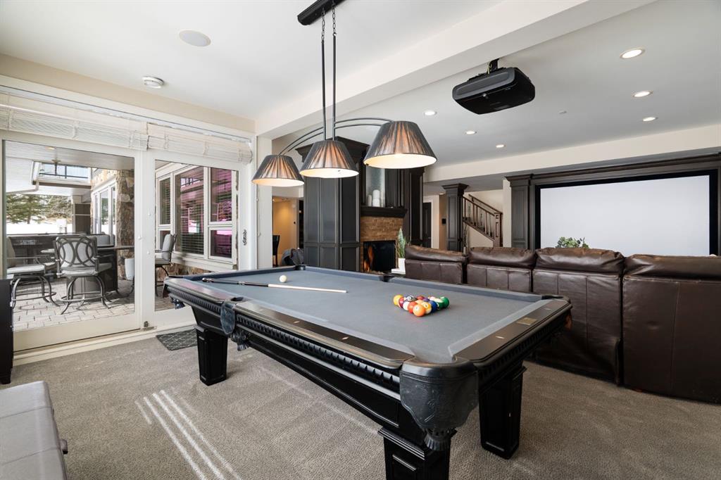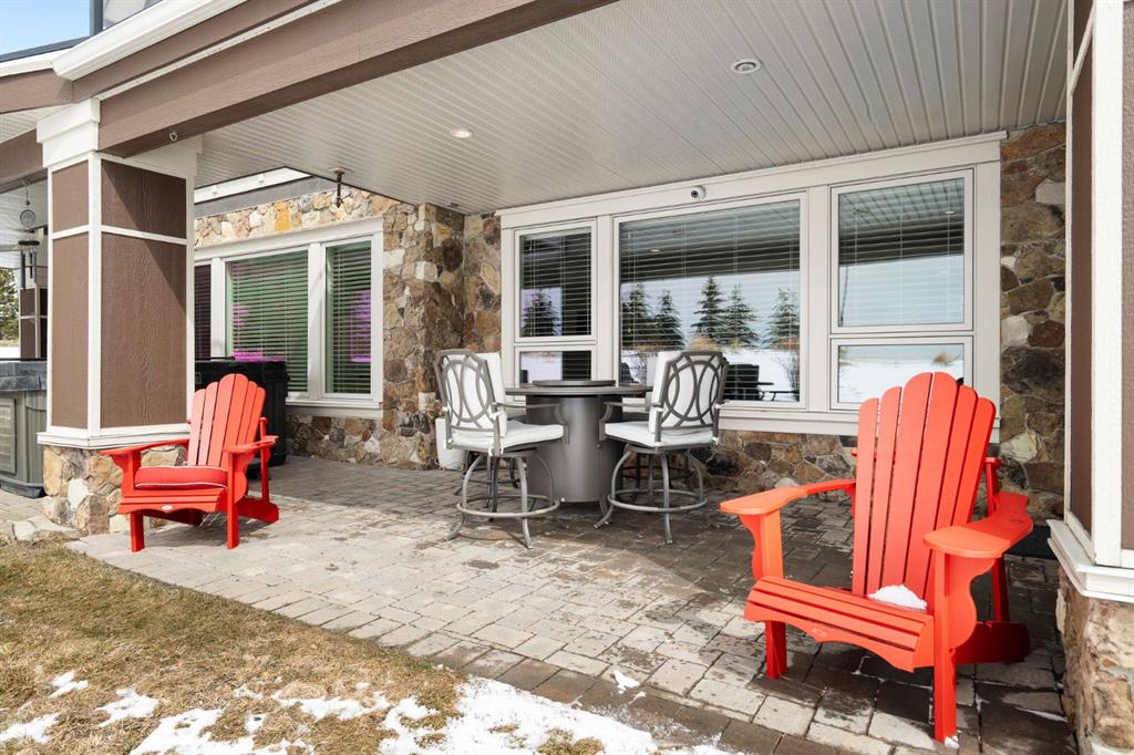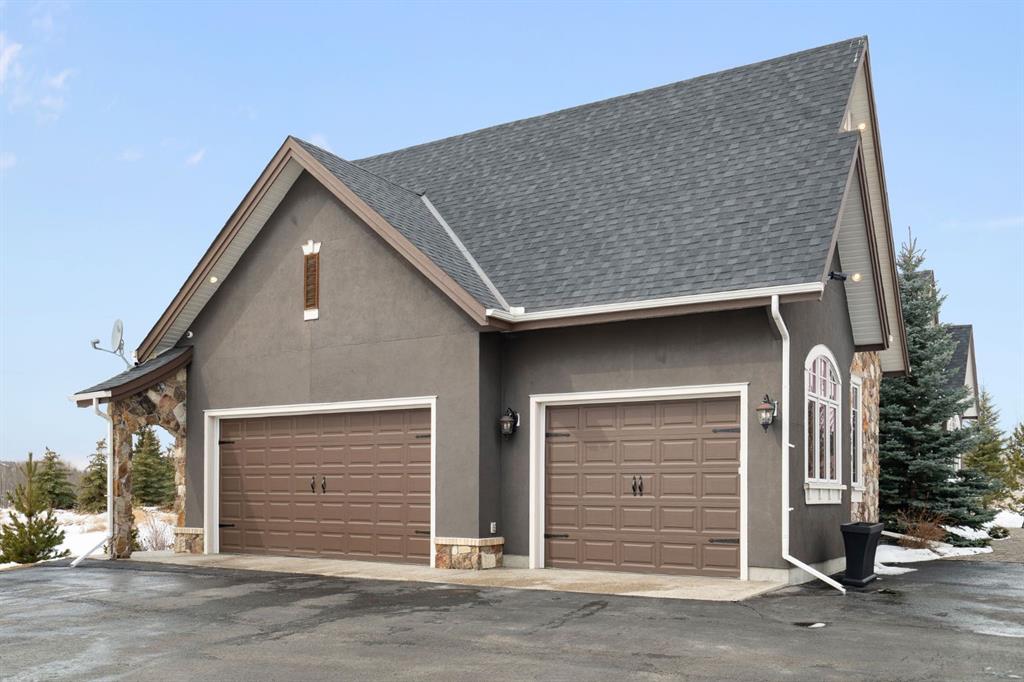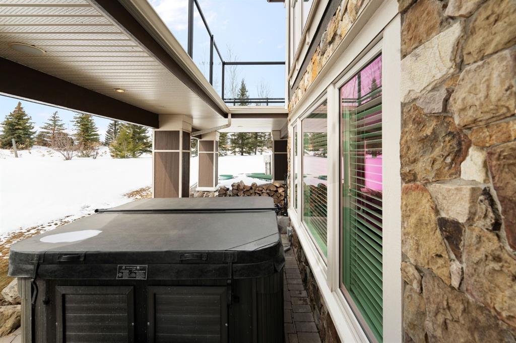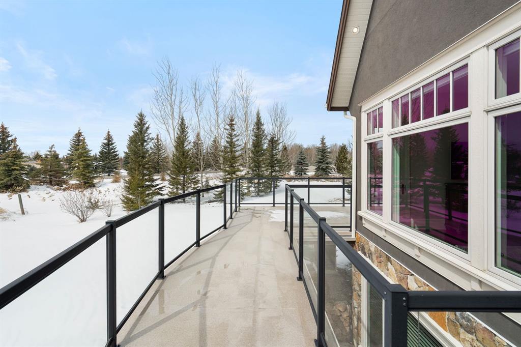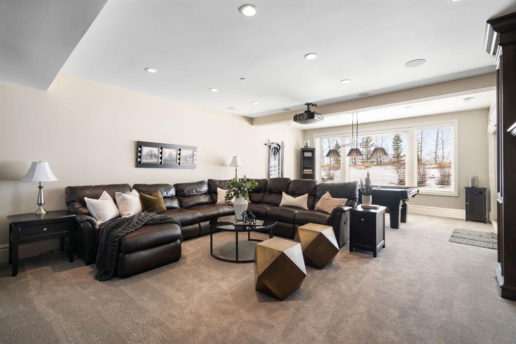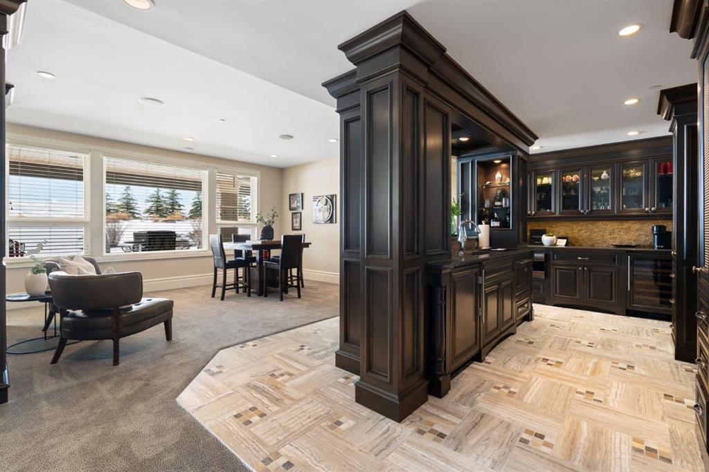 Set within the Willow Creek enclave of Bearspaw, just a 7-minute drive to Calgary city limits, this 4,700 sq. ft. BUNGALOW welcomes you with a gated stone entry surrounded by mature, professionally landscaped grounds. Built in 2010 by Astoria Homes this previous showhome’s exterior architecture blends stone and brick with sculpted rooflines, while the interior features 12-foot ceilings, detailed millwork, and principal rooms oriented toward stunning MOUNTAIN VIEWS. The foyer showcases stone inlay set into hickory hardwood flooring, immediately reflecting the CRAFTSMANSHIP found throughout the home. A private office with bespoke built-ins and a leather-paneled coffered ceiling creates a refined, executive atmosphere. A fully integrated smart home Control4 system ensures seamless functionality. The main living area is anchored by a striking double-sided stone fireplace and soaring windows. Designed for entertaining, the kitchen centres around an oversized GRANITE island and features a full professional appliance package: Sub-Zero, Wolf, Miele brands including a built-in espresso machine. The kitchen boasts a dedicated wine service area offering seamless hosting to the bright dining space that opens onto a southwest-facing terrace, extending the living area outdoors. The laundry room is a retreat, including a statement island. The spacious primary suite offers private outdoor access and a luxurious ensuite with heated surfaces, a sculptural tub, and a multi-jet shower accented with marble tile detailing. A custom dressing room with pull-down rods adds both convenience and elegance, while marble tile and in-mirror televisions elevate the space. The walk-out lower level is designed for leisure and entertainment, featuring a theatre with a 4K PROJECTOR and full sound system, a billiards area, a fireplace lounge, a custom wet bar complete with microwave, dishwasher, and dedicated wine and beer refrigeration, a fitness room, and two additional bedrooms with a full bathroom. Thoughtfully positioned behind the bar is a WINE ROOM, ideal for the avid collector. Unique features such as inlaid countertop televisions and a steam bath further enhance the home’s luxury. Stepping out onto the back patio, you are welcomed by several spaces for relaxing either in the HOT TUB, down the hill to a fire pit area or up on the upper decks that overlook the landscaped yard. For maximum enjoyment of the beautiful native plants and trees the property has lawn and flower bed irrigation. The oversized 3-car garage with lots of overhead storage capacity also has a “man cave” with custom built-in cabinetry and TV and a private urinal. Recent upgrades include a newly redone driveway, fresh exterior paint, a Culligan WATER SYSTEM, full attic insulation, updated basement carpeting, and both electric and hydronic in-floor heating. This residence represents a rare combination of thoughtful design, high-end finishes, and advanced infrastructure in one of Bearspaw’s most established acreage communities.